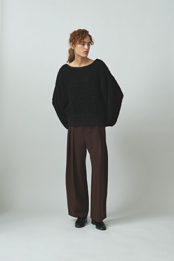 甘さとモードを両立する、大人のニット。 ふんわりとした肌ざわりと上品なぬくもりを備えた、フェザーヤーンのプルオーバー。リブ部分には別糸でラメを織り込み、主張しすぎない華やかさをひとさじ。柔らかな素材とほどよいボリューム感が今の気分にフィットしながら、ルーズすぎない洗練されたバランスに仕上げました。 素材の持つ質感を活かすなら、合わせるボトムは光沢感のあるスカートやメタリックなパンツでコントラストを効かせて。足元はヒールで縦ラインを引き締め、アクセサリーは繊細なものを一点だけ。甘さに頼らず、奥行きのある大人のスタイルが完成します。 “やさしさ”も“強さ”も内包した、今の気分に寄り添うニットです。 ●フェザーヤーンとは 羽毛のようにふわふわとした長い毛足が特徴の糸。