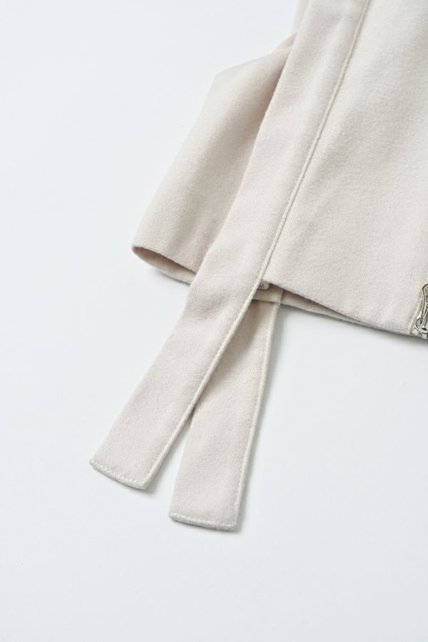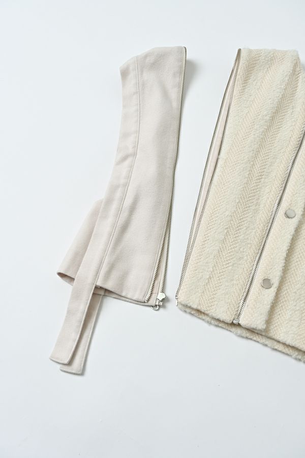 新バランスで魅せる、構築ツイードベスト。 クラシックなツイードに、メタルファスナーの無機質なシャープさを掛け合わせたアイテム。素材のコントラストが洗練された緊張感を生み出し、シンプルなスタイリングにひとさじの強さを与えます。 肩や身頃の立体的なフォルムが構築的なシルエットを生み、今季らしいモード感を演出し、着るだけでスタイルの輪郭を引き締めてくれる一枚。タートルネックやシャツとのレイヤードで袖にニュアンスを加えれば、さらに奥行きのある印象に。ワイドパンツやAラインスカートを合わせて重心を整え、モダンで都会的なバランスに仕上げるのがおすすめ。定番に甘んじない、スタイルに“エッジ”を効かせるベストです。●ウールツィード切替ハーフパンツ(25233-9732E)とセットアップ可