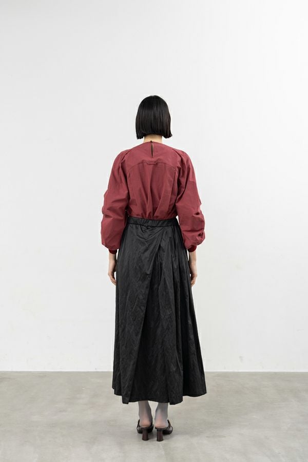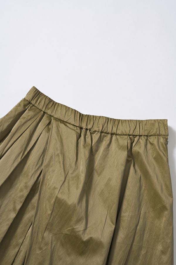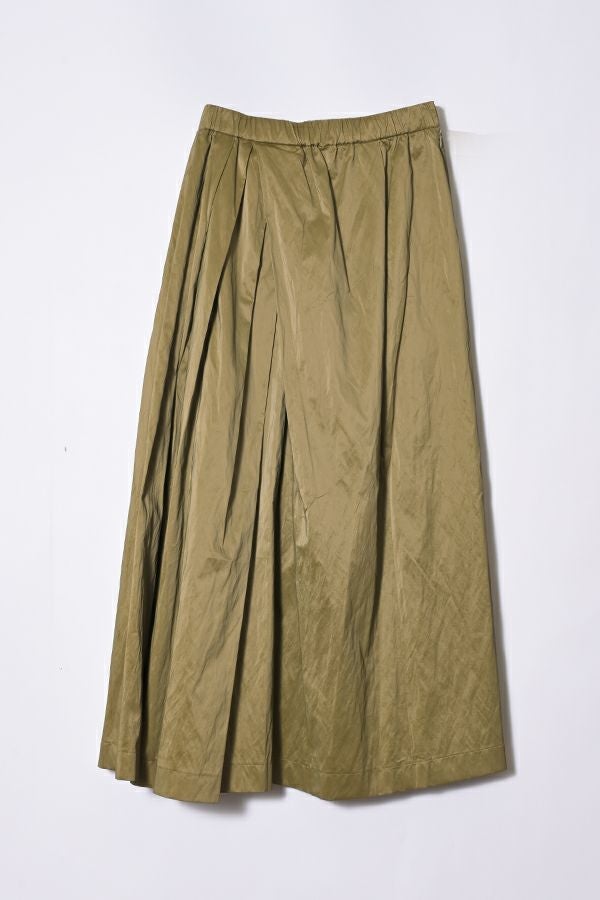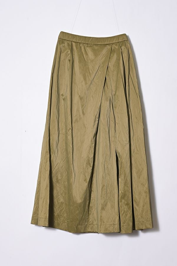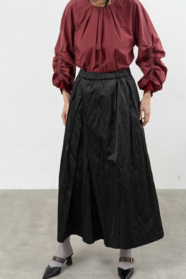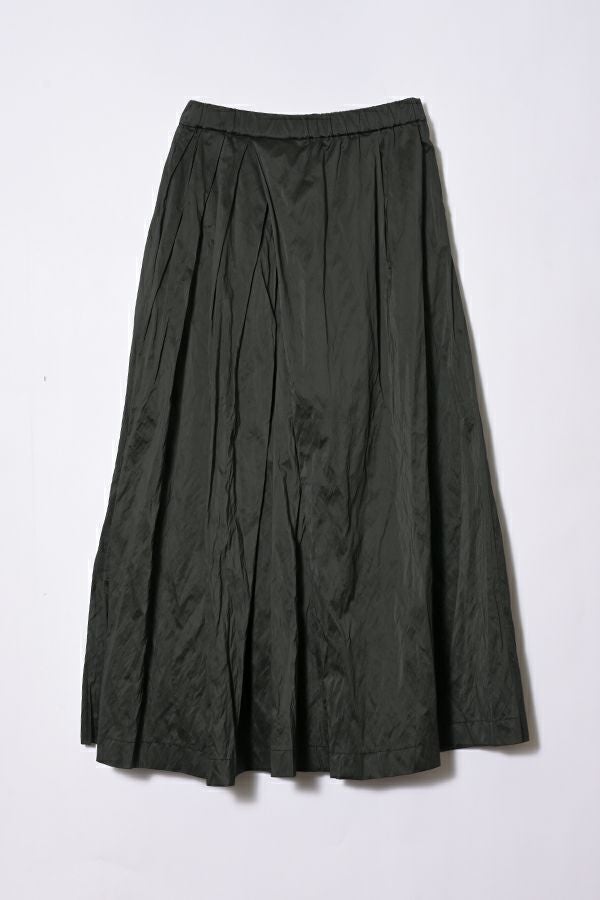 アシンメトリーにタックを施した特徴的なスカートです。 生地に金属糸が織り込まれている為、形状記憶になっており張りのあるシルエットをキープできます。見た目より軽く、シワが目立ちにくいというメリットも! 個性的でチャレンジングなアイテムをお探しの方にはぜひおすすめしたい商品です。ALLブラックでモード感のあるコーディネートもおすすめです。カジュアルにロンTEEやデニムパンツと合わせてもトレンドを掴んだ独創的なスタイリングに!