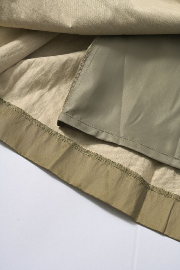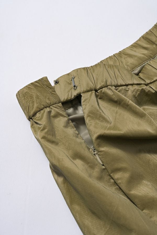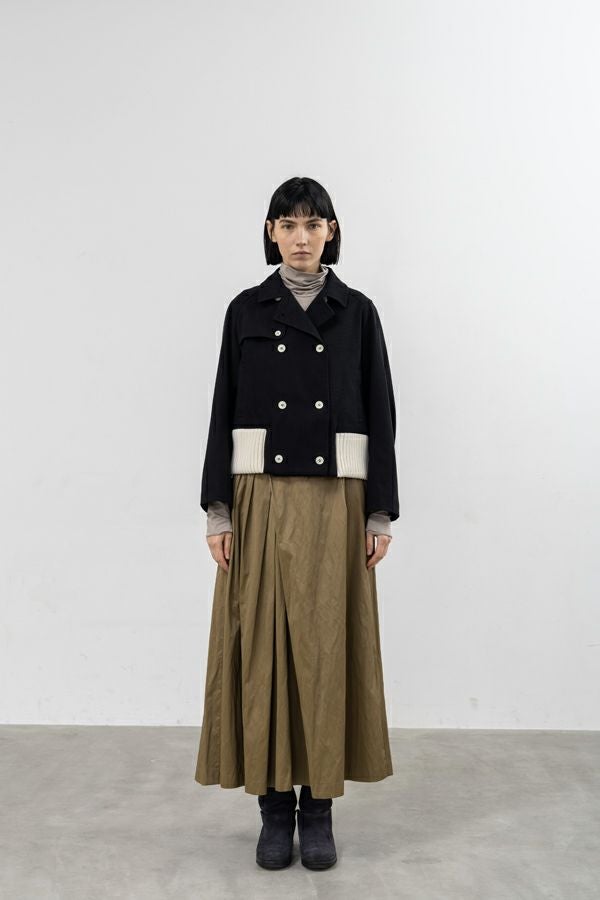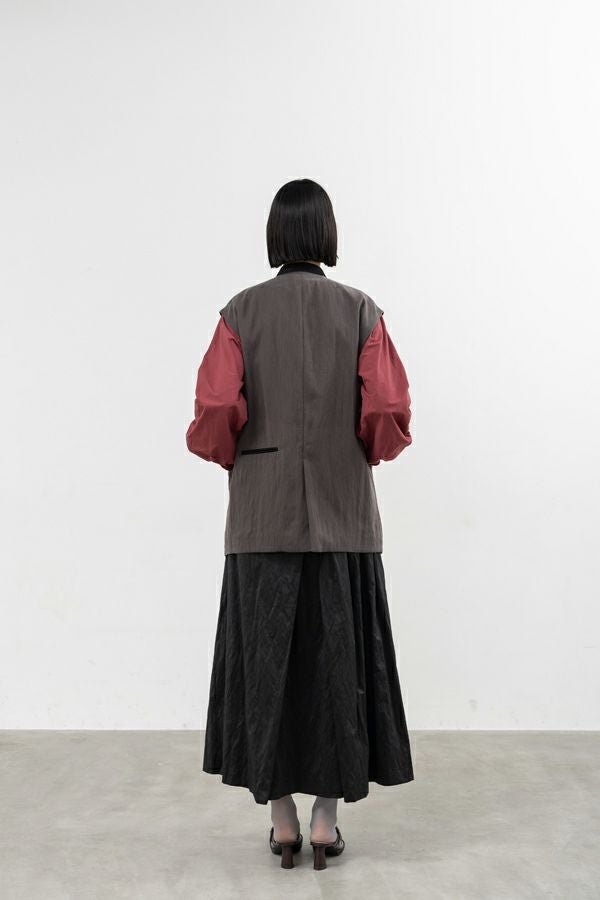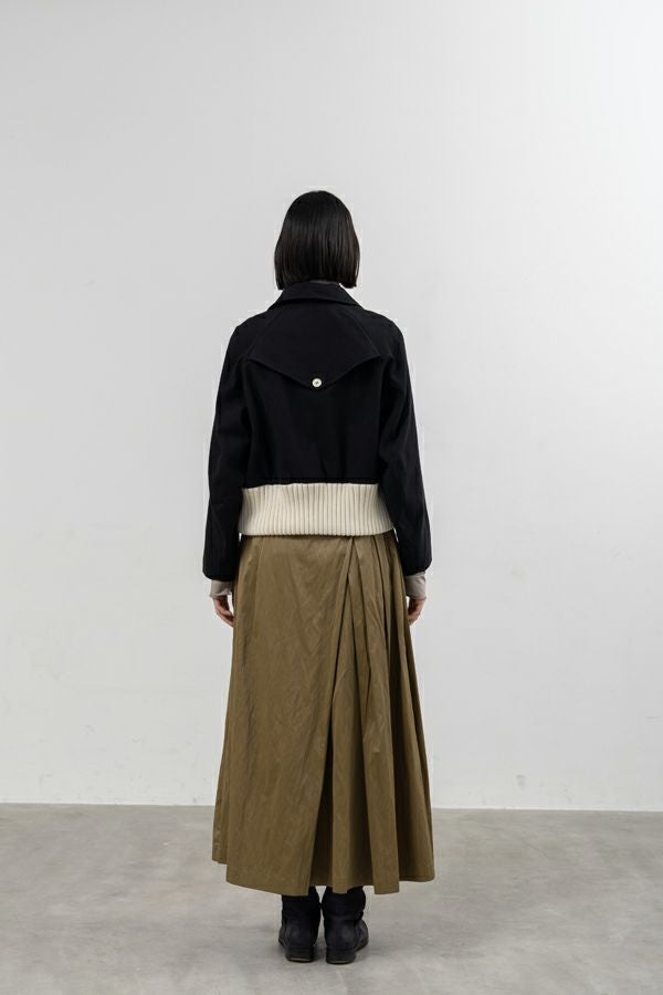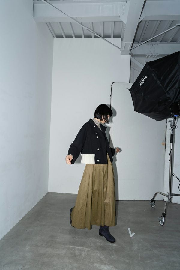 アシンメトリーにタックを施した特徴的なスカートです。 生地に金属糸が織り込まれている為、形状記憶になっており張りのあるシルエットをキープできます。見た目より軽く、シワが目立ちにくいというメリットも! 個性的でチャレンジングなアイテムをお探しの方にはぜひおすすめしたい商品です。ALLブラックでモード感のあるコーディネートもおすすめです。カジュアルにロンTEEやデニムパンツと合わせてもトレンドを掴んだ独創的なスタイリングに!