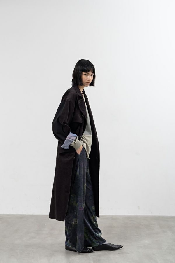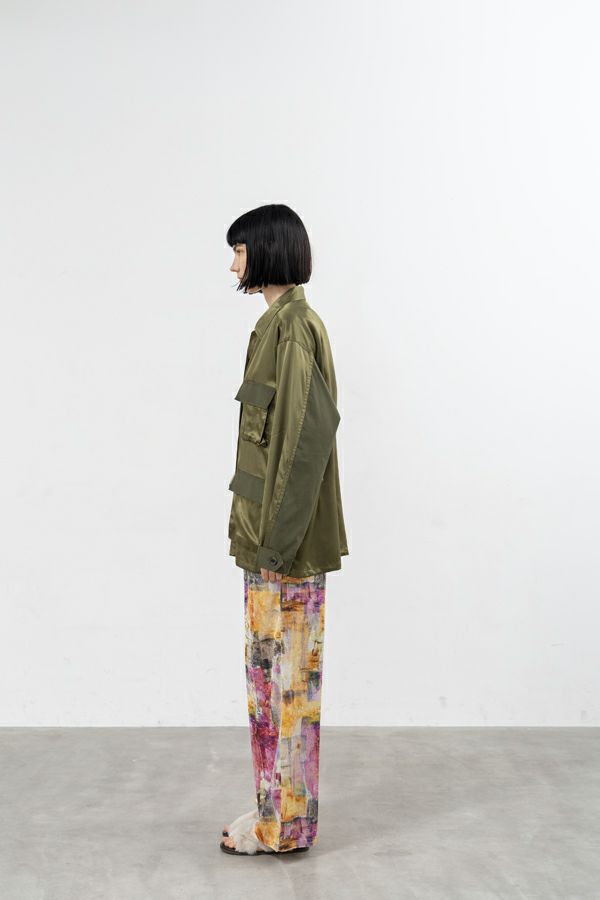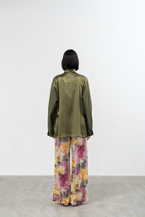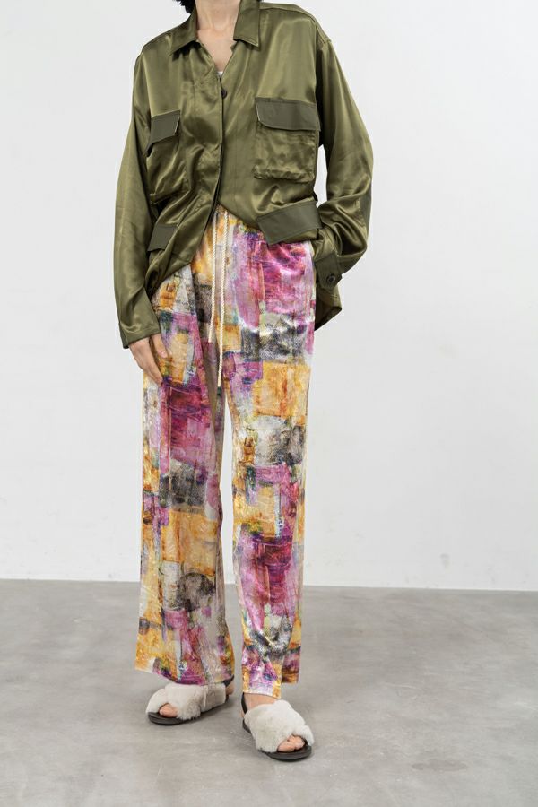 インパクトがありながら洗練された印象のプリントパンツ。 ANGELINAオリジナルのキャンバス柄を大胆な色合いで、テロっと落ち感のあるベロア生地にプリントしました。ムードあるブラックはモード感を出してくれます。 奇抜なイエローピンクは一気にコーディネートの顔となる一着に! ワイドストレートシルエットで、ウエストはゴム仕様+コード付きでサイズ調整可能なイージーパンツです。 ワンピースやスカートとレイヤードさせ、裾からチラ見せするだけでワンランクUPのスタイリングに。