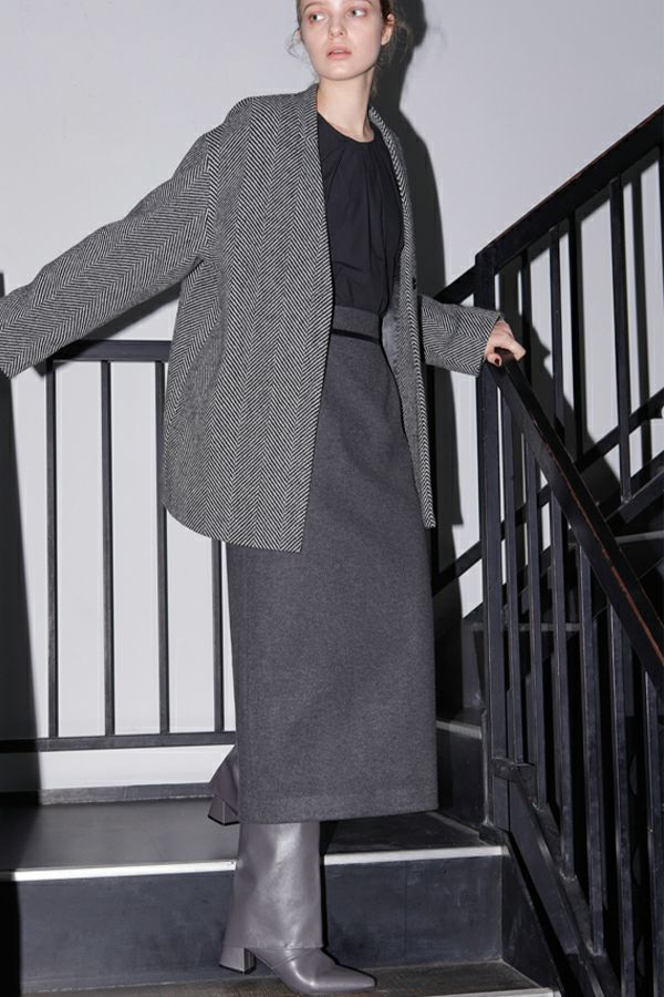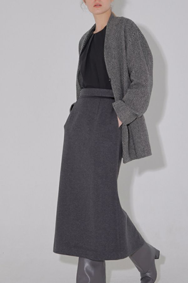 ウールタッチの大人かっこいいタイトスカート。 リアルなウールの風合いを表現したストレッチジャージー素材を使用。 ①軽くてストレッチが効いているので動きやすい ②シワになりにくい ③家庭でお洗濯もできる とても扱いやすいのが特徴です。 ウエスト切替え部分は高級感のある光沢でレザーライクな素材でアクセントを。 シンプルなデザインですのでコーディネートもしやすく、ON/OFFどちらのシーンでも巾広くお使いいただけます。 ●同素材のショートコクーンプルオーバー(24233-1823Y)とセットアップも可(着用の際はトップスの前裾をインしたスタイリングがオススメ。) ●日本製