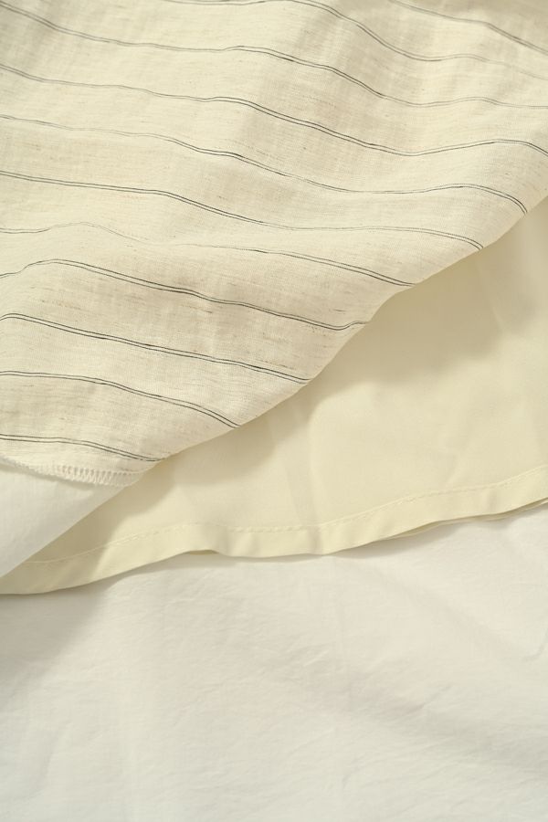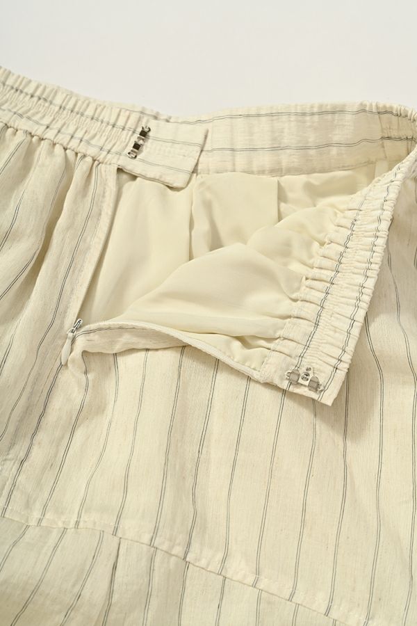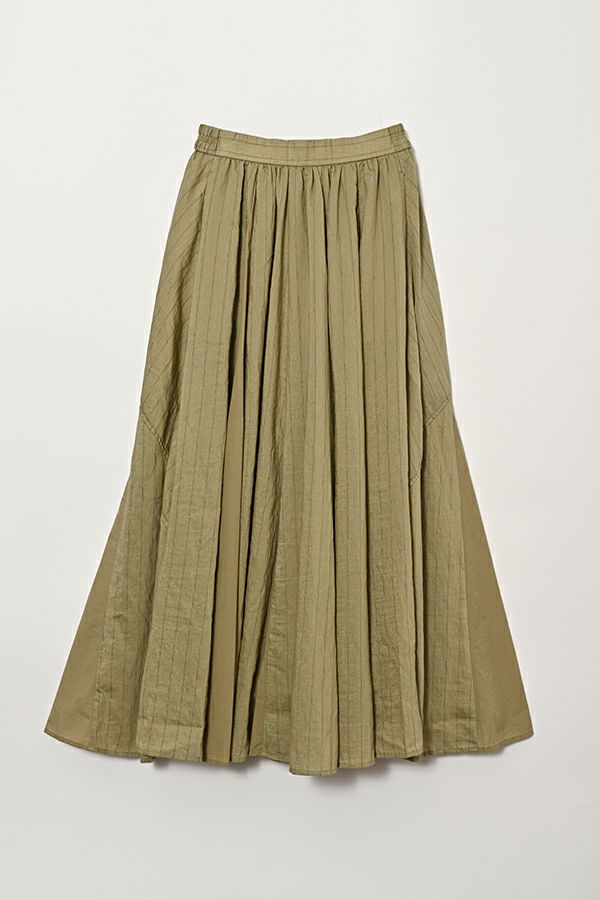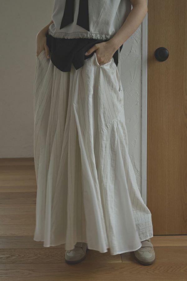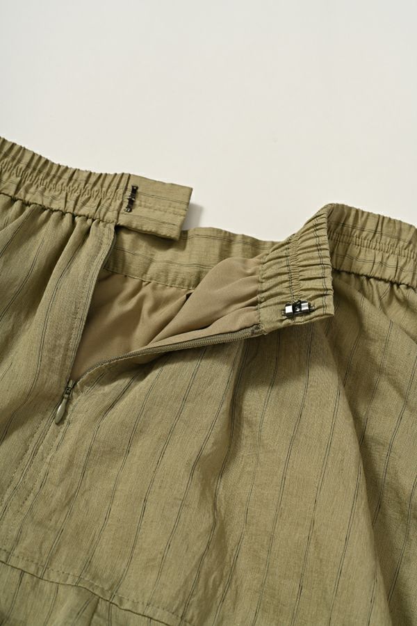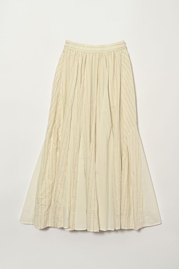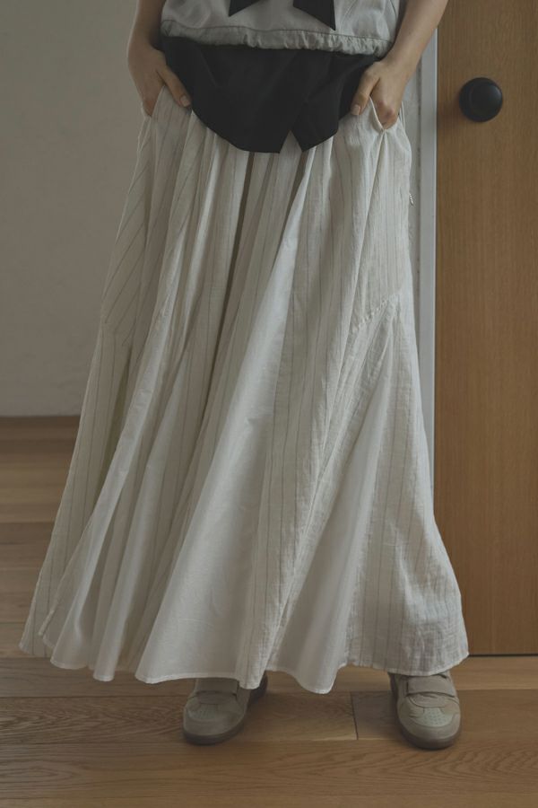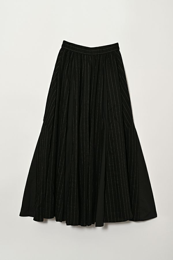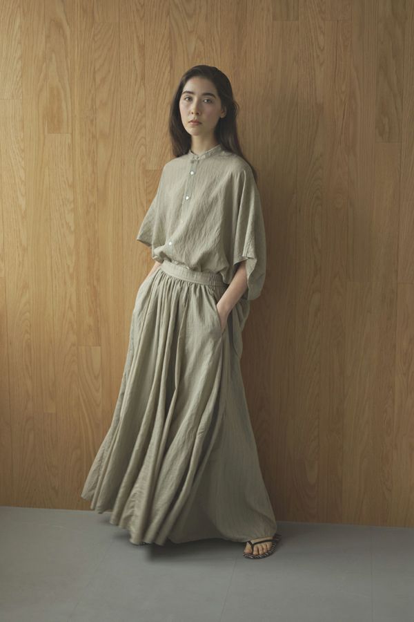 存在感抜群のボリュームで映えで確定、大人の雰囲気溢れるギャザースカート。 昨年に大好評のギャザースカートにストライプバージョンが登場です。 マチの部分は無地の素材を使用し、より表情が出るデザインとなりました。前ウエストはテンション(伸縮性)無しのため スッキリきれい見えし、後ろウエストにはしっかりゴムを入れアジャストも利くように仕上げています。 同素材のストライプポンチョシャツ(25163-4309P)とセットアップ着用でコンビネゾン見えにもなります。セットアップ着用もおすすめですが、Tシャツ合わせのカジュアルスタイルも良いですし、オケージョンスタイルでジャケットコーディネートなどマルチに活用できるスカートです。 ●手洗い可 ●同素材のストライプポンチョシャツ(25163-4309P)とセットアップ可