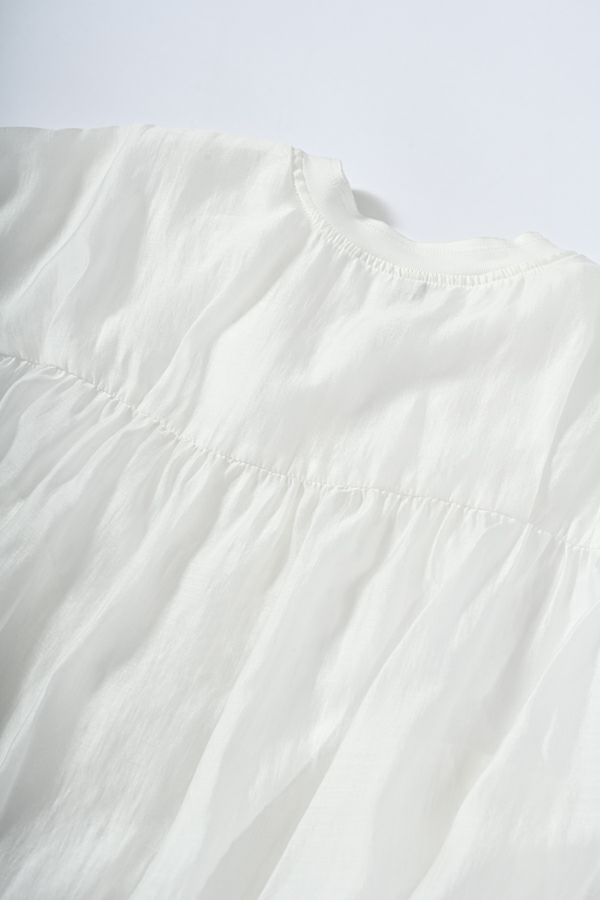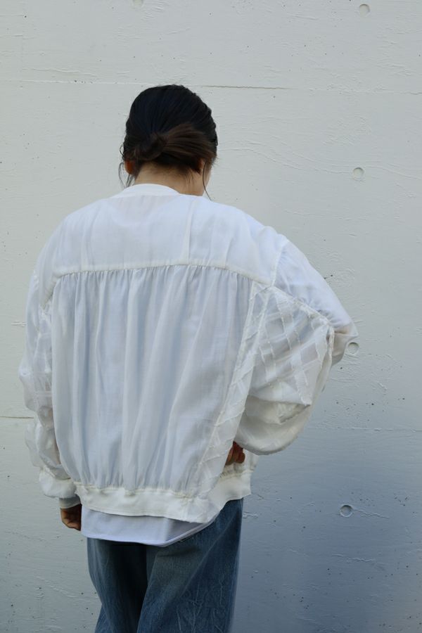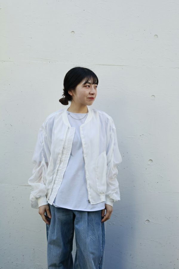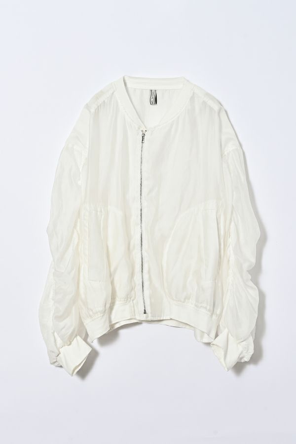 小ワザの効いた、大人が着映えるシアーギャザーブルゾン。 レーヨンの上品な艶感のシアー素材は軽く、嵩張らないので持ち運びにも便利です。気温変化にも対応でき、日除け・冷房対策として大人女子のデイリーアイテムに活躍すること間違いなし。 ウエストに巻いたり、たすき掛けにして着用したり、とスタイリングの変化も楽しめます。袖下と身頃の脇部分はトレンドのチェック柄をカットジャガードにして表情をプラス。中心からズラしたライダース風のファスナーもデザインアクセントに。 夏の羽織りものとして使っていただくのはもちろん、タンクトップの上にファスナーを上まで閉めてプルオーバー間隔で着用頂いても◎ボトムのシルエットを選ばず合わせられる万能アイテムです。