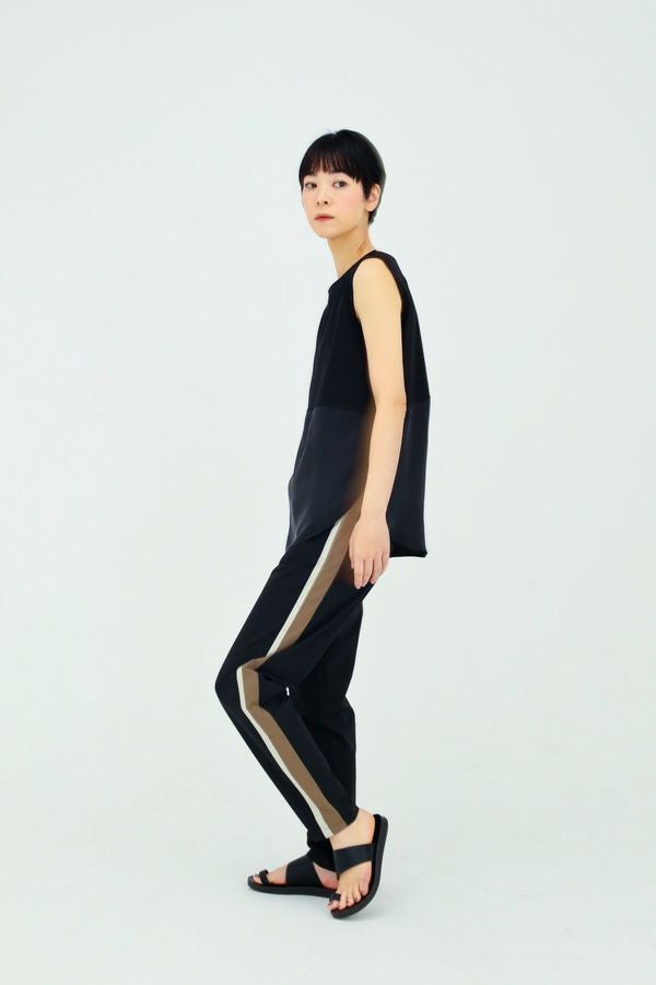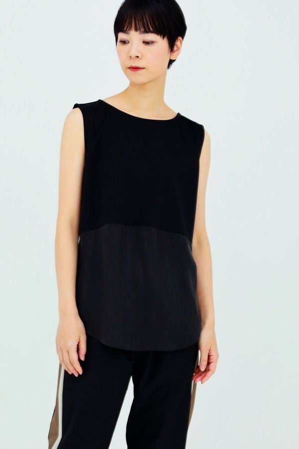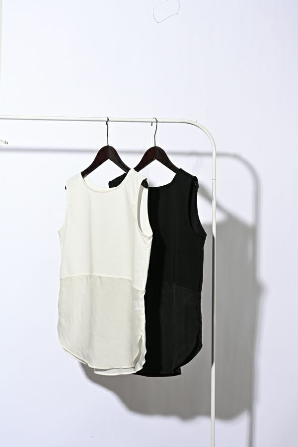 人気のあったロングスリーブのノースリーブVer.。 しっかりした肉感のポンチと上質なハリと上品な光沢感を持ったキュプラの素材をドッキングさせました。きれい見えするのでオケージョンにも着用できる1枚です。