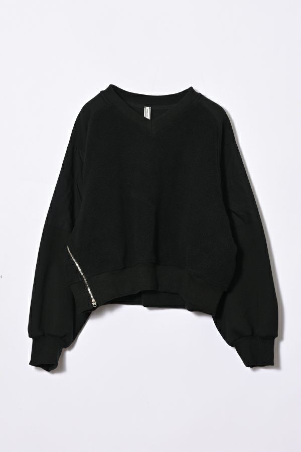 裾ファスナーでシルエット変化が楽しめるVネックプルオーバー。 片面をボア起毛させた素材を裏表で使用。身頃は内側にフラット面を使い インナーとのもたつきを解消した作りに。袖は内側に起毛面を使い 肌触りが心地よく暖かいアイテムとなっています。 衿元のあきは、絶妙なバランスで上品な大人の女性らしさを表現。袖に重ねた別生地ディティールによってスポーティでメンズライクな印象をプラス。 右脇のファスナー付きのマチで裾巾を調整することができ、シルエット変化も楽しめるようになっています。ボトムスにはフェミニンなスカートなどを合わせてカジュアルになり過ぎない大人なスタイリングがおすすめです。