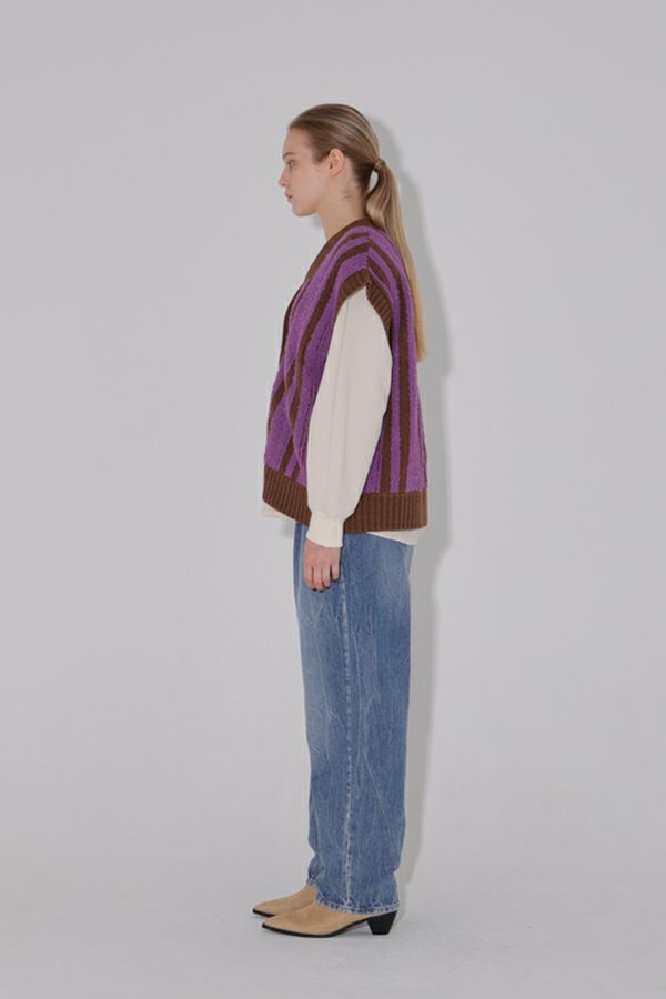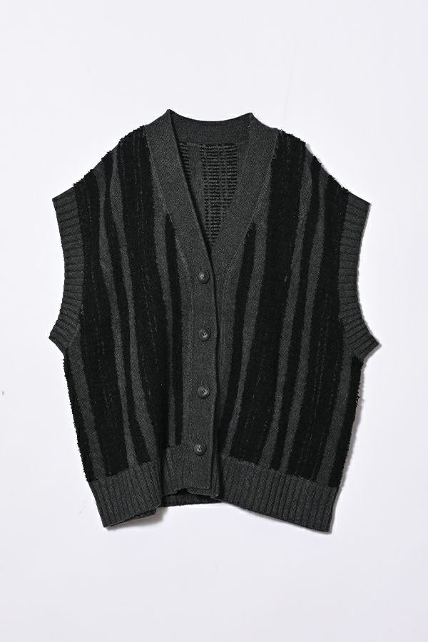 ファンシー糸を立体的に編み込んだ華やかなカラーリングが光るニットベスト。 モール糸(糸全体に直立した毛羽のある意匠糸のことです)を立体的に編み上げ、こなれ感がプラスされつつ、着ぶくれ見えしないようにストライプ柄にすることで縦見えの視覚効果を取り入れたアイテムです。 体のラインを拾いにくい、程よい厚みが着回し抜群のベスト。肌触りも柔らかく着心地が良いのも嬉しいです。デニムなどのカジュアルなアイテムにさらっと合わせるだけで遊び心あるカジュアルコーデに大活躍。 ストレート・テーパードシルエットのパンツを合わせたり、タイトスカートなどでも大人カジュアルをお楽しみいただけます。