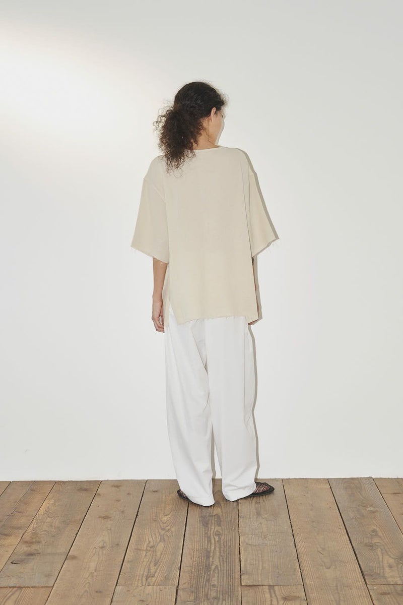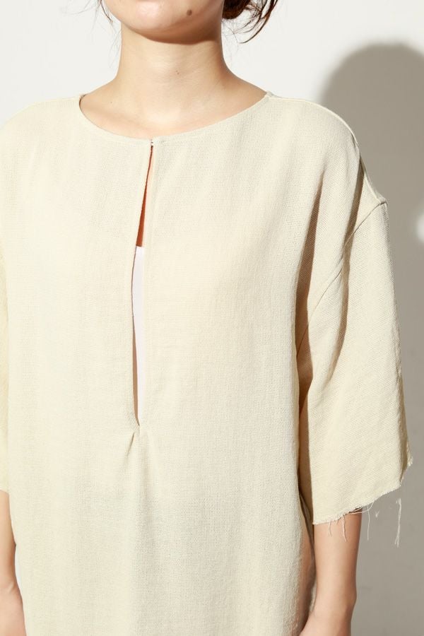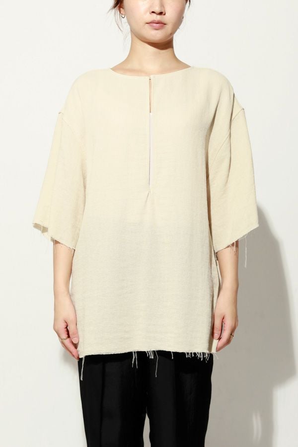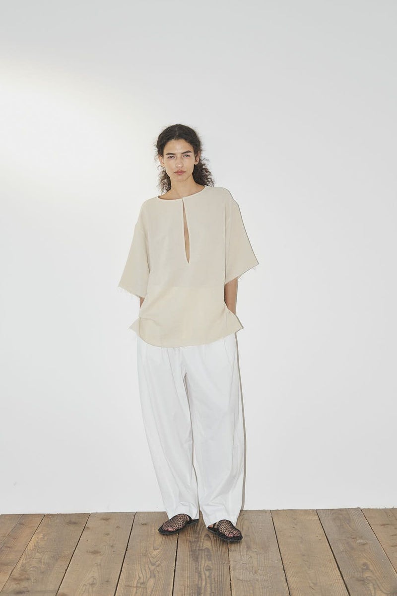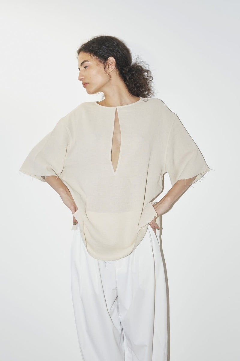 軽やかに、風を纏う。大人の洗練メッシュプルオーバー。 落ち感のあるメッシュ素材が生み出す、抜群の通気性。 フロントにあしらわれたスリットデザインが、着脱のしやすさと同時にモードな表情を添えます。 肌離れの良い軽やかな質感と程よいゆとりが、リラクシーでありながらも上品な印象を演出。 春夏の装いに欠かせない、大人のためのマストアイテムです。 インナーにはシンプルなタンクトップを合わせ、軽やかさをキープ。 フロントスリットをほんの少し開けてインナーを覗かせれば、自然な抜け感が生まれ、より洗練された着こなしに仕上がります。
