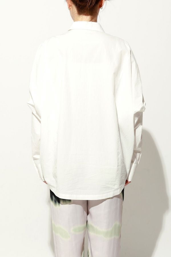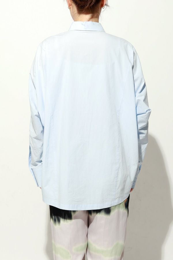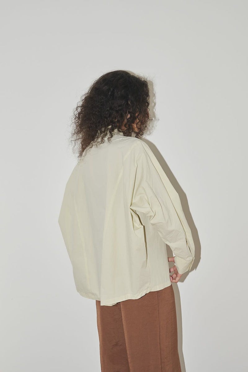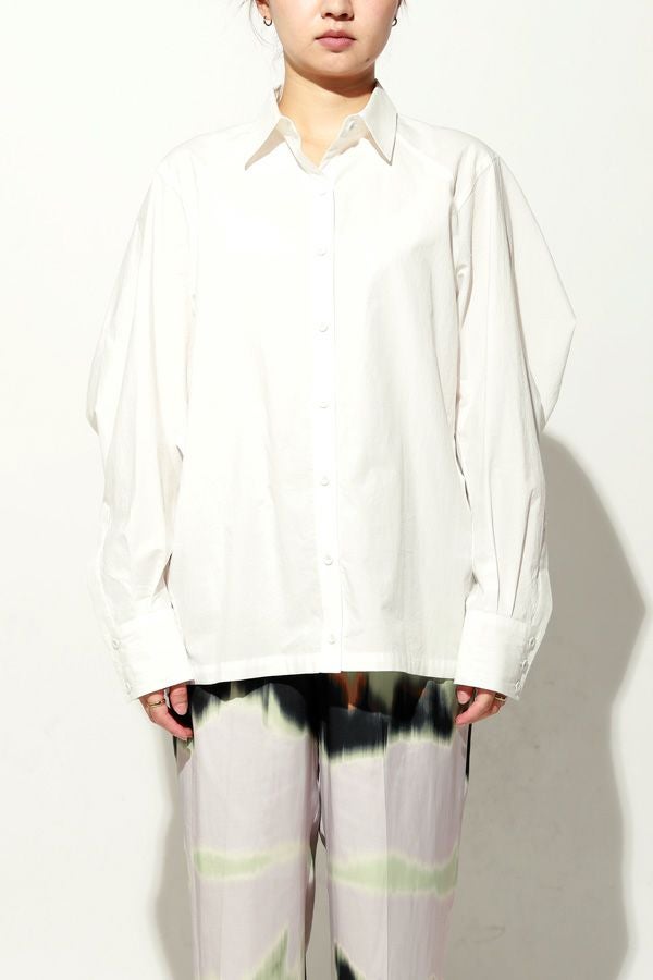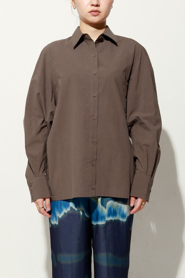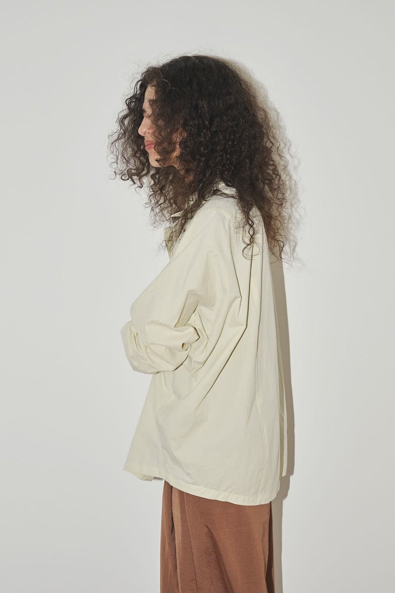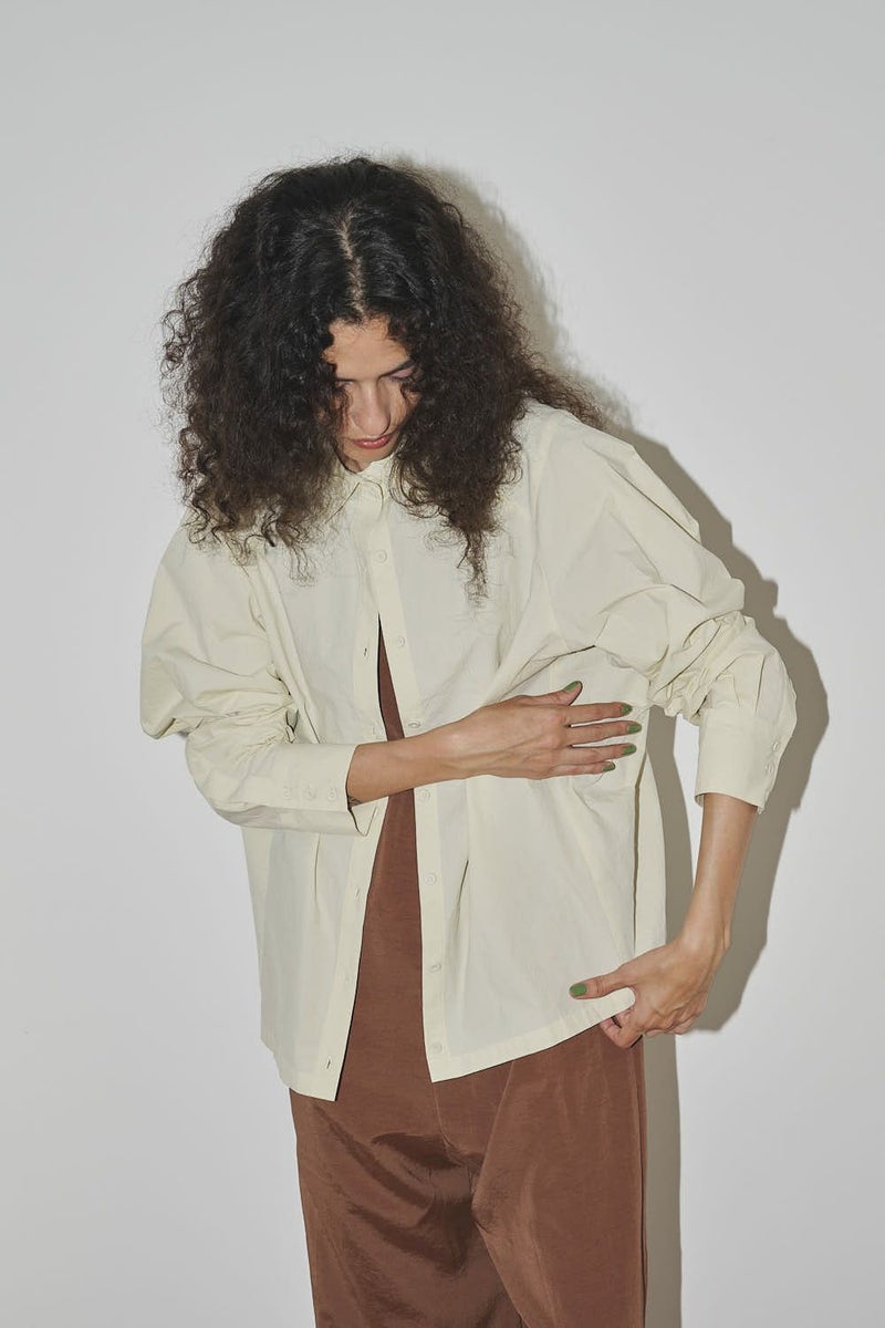 動きに美しくフィット。立体袖が魅せる大人の変形シャツ。 袖の立体設計により、腕の上げ下げや日常の動作もスムーズにこなせます。シボ感のある素材を用いているため、軽く羽織るだけでもシワが目立ちにくく、きれいな印象を長時間キープします。前後の丈差やアシンメトリーラインが生む表情が、シンプルながらも洗練された印象を演出。 ベストやジレを重ねれば、立体袖を活かした旬の着こなしが完成。ワイドパンツと合わせれば、立体感のあるシルエットで楽しむ大人カジュアルスタイルにも対応。日常からオフィス、お出掛けまで、幅広く活躍する万能シャツです。