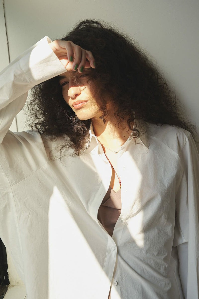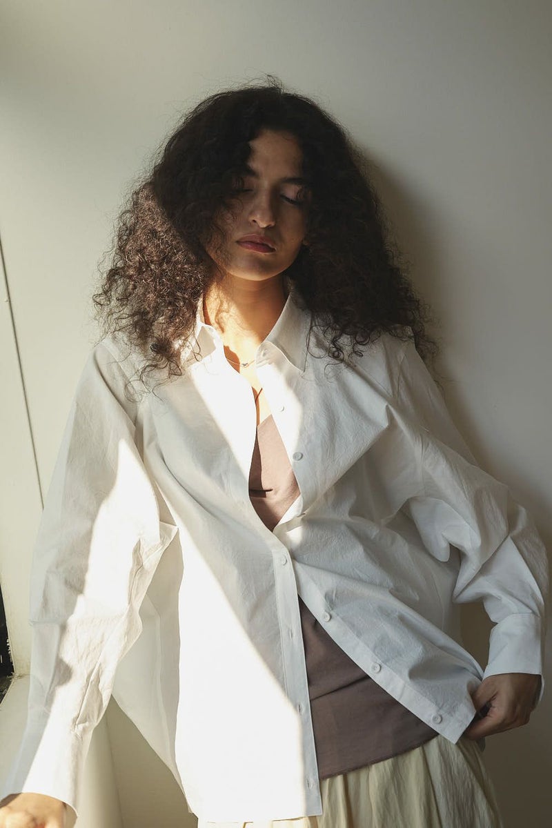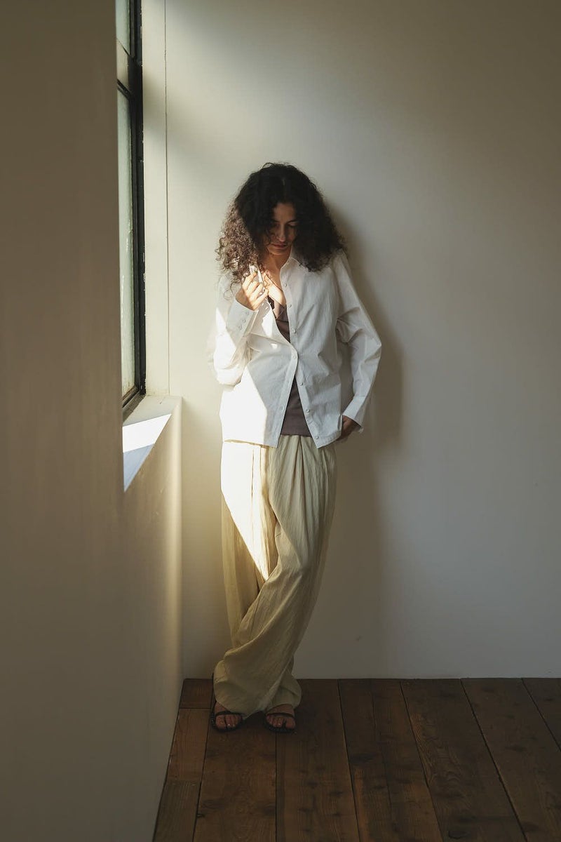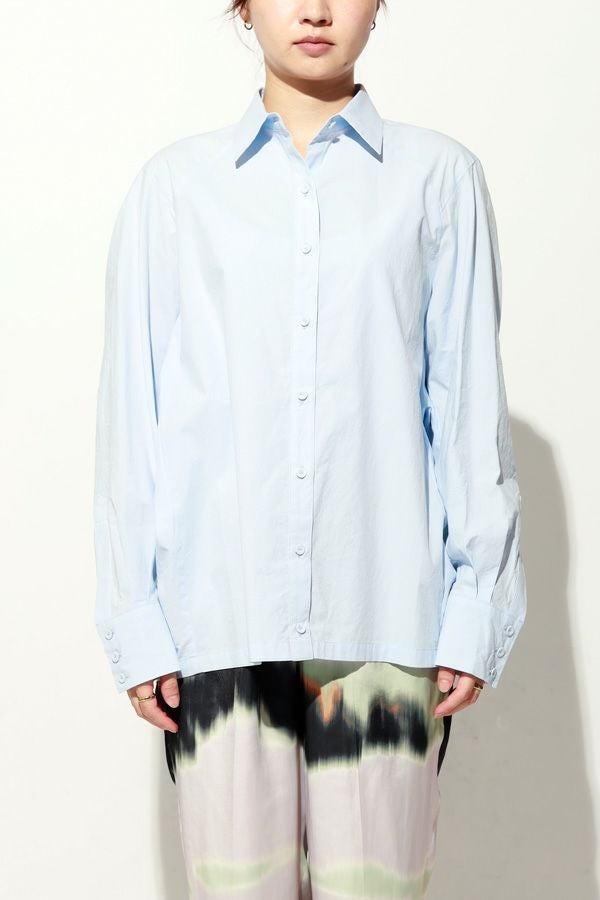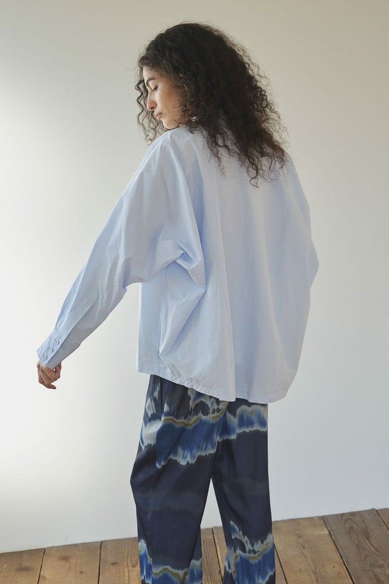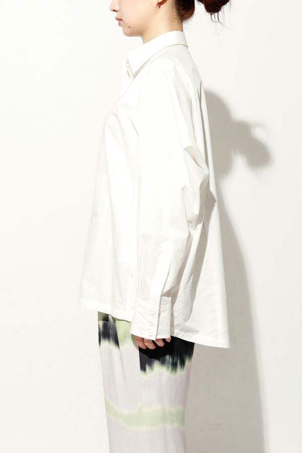 動きに美しくフィット。立体袖が魅せる大人の変形シャツ。 袖の立体設計により、腕の上げ下げや日常の動作もスムーズにこなせます。シボ感のある素材を用いているため、軽く羽織るだけでもシワが目立ちにくく、きれいな印象を長時間キープします。前後の丈差やアシンメトリーラインが生む表情が、シンプルながらも洗練された印象を演出。 ベストやジレを重ねれば、立体袖を活かした旬の着こなしが完成。ワイドパンツと合わせれば、立体感のあるシルエットで楽しむ大人カジュアルスタイルにも対応。日常からオフィス、お出掛けまで、幅広く活躍する万能シャツです。