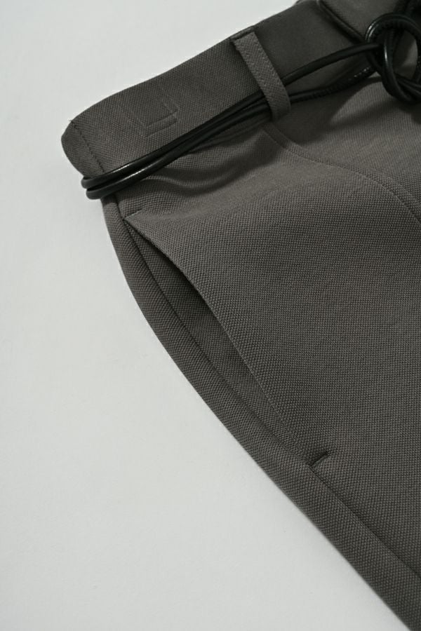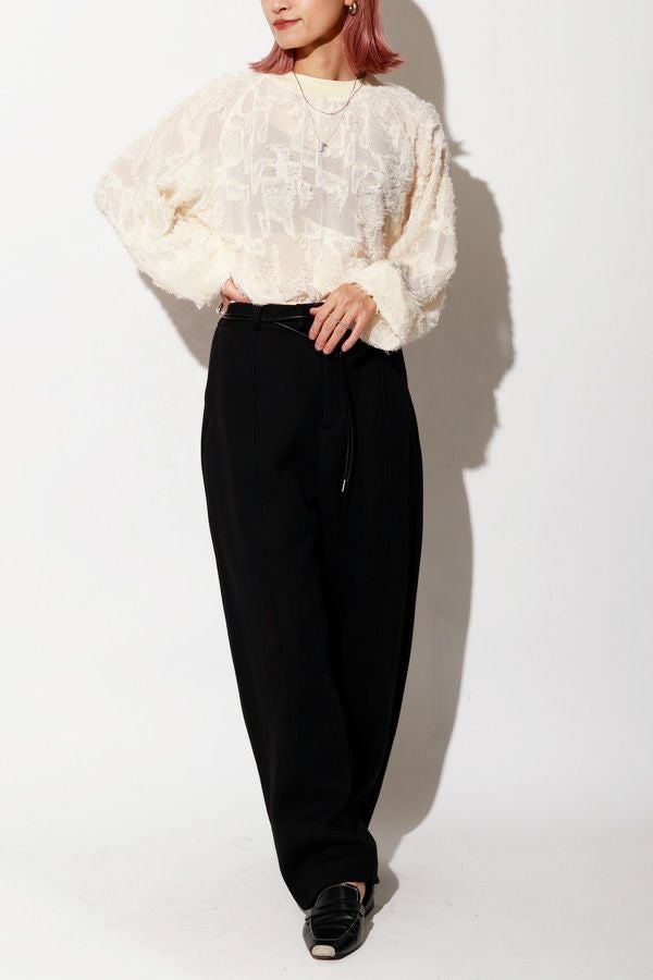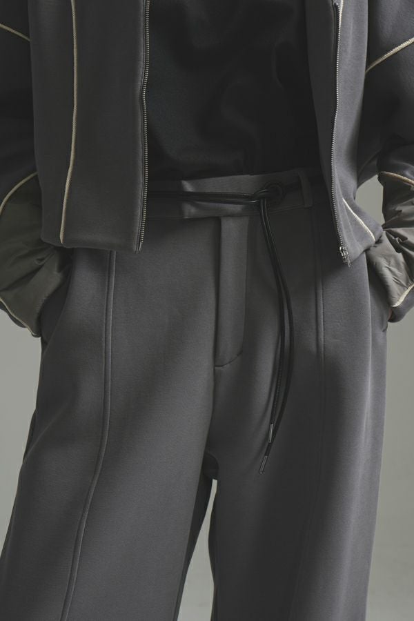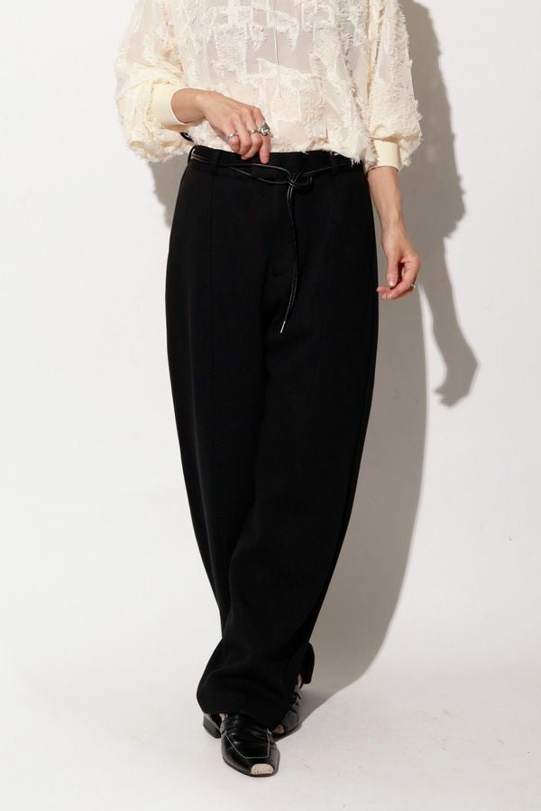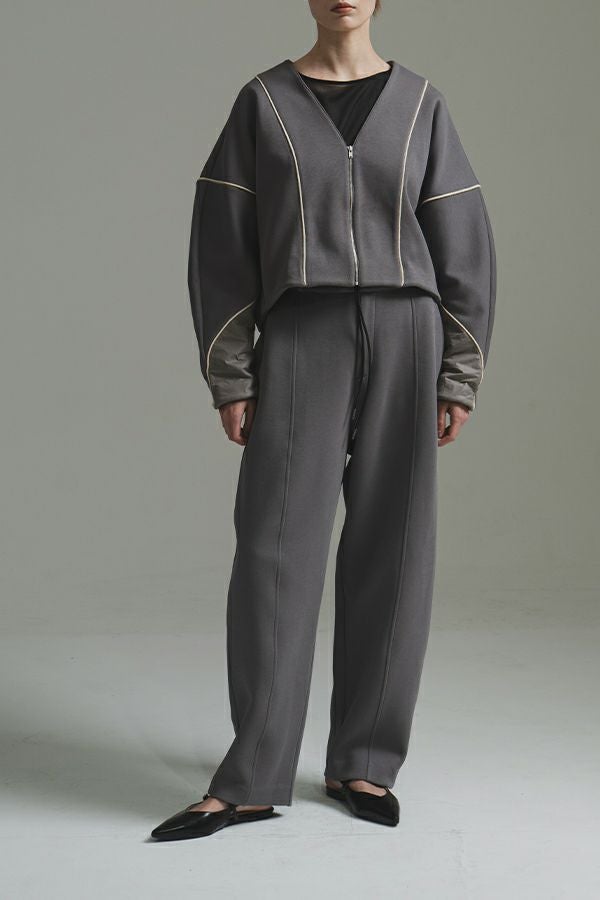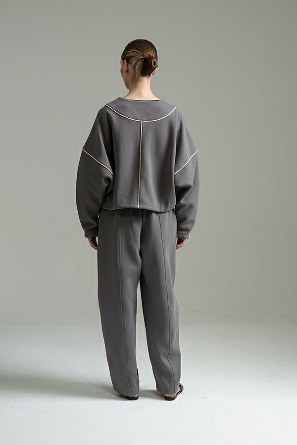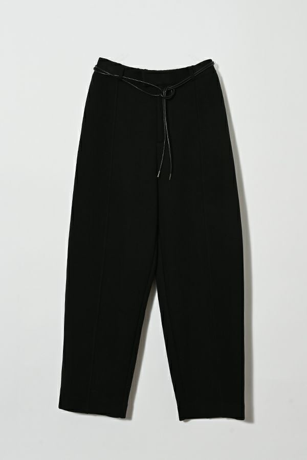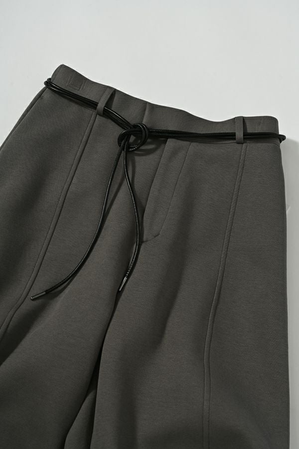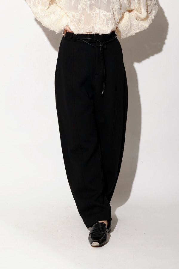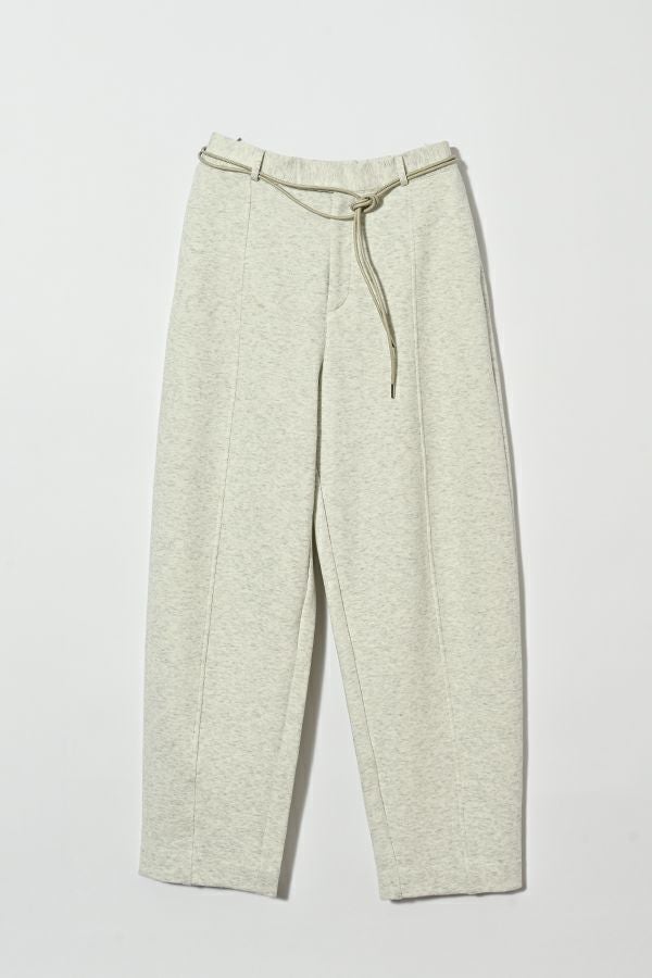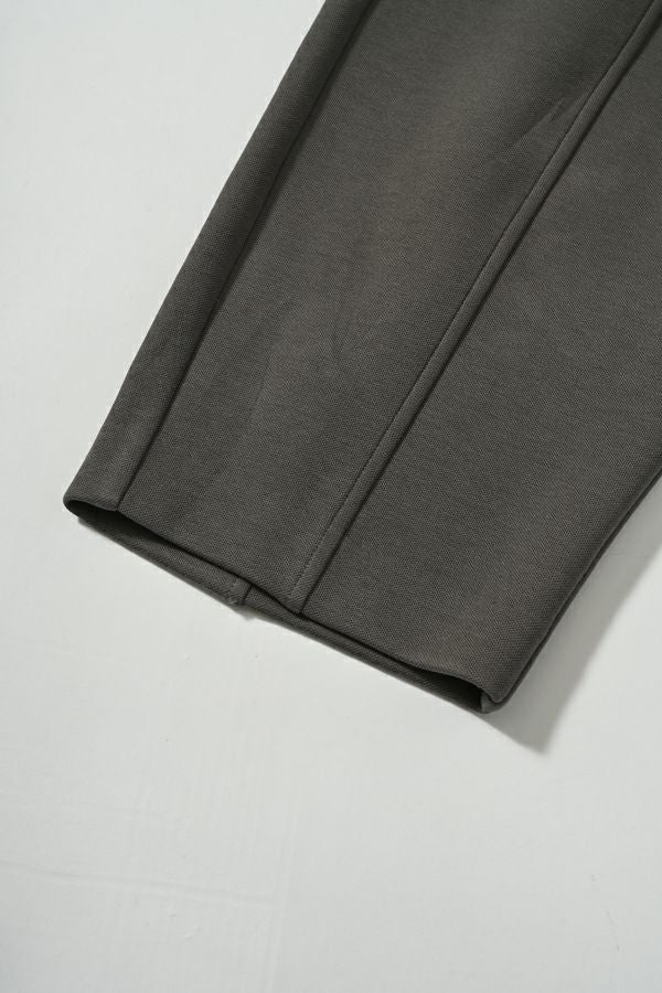 リラックス感とモードが融合、バナナカーブパンツ。 程よいハリ感とストレッチ性を兼ね備えたダンボールカットソー素材を使用した、バナナカーブシルエットは、個性的なフォルムながら、着用すると不思議とすっきりとした印象に仕上がる、計算されたデザインです。太もものラインに沿いながらも自然にカバーし、スラリと美しいレッグラインを演出。 シワになりにくく、ウエストゴム仕様でストレスフリーな着脱が可能。リラックス感とモードな雰囲気を両立させた、大人のための洗練された一本です。 【秋のニュートラルレイヤードスタイル】 ・足元はボリュームソールのブーツを合わせて、トレンド感をアップ。 ・上品にまとめるなら、ロングコート+華奢なパンプスで大人の印象に。
