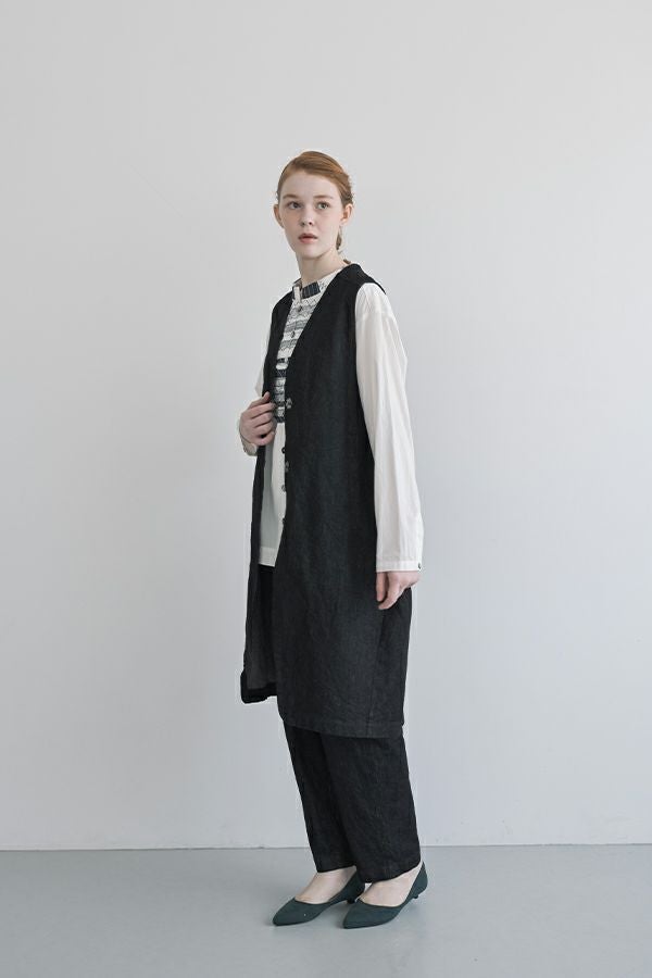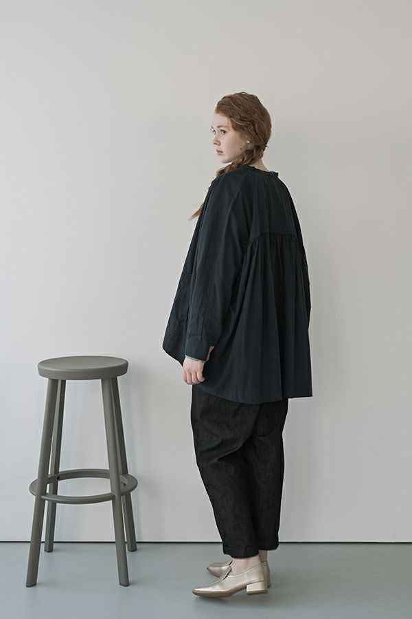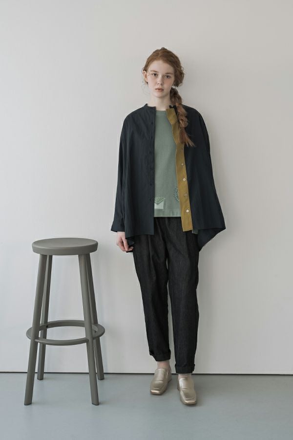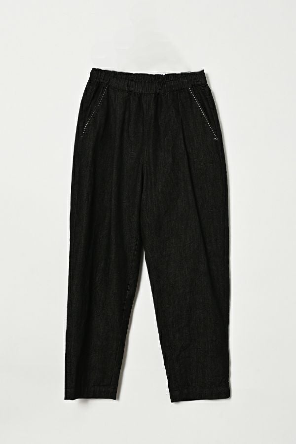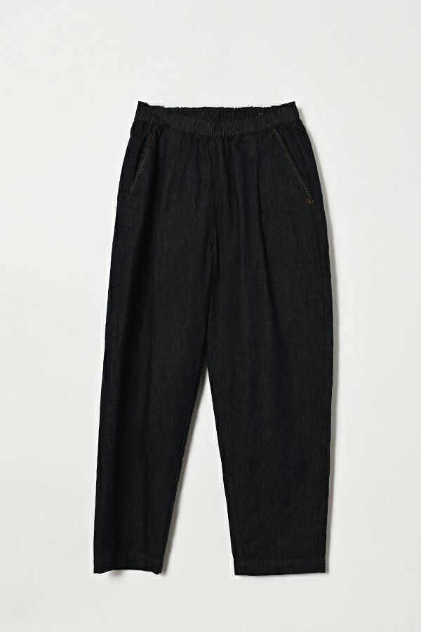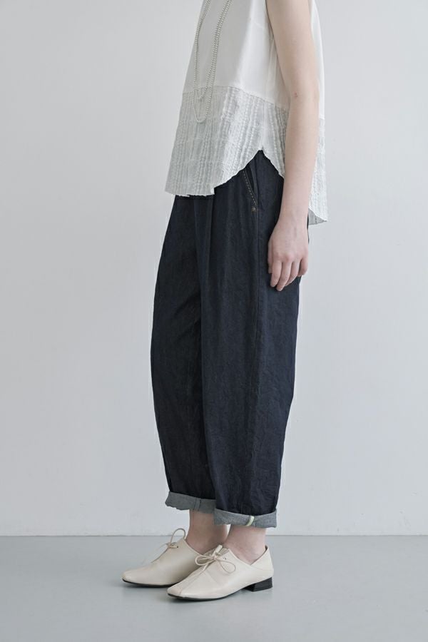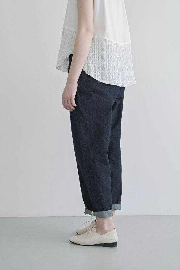 小ワザでお洒落がグッと惹き立つ、ドライタッチデニムパンツ。 春にご好評いただいたドライタッチデニムが、細かいワッシャー加工を施すことで色落ちを軽減し、さらに進化しました。 前タックは長めに縫い込んでお腹はスッキリ、腰周りはゆったり、裾に向かって細くなるタイプのシルエットです。(38号~Fのサイズ許容有り)総ゴムのウエストは、内側にコード(ひも)を配した仕様にしサイズ対応。 裾をロールアップさせると覗く配色パイピングがポイントです。(インディゴブルー×グリーン、黒×ピンク) あらゆるトップスに合わせやすく、腰周りにゆとりがあるのでショート丈でもバランスよく着こなせます。裾をロールアップすると、より引き締まった印象に仕上がります。●ドライタッチデニムベスト(25228-5398F-R)とセットアップ可 ●家庭洗濯の場合、風合いが損なわれますのでアイロンはお避けください