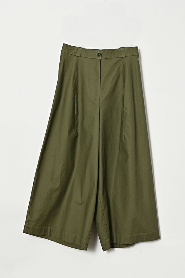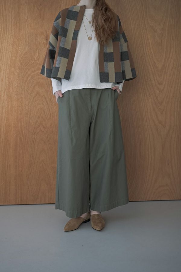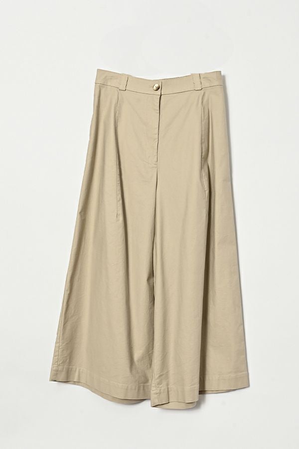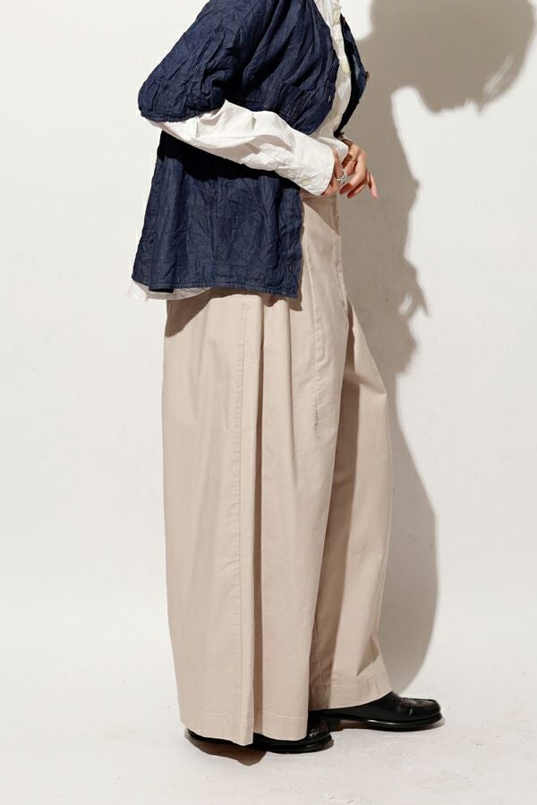 ナチュラルで程良いハリ感が大人っぽい、コットンストレッチワイドパンツ。 肉感のあるコットンストレッチ素材を製品洗いで仕上げた、ナチュラルながらもハリ感と着やすさを兼ね備えた一枚です。 ウエスト部分は脇から後ろにかけてゴム仕様で、リラックスした着心地を実現。脇線を前寄りに配置したカッティングと、ヒップの丸みを生かした長いダーツが、スッキリとしたデザインのアクセントになっています。 ハリ感があるため、裾に向かって美しいシルエットが作られ、カジュアルすぎず、きれいめにも着用可能です。 ボリュームのあるトップスや、ショート丈のニットや羽織りなど、様々なアイテムと合わせてアレンジできるため、コーディネートの幅が広がります。
