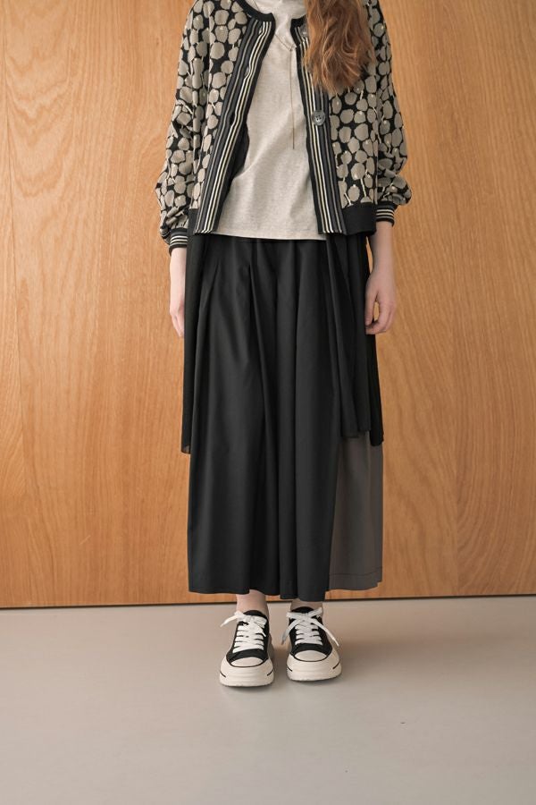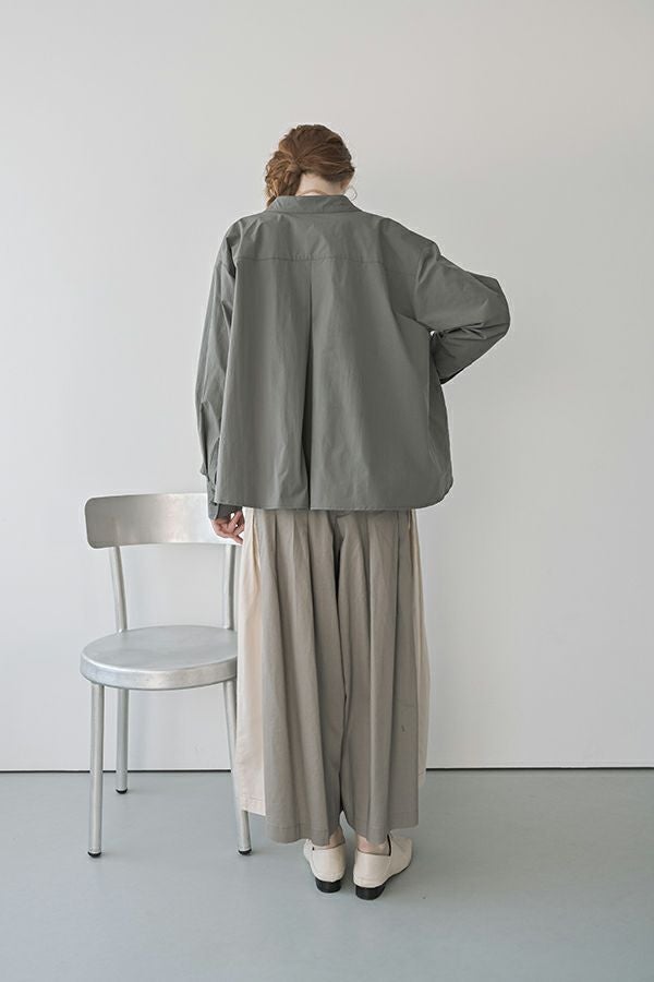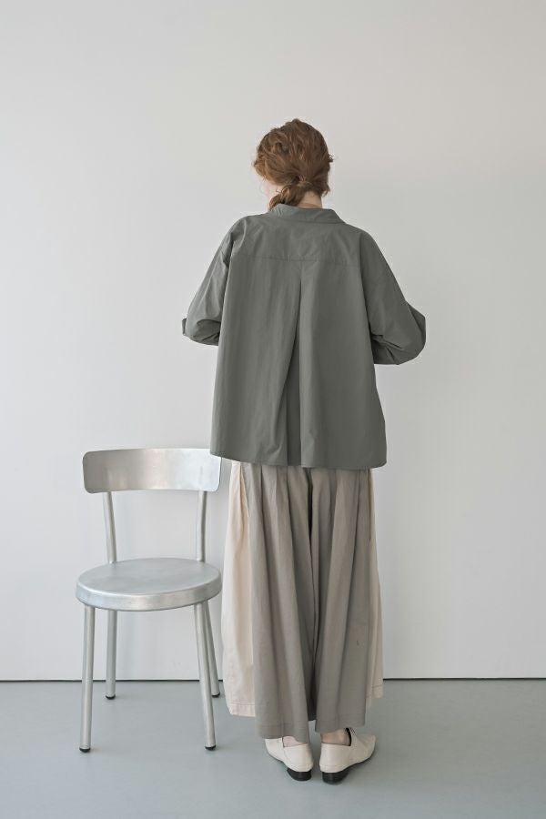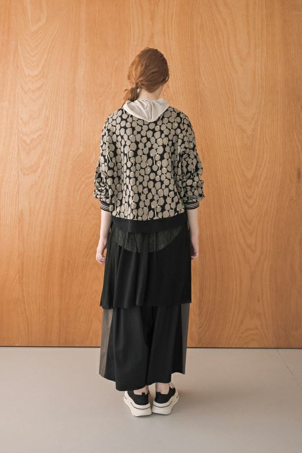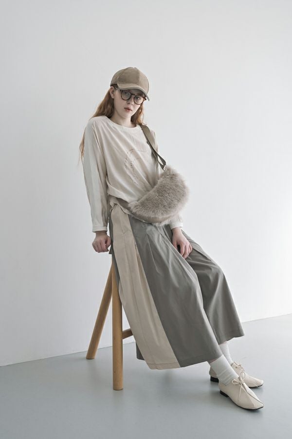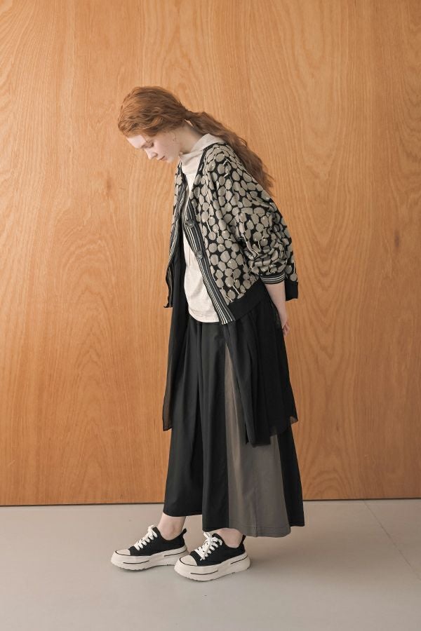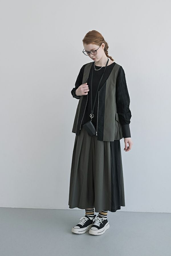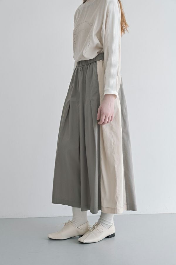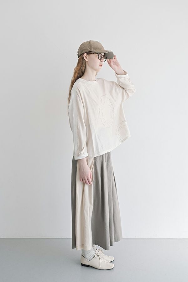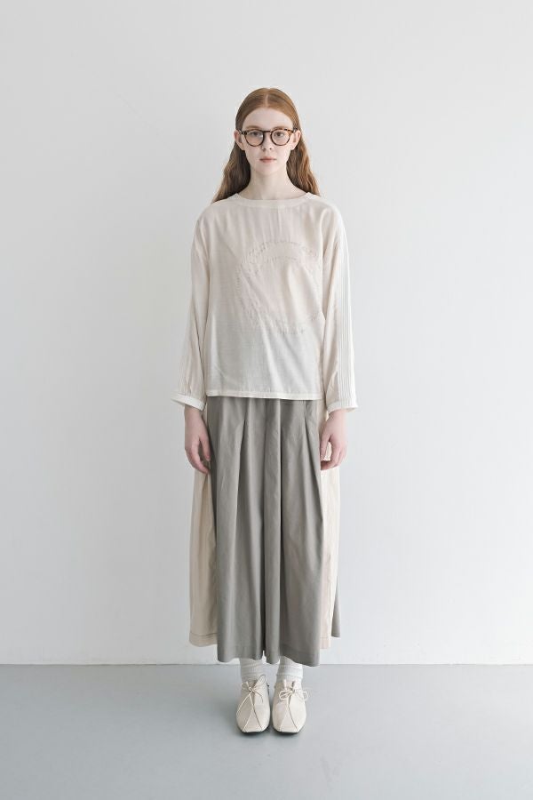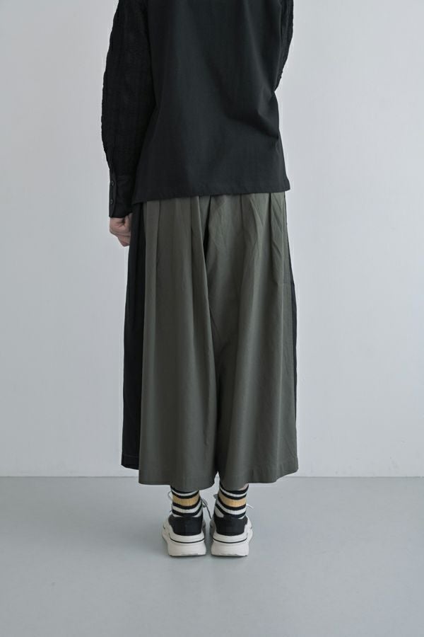 何本も入れたタックがポイントとなり、まるでスカートのようなシルエットを生み出すデザイン。ヒップ位置までの中縫いが、お腹周りをやさしくカバーしてくれるので、リラックス感と美しいラインを両立しています。