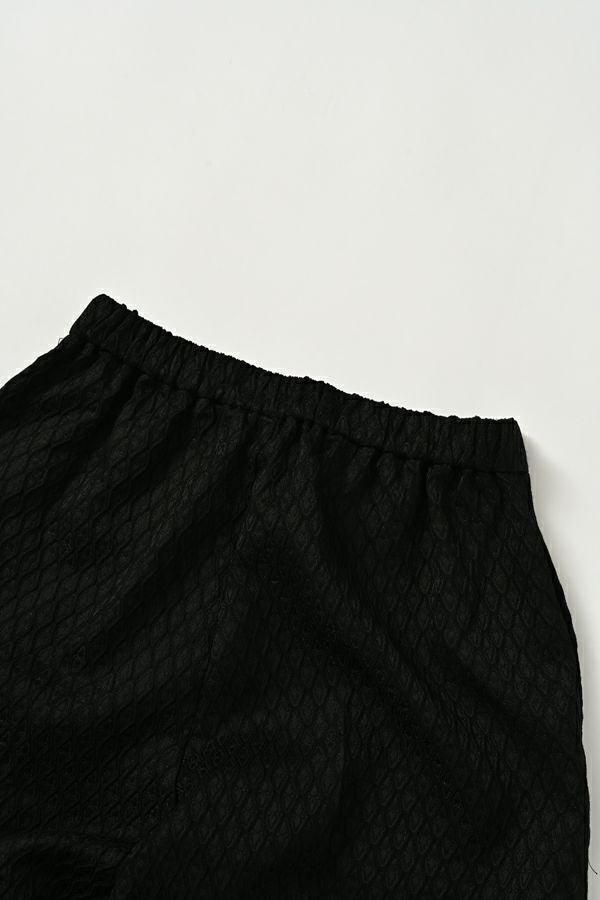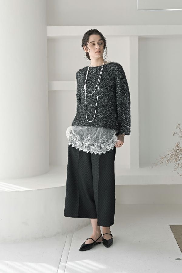 小柄なダマスクジャガードが繊細に浮かぶ、上品な一本。適度なハリ感があり、無地のように見える控えめな柄が、幅広いスタイリングにマッチします。やや短めの丈感とセンタープレス、裾に向かって広がるフレアシルエットが、脚をすっきりと美しく演出。後ろウエストゴム仕様でストレスフリーな着心地も魅力です。