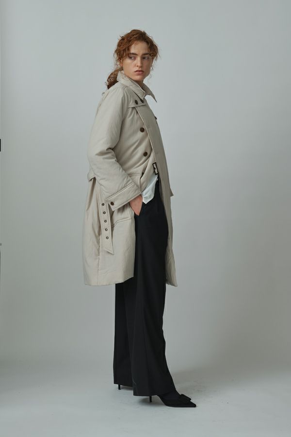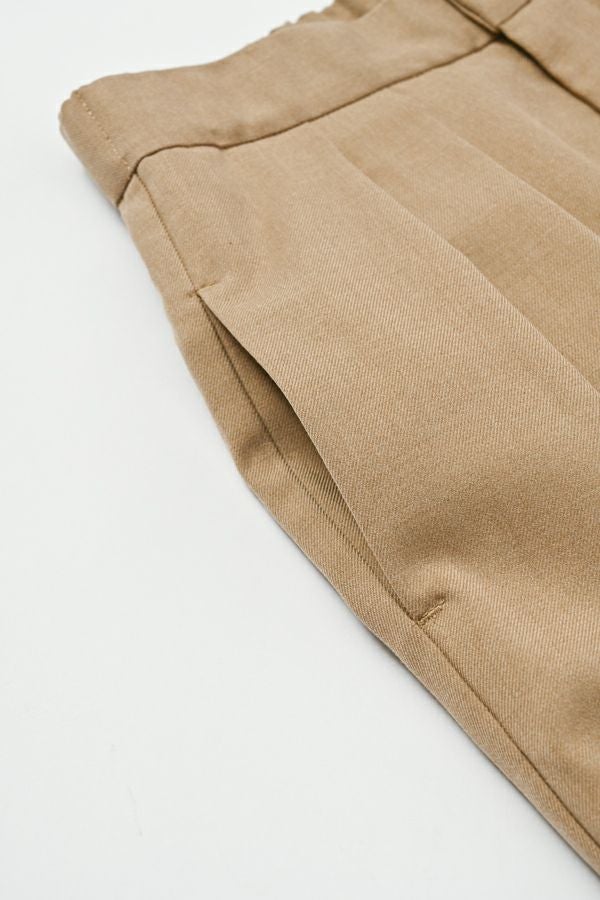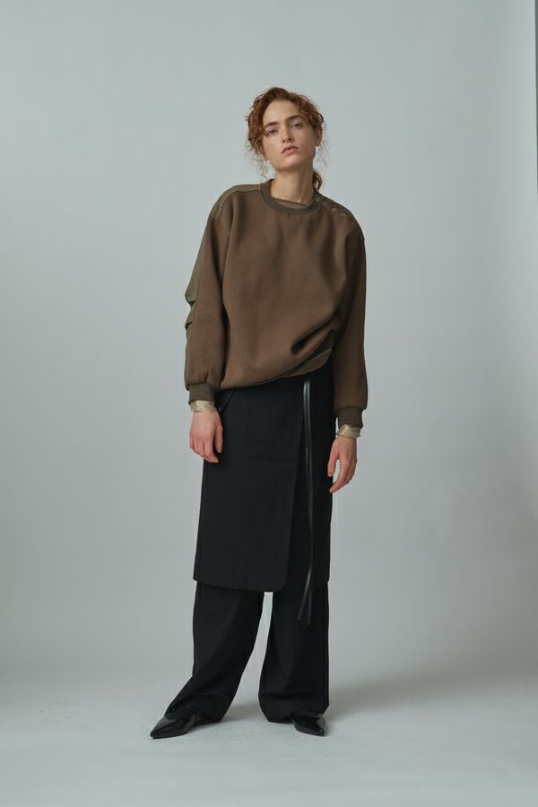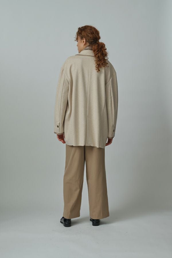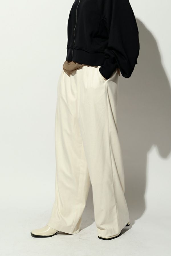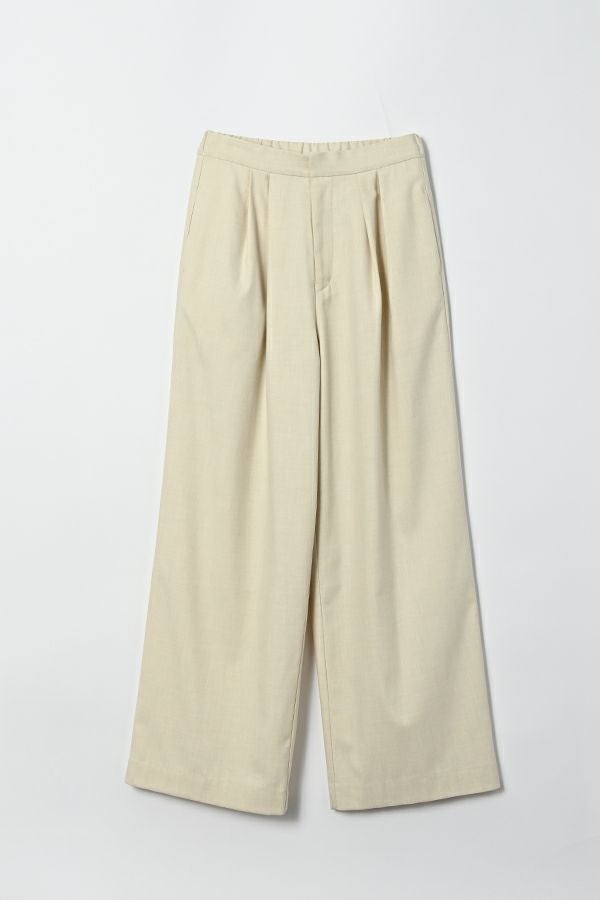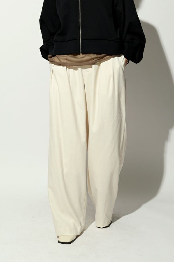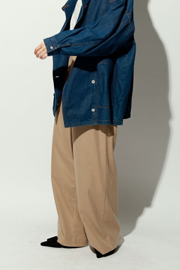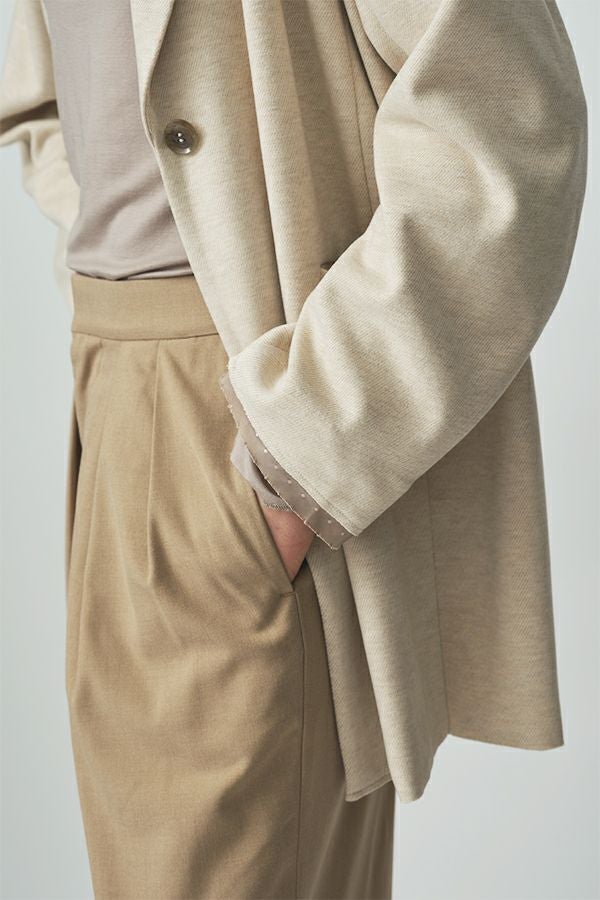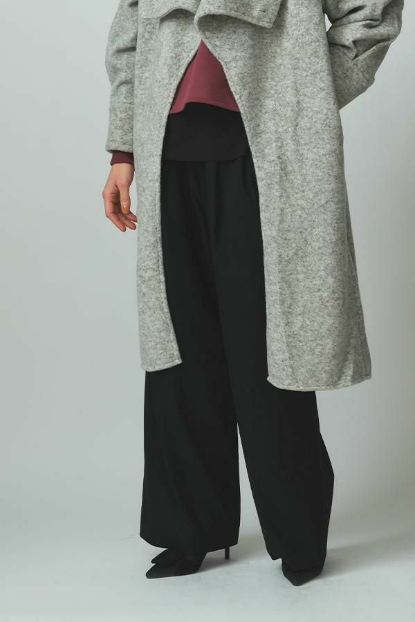 ラインで魅せて、重ねて締まる。ウールライク2タックパンツ。 肌側に微起毛加工を施したウールライク素材が、肌あたりの良さとさりげない温もりを両立。ゆったりとした穿き心地ながら、立体的に入れたタックが生み出す美しいラインが、大人の装いに品と輪郭を与えてくれます。 同素材のカバースカートとのレイヤードで、シルエットに奥行きと動きをプラス。 単品でも洒落感があり、オンにもオフにも対応できる振り幅の広さも魅力です。 トップスはふわりとしたニットで質感にニュアンスを。足元はパンプスやショートブーツで仕上げれば、今っぽくてどこかハンサムなバランスが完成します。 ミニマルで、研ぎ澄まされている。そんな一本が、装いの選択肢を広げてくれます。 ●ウールライクカバースカート(25233-8724D)とレイヤード可 ●2サイズ展開