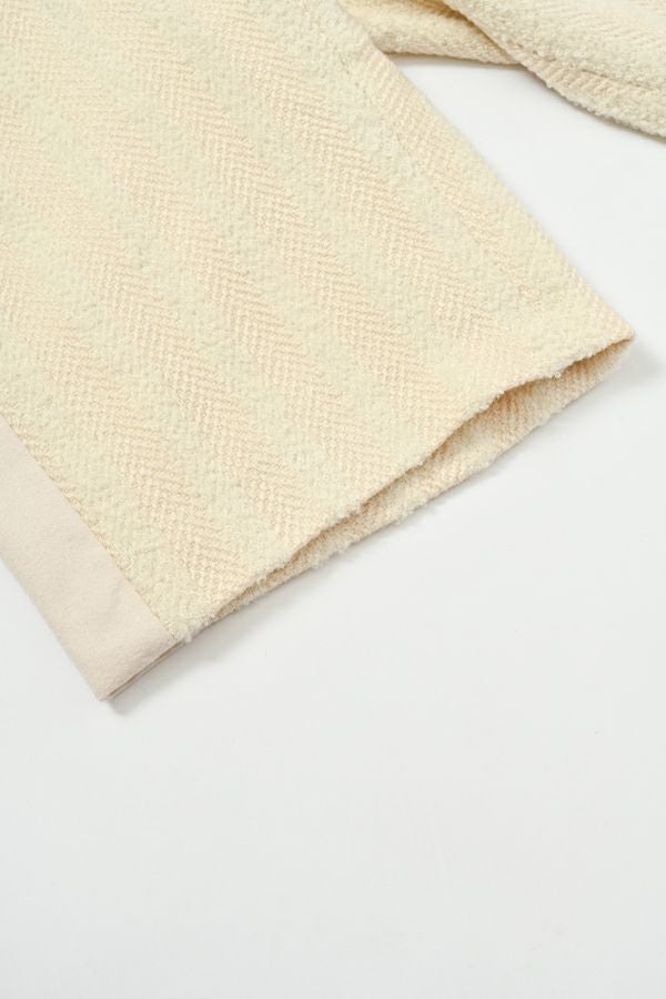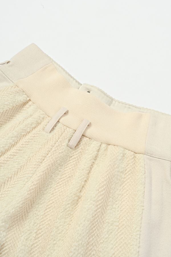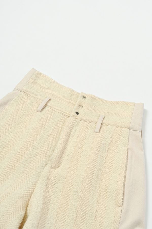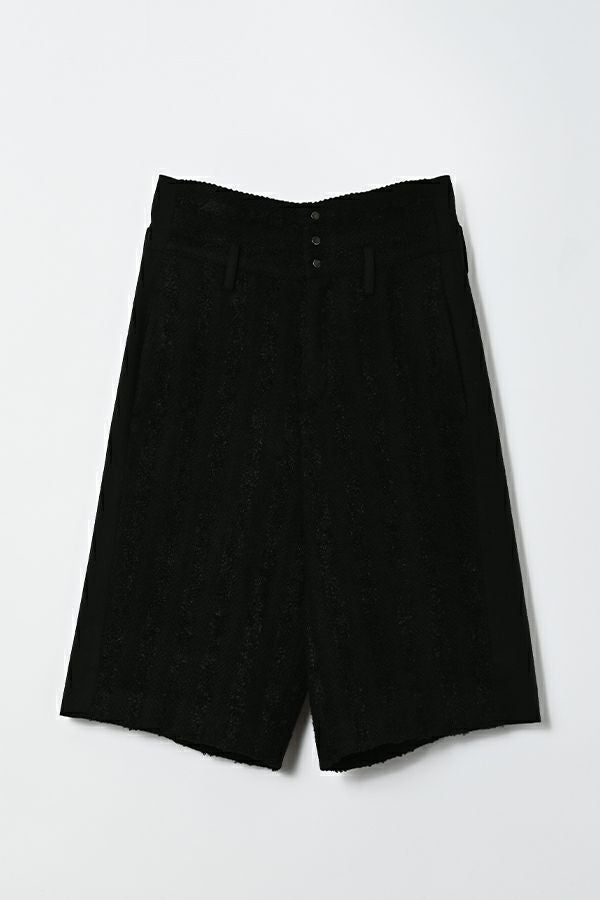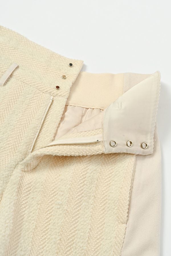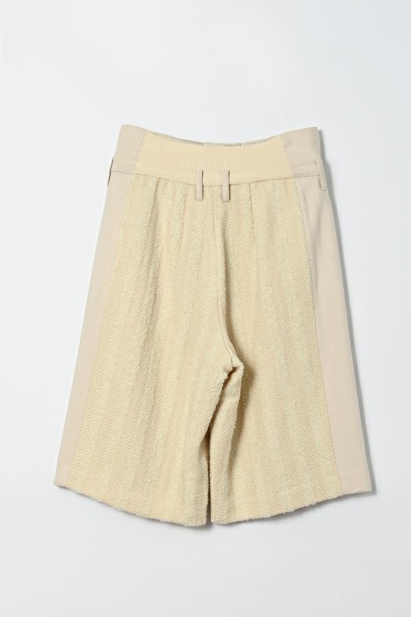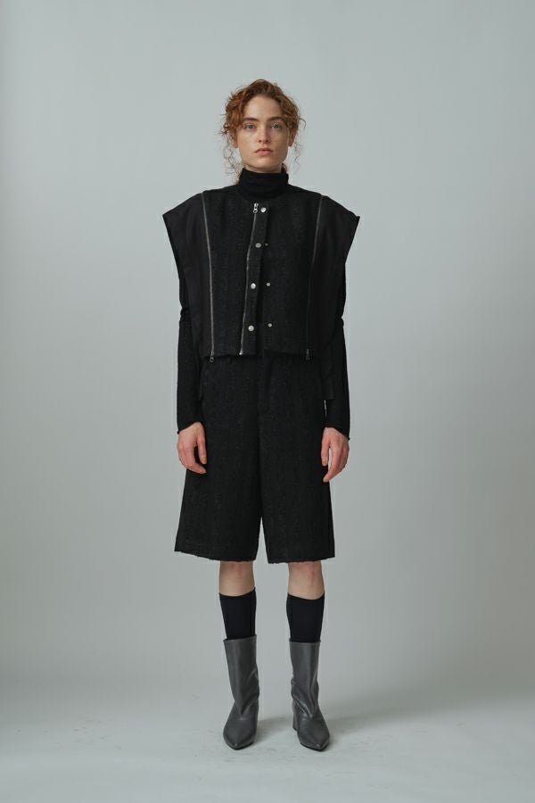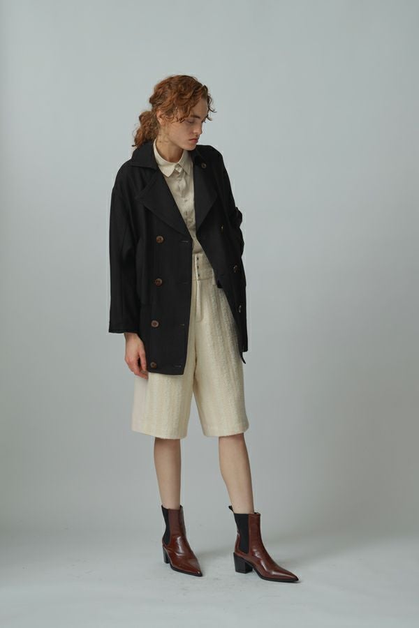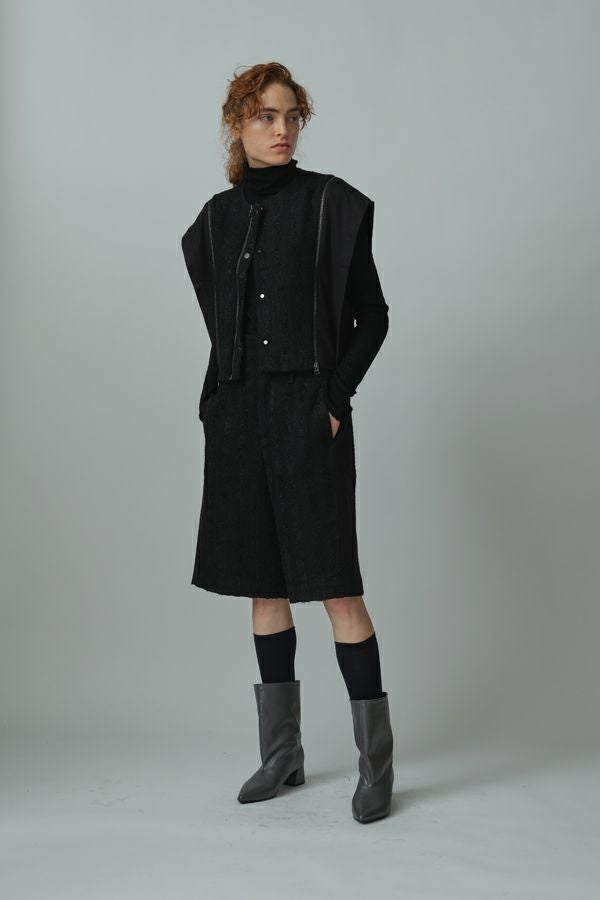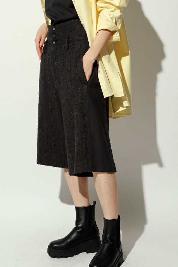 交差する温もりとエッジ。ウールツィードショートパンツ。 温もりのあるツイードの素材感と構築的な切り替えラインが織りなす立体シルエットで、スタイルに深みと緊張感をもたらし、都会的なムードを演出。 足元は白ソックス×パンプスで抜け感を加えて。トップスはタイトにまとめれば、丈感がより際立ち、バランスの妙が光るスタイリングに。オンにもオフにも着回せるからこそ、シーズンの軸になる一本です。 クラシックに偏りすぎない。甘さにも頼らない。 モードと知性を内包した、洗練のバランスボトム。 ●ウールツイード切替ベスト(25233-5731E)とセットアップ可