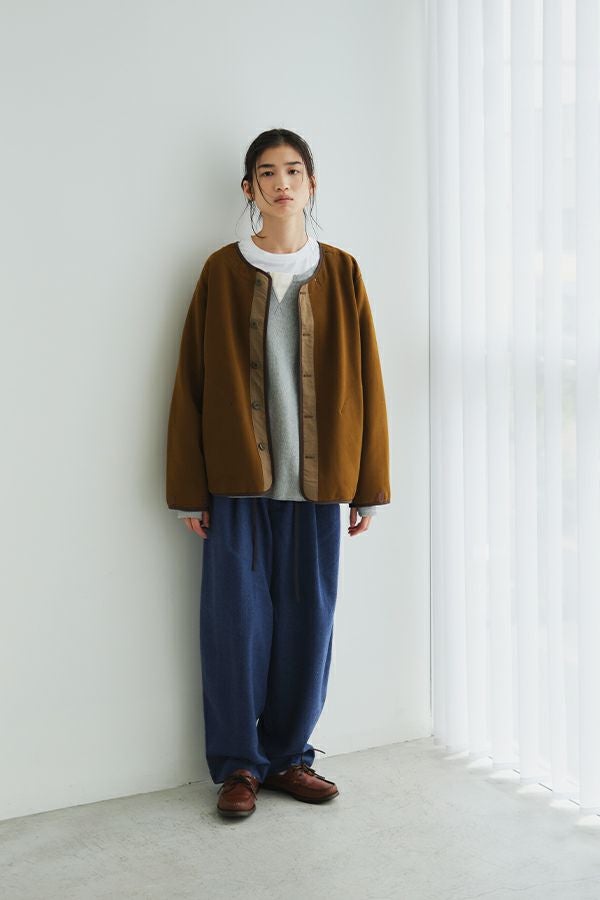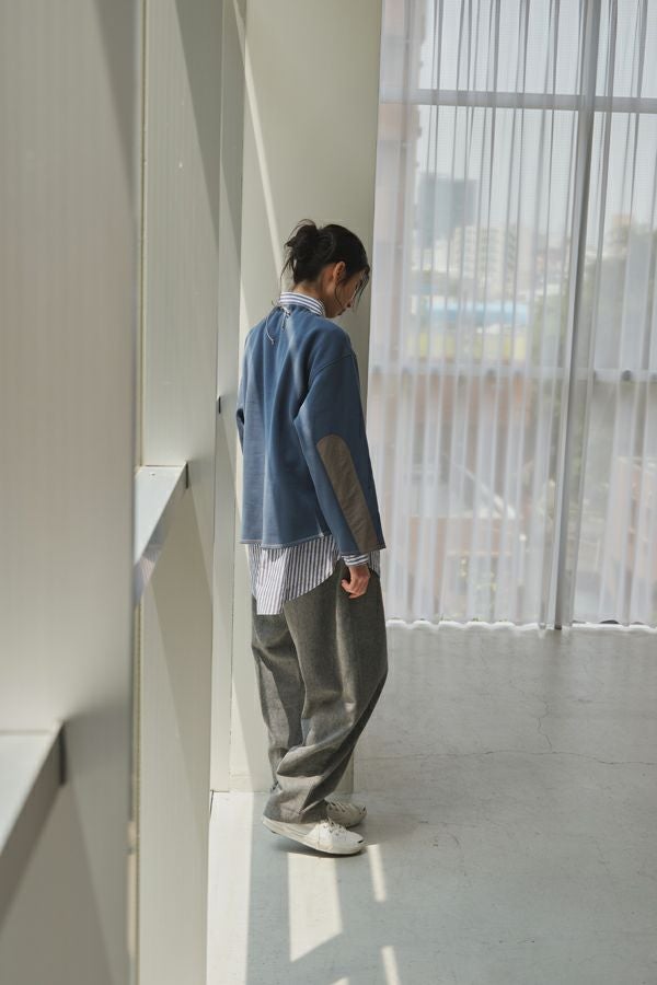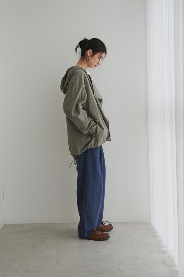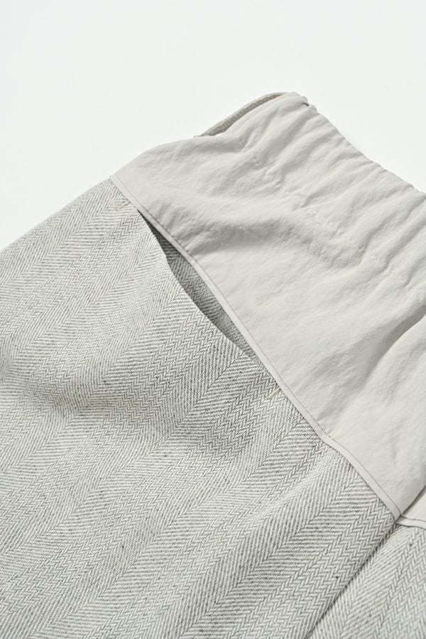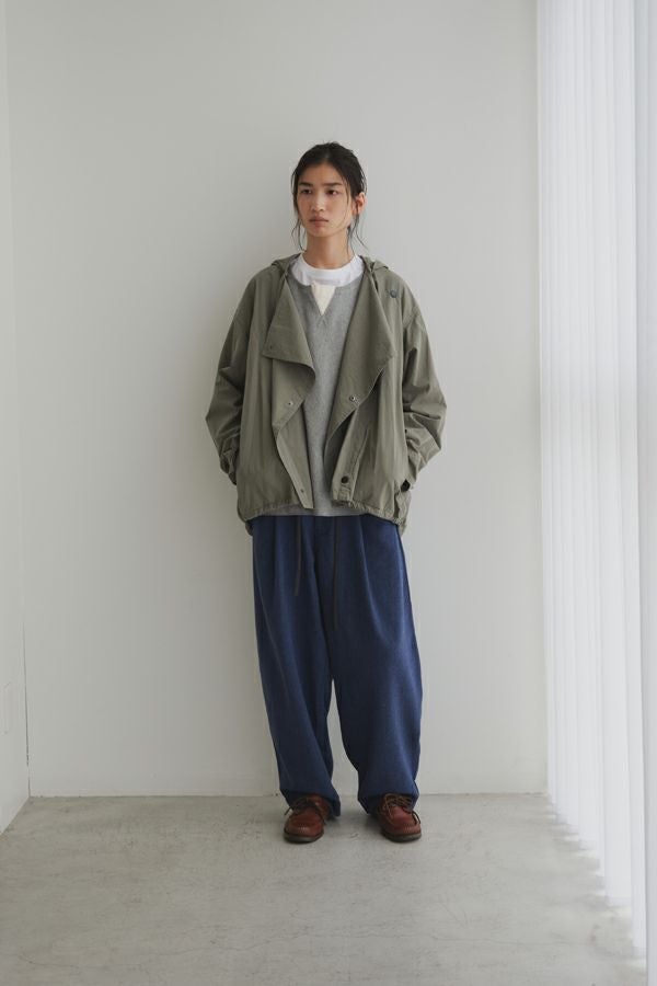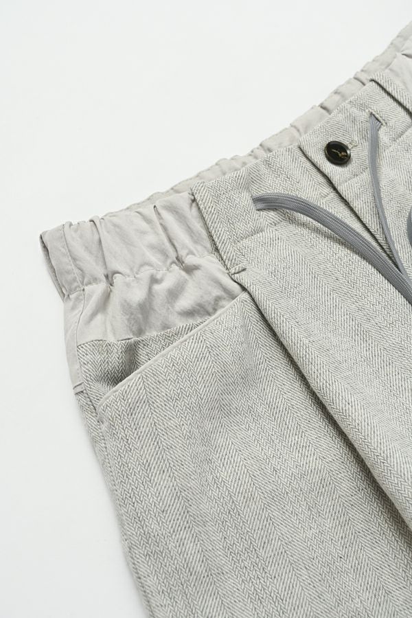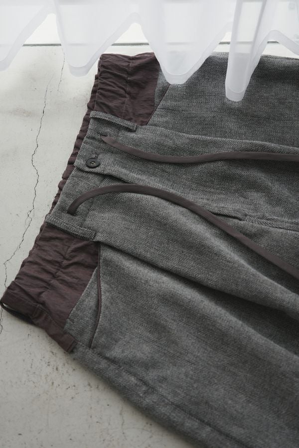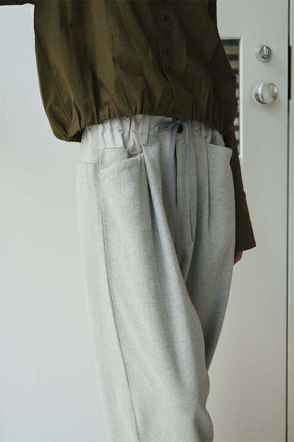 気負わず、品よく。計算されたシルエットのイージートラウザー。 リラックスした穿き心地なのに、きちんと見えが叶う。そんな理想をかたちにした、太めテーパードのイージーパンツ。 ヒップ周りは適度なゆとりで動きやすく、膝下からすっきりとテーパードしたラインが、大人のカジュアルに上品さを添えます。大きめのタックで横から見たときの立体感も◎。 ウエストは後ろゴム+コード仕様でサイズ調節可能に。コード先を表に出さずに着用できる、考え抜かれたデザインに注目。裏から紐を引っ張り、内側で絞めるとフロントが垂れてしまうことがありますが、帯裏のベルトループに紐を通すと軽減できるようになっています。見た目もすっきりしたウエストに。 素材には、ウールのような表情をもつポリエステルのランダムヘリンボーンを採用。太さの異なる織り柄がさりげないニュアンスを生み、ほどよいハリ感でシルエットもきれいにキープ。オン・オフ問わず活躍してくれる一本です。
