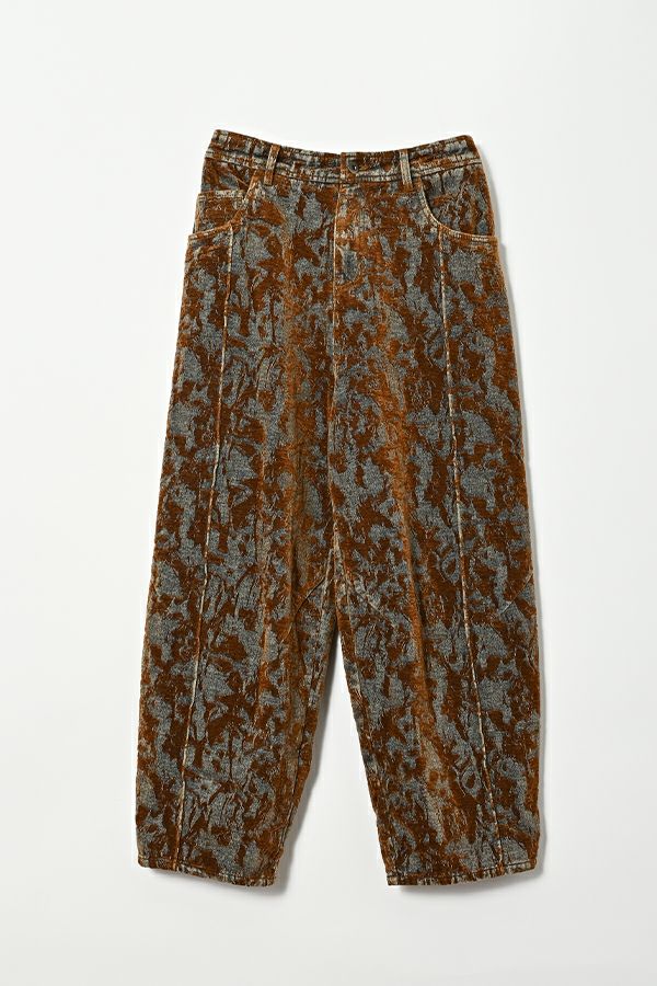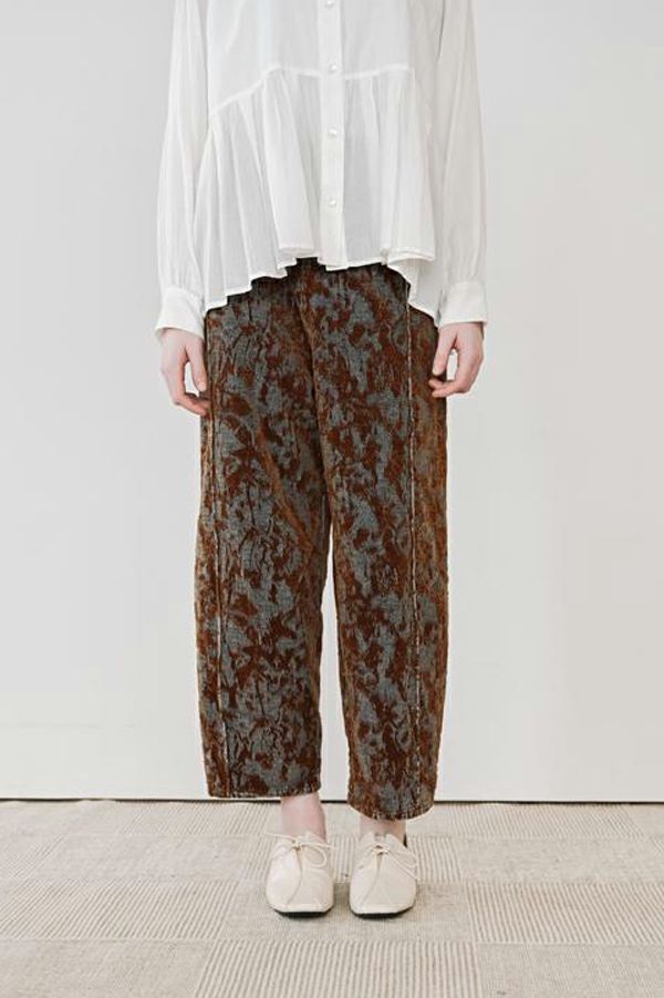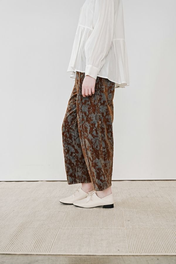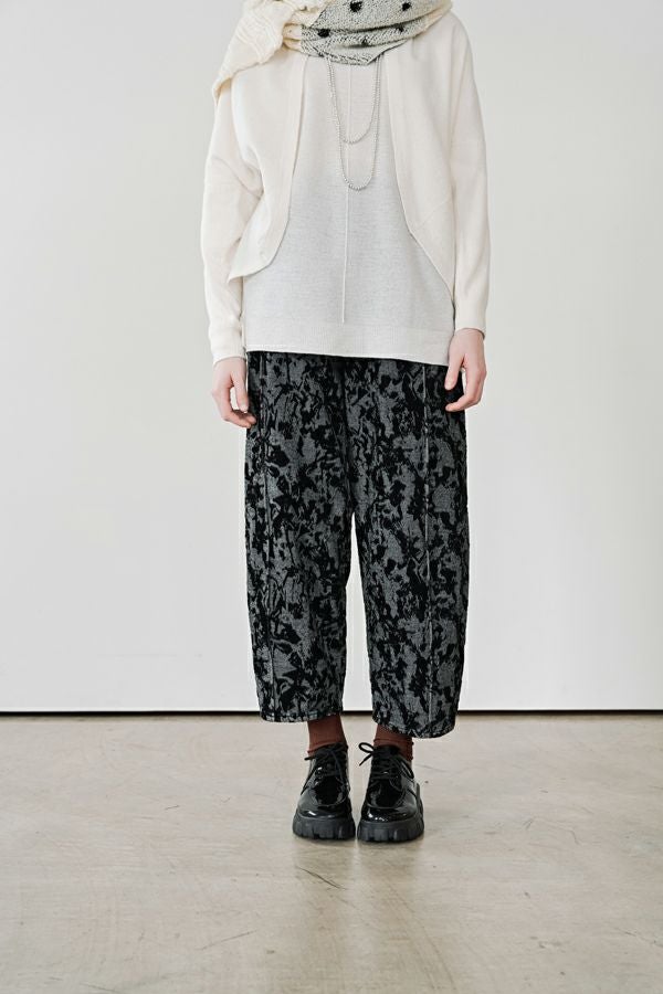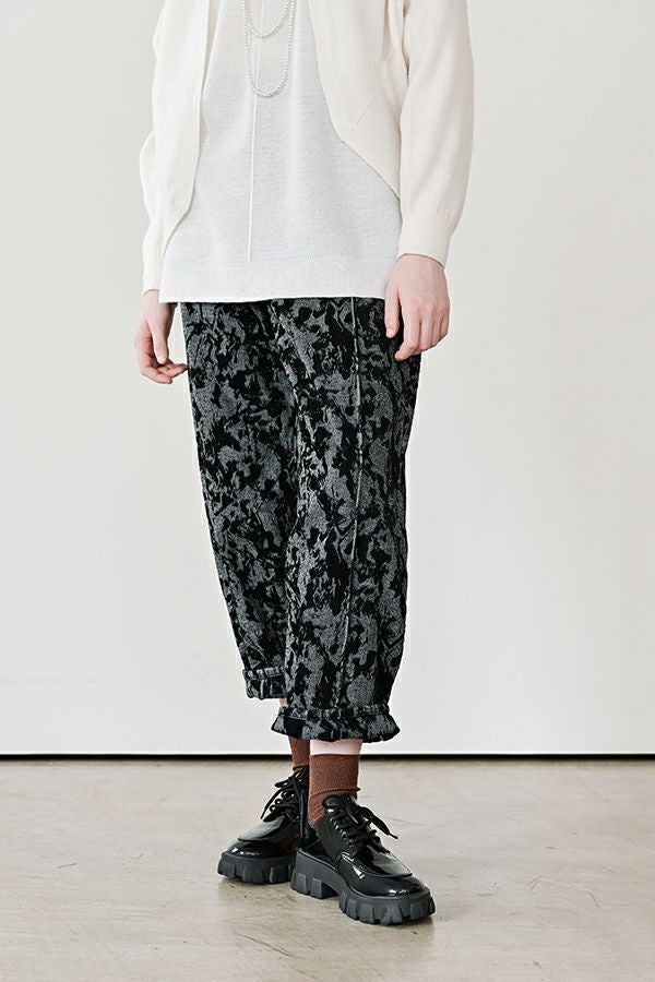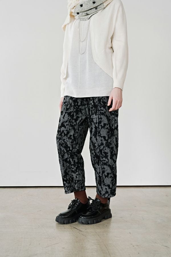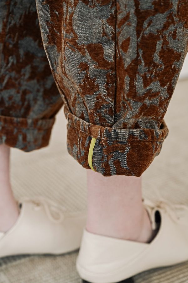 異素材が奏でる、柔らかさとモードのバランス。大人のためのコクーンパンツ。 デニムとフロッキージャガード織りのベルベットのような微光沢と起毛感が魅力の異素材を贅沢に使用した、印象的な一本。 柄のジャガード素材が存在感を放ち、コーディネートにさりげないアクセントをプラス。足元はスニーカーからブーツまで好相性。ロールアップして配色を覗かせれば、こなれた大人の抜け感スタイルに。 ●ハイブリッドツイードジャケット(25238-6630M-R)とセットアップ可