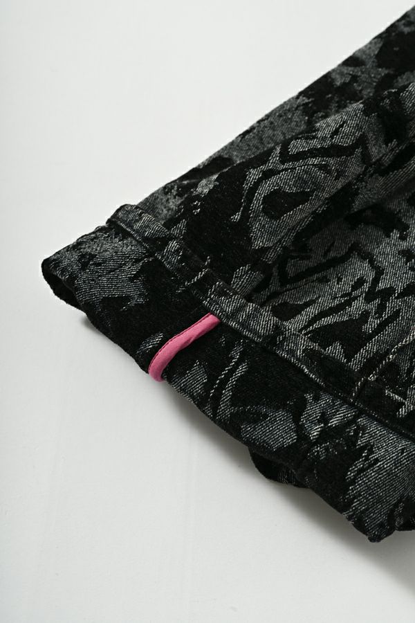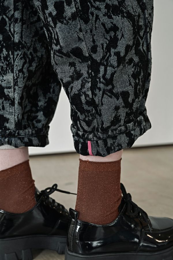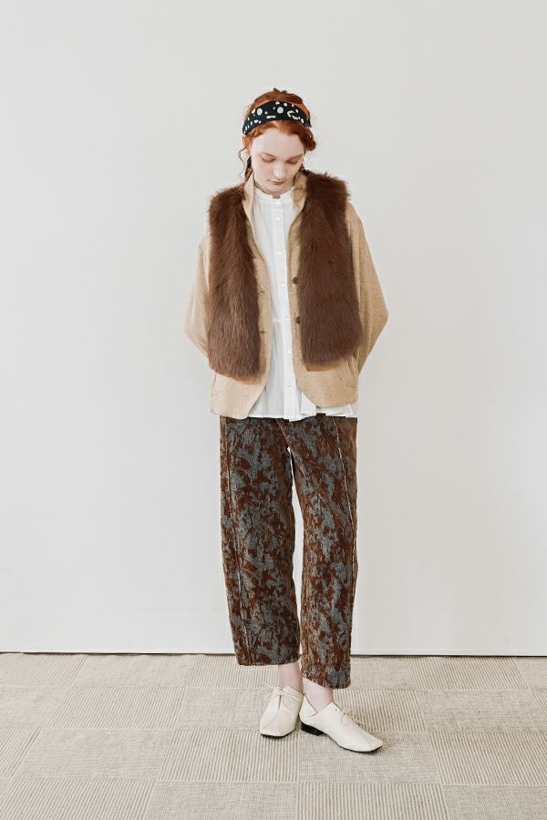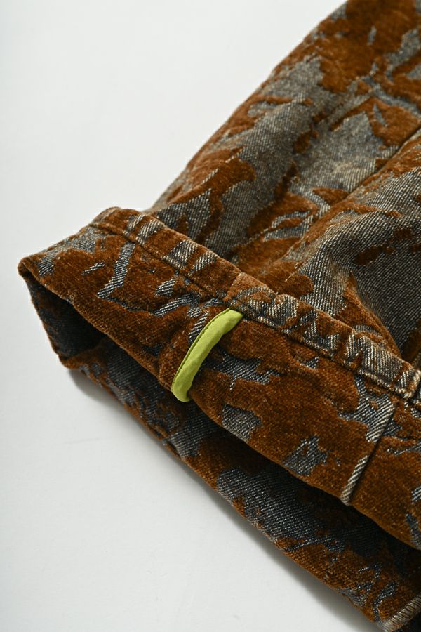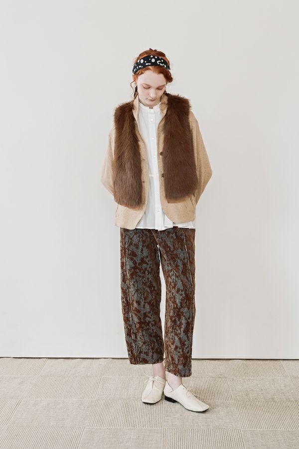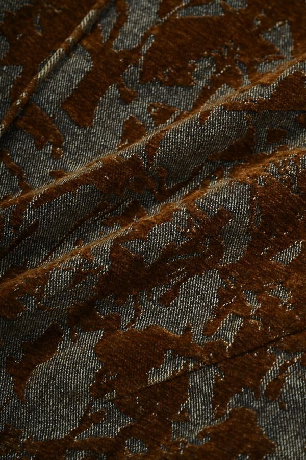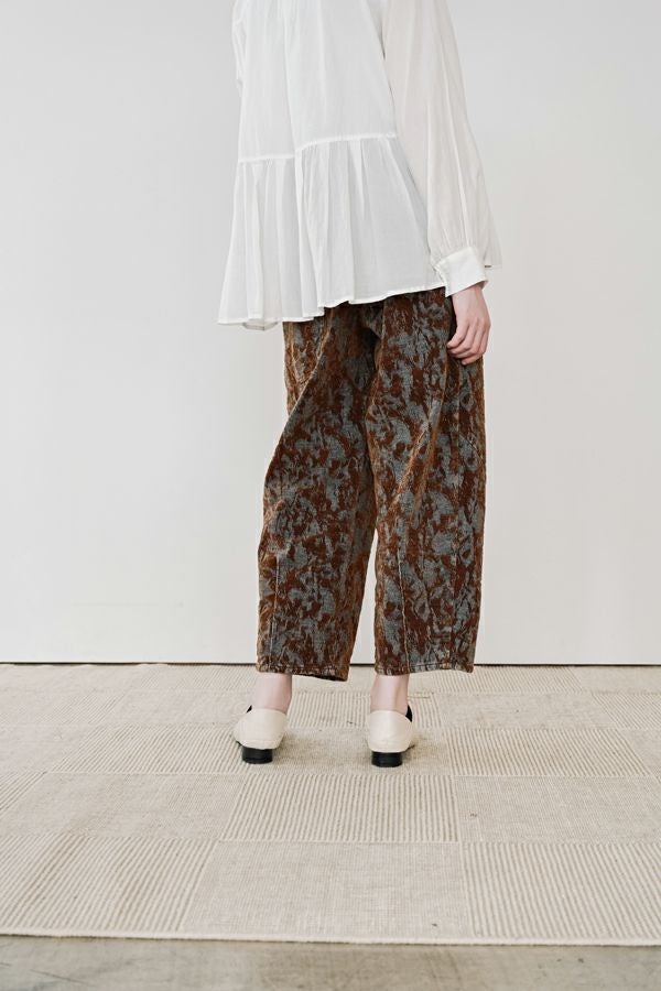 異素材が奏でる、柔らかさとモードのバランス。大人のためのコクーンパンツ。 デニムとフロッキージャガード織りのベルベットのような微光沢と起毛感が魅力の異素材を贅沢に使用した、印象的な一本。 柄のジャガード素材が存在感を放ち、コーディネートにさりげないアクセントをプラス。足元はスニーカーからブーツまで好相性。ロールアップして配色を覗かせれば、こなれた大人の抜け感スタイルに。 ●ハイブリッドツイードジャケット(25238-6630M-R)とセットアップ可