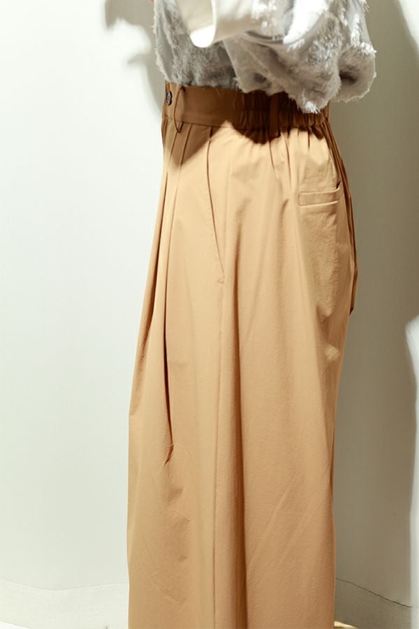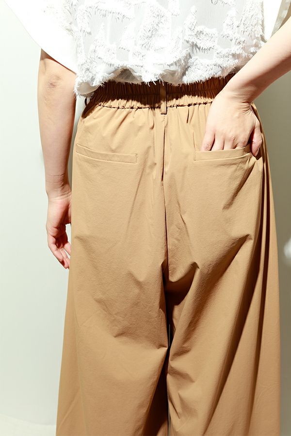 後ウエストゴムでリラックスしたはき心地を保ちながら、フロントファスナー仕様とベルトループがきちんとした佇まいをキープ。