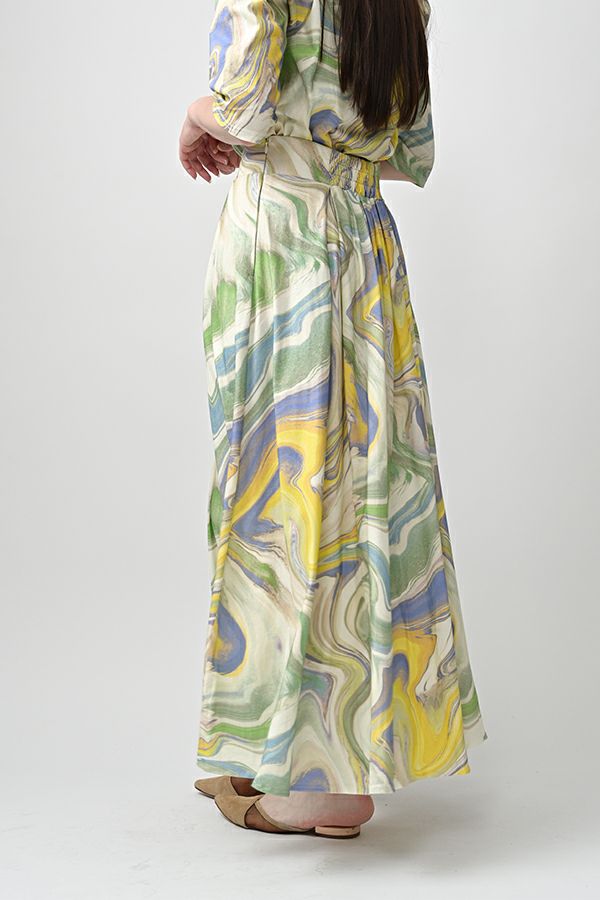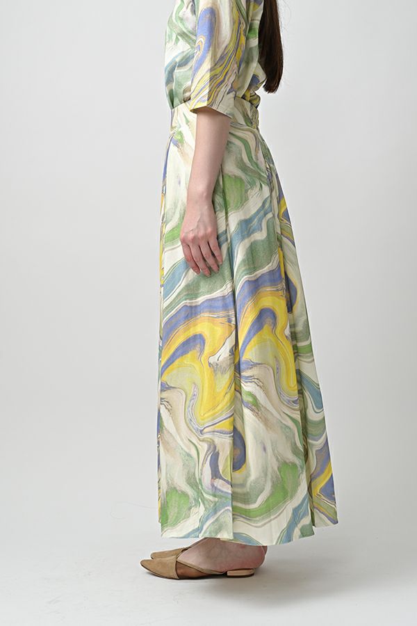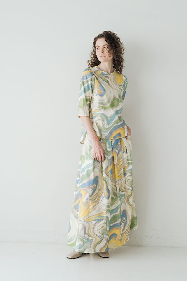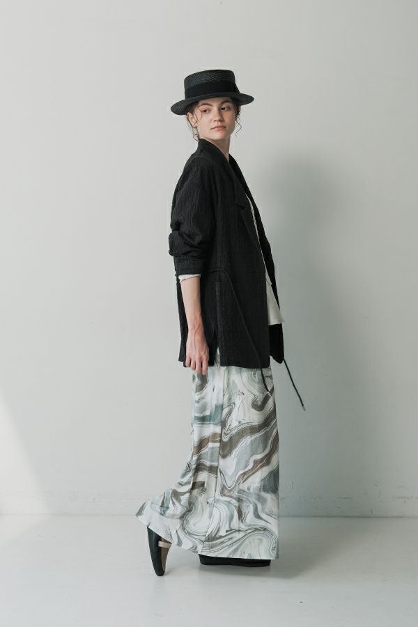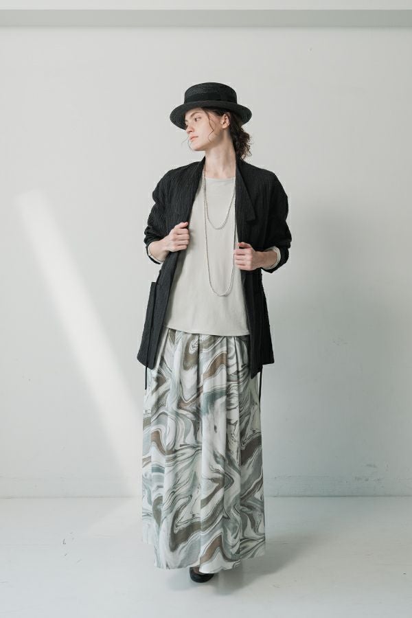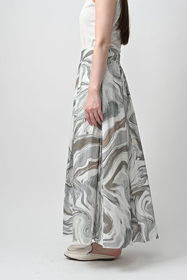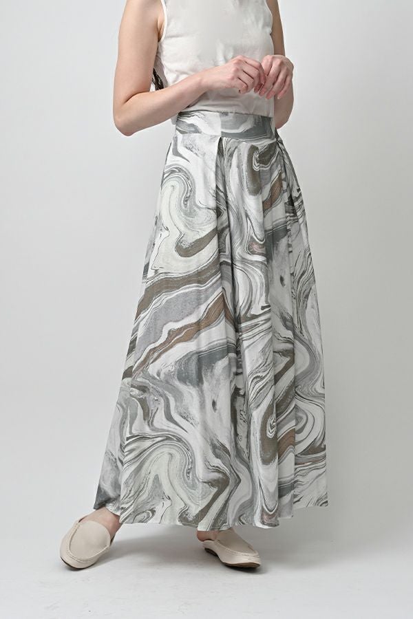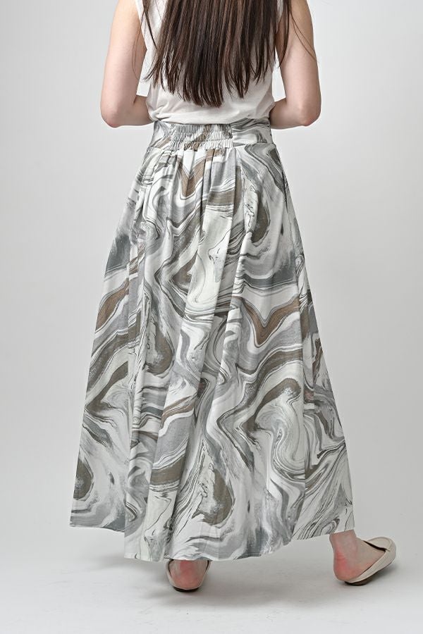 上品な落ち感で魅せる、マーブル柄カットソースカート。 オリジナルのマーブル柄をのせた、感度の高いデザインアイテム。穏やかな光沢と奥行きのあるプリントが、シンプルなシルエットにさりげない個性を添えます。 程よく上品なカットソー生地は肌離れがよく、さらりとした着心地で心地良さをキープします。すとんと落ちるシルエットが身体のラインを拾わずすっきり見せ、後ろウエストはゴム仕様でリラックス感のある穿き心地です。前ウエストに入れた大きめのタックが、程よいボリューム感を生み出し、大人の女性にぴったりの存在感を演出します。 総柄プリントなので、無地のニットやカットソーと合わせるだけで完成するスタイリングが魅力。同系色のトップスを合わせて大人シックにまとめる着こなしもおすすめです。●オリジナルプリント ●マープル柄プリントT(26158-1799M-G)とセットアップ可 ●同型で無地タイプ(26158-8889M-G)も有 ●加工の特性上、1枚1枚の色差や仕上がりにバラつきが見られる場合があります。他の製品では味わえない良さをお楽しみ下さい。