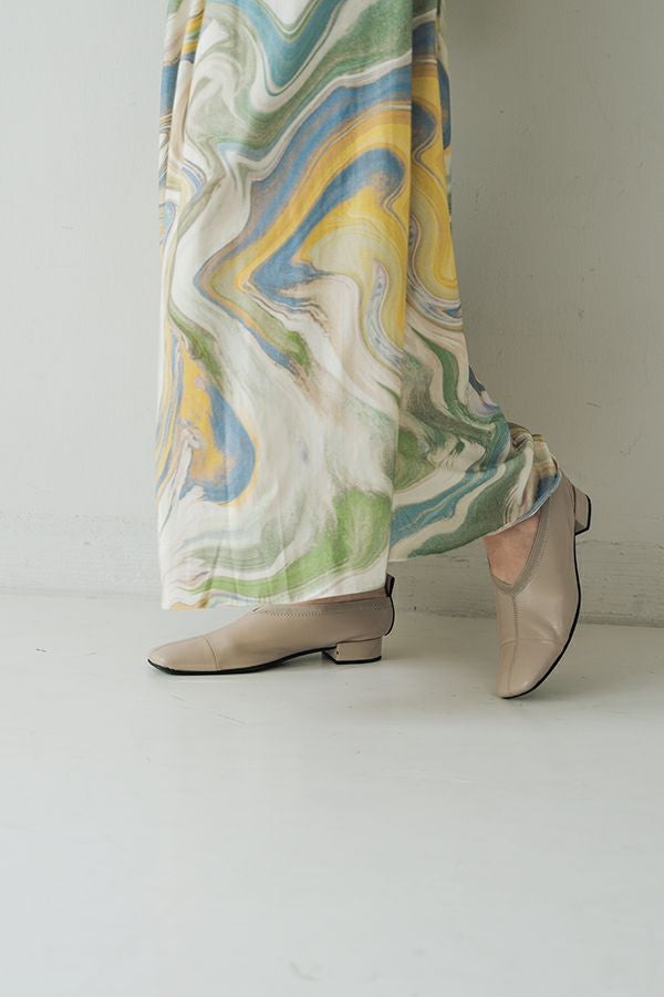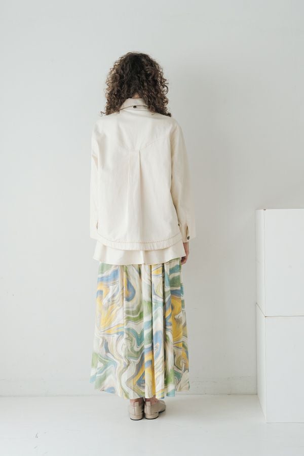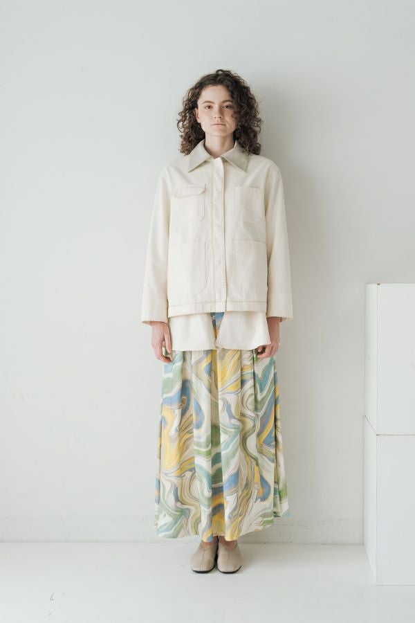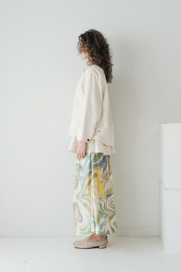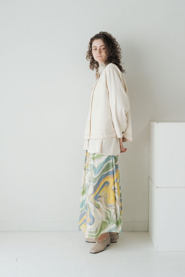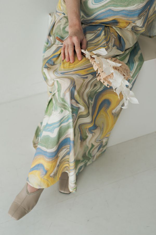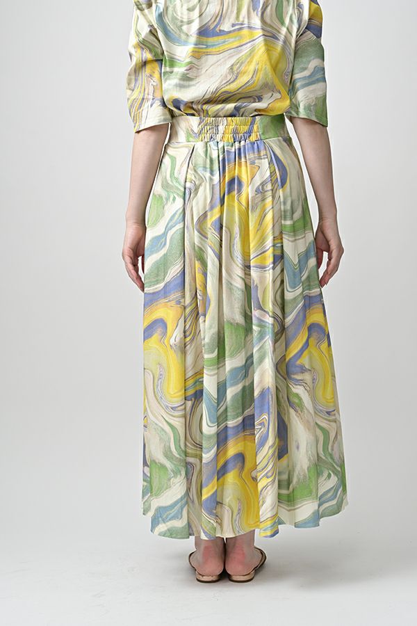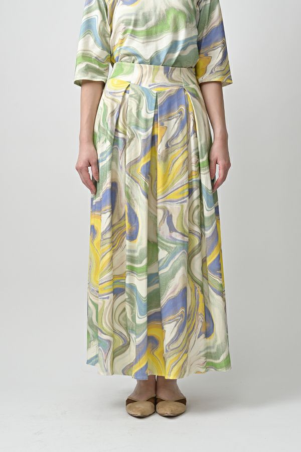 上品な落ち感で魅せる、マーブル柄カットソースカート。 オリジナルのマーブル柄をのせた、感度の高いデザインアイテム。穏やかな光沢と奥行きのあるプリントが、シンプルなシルエットにさりげない個性を添えます。 程よく上品なカットソー生地は肌離れがよく、さらりとした着心地で心地良さをキープします。すとんと落ちるシルエットが身体のラインを拾わずすっきり見せ、後ろウエストはゴム仕様でリラックス感のある穿き心地です。前ウエストに入れた大きめのタックが、程よいボリューム感を生み出し、大人の女性にぴったりの存在感を演出します。 総柄プリントなので、無地のニットやカットソーと合わせるだけで完成するスタイリングが魅力。同系色のトップスを合わせて大人シックにまとめる着こなしもおすすめです。●オリジナルプリント ●マープル柄プリントT(26158-1799M-G)とセットアップ可 ●同型で無地タイプ(26158-8889M-G)も有 ●加工の特性上、1枚1枚の色差や仕上がりにバラつきが見られる場合があります。他の製品では味わえない良さをお楽しみ下さい。