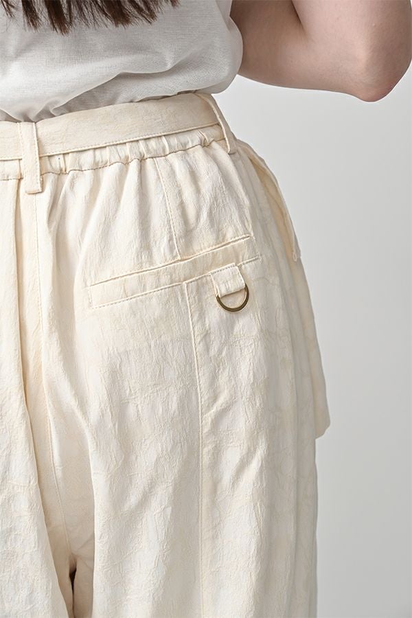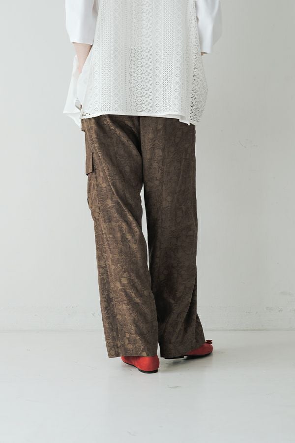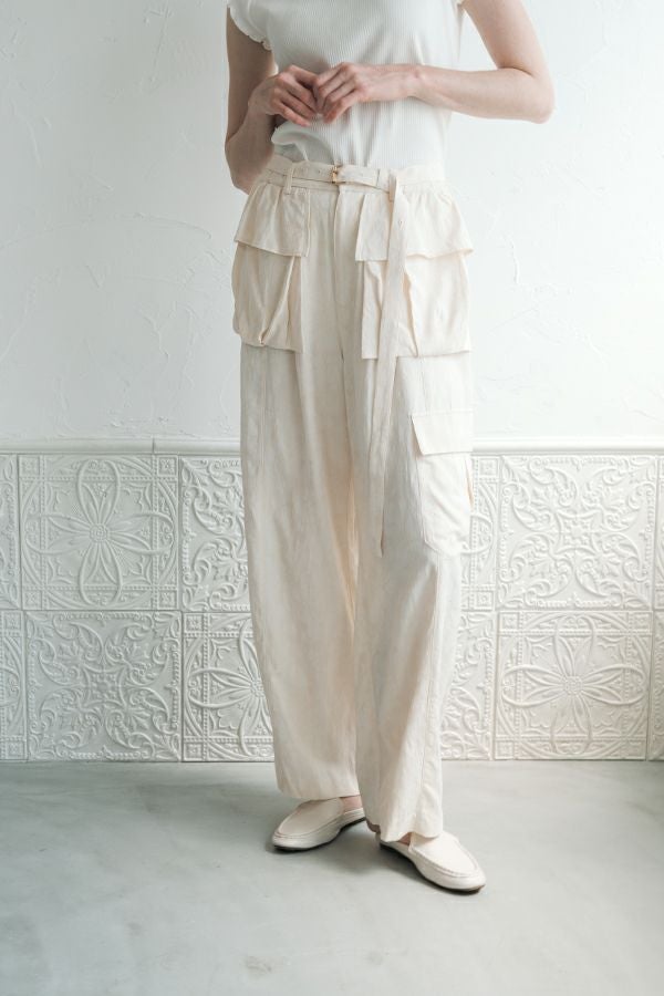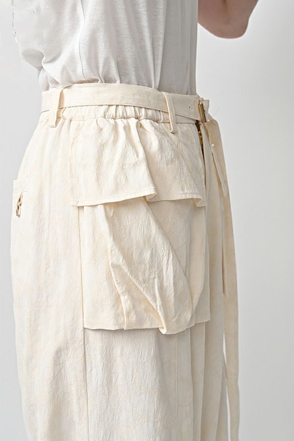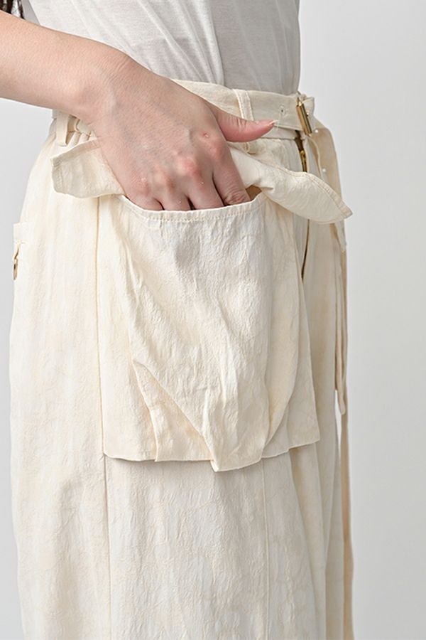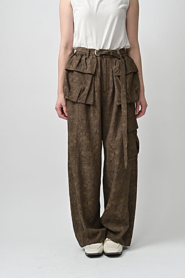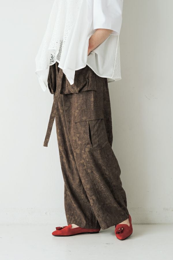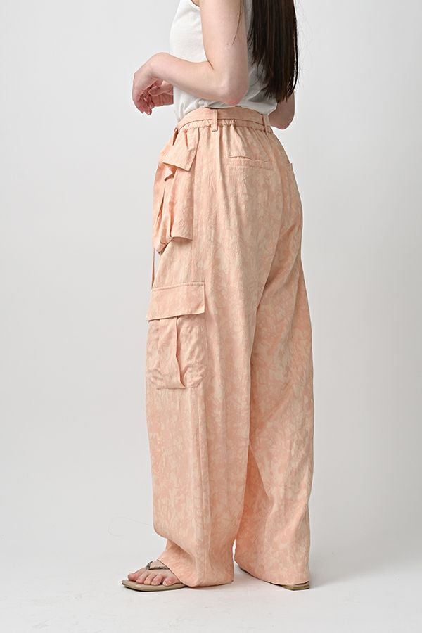 上品な光沢と立体感が魅力、大人のためのジャガードカーゴパンツ。 上品なドレープ感と高級感漂うジャガード生地を使用。立体的なアウトポケットや左側だけのカーゴポケットなど、アシンメトリーなディテールがトレンド感をプラスします。 ウエストは後ろゴム仕様に加え、取り外し可能なベルト付きでサイズ調節可能。 カジュアルなカーゴパンツながら、ジャガード特有の光沢感が大人らしさを演出。季節の変わり目にも取り入れやすく、シャツやジャケットとのきれいめスタイルはもちろん、スウェットやカジュアルニットと合わせても洗練された印象に仕上がります。
