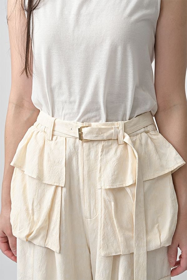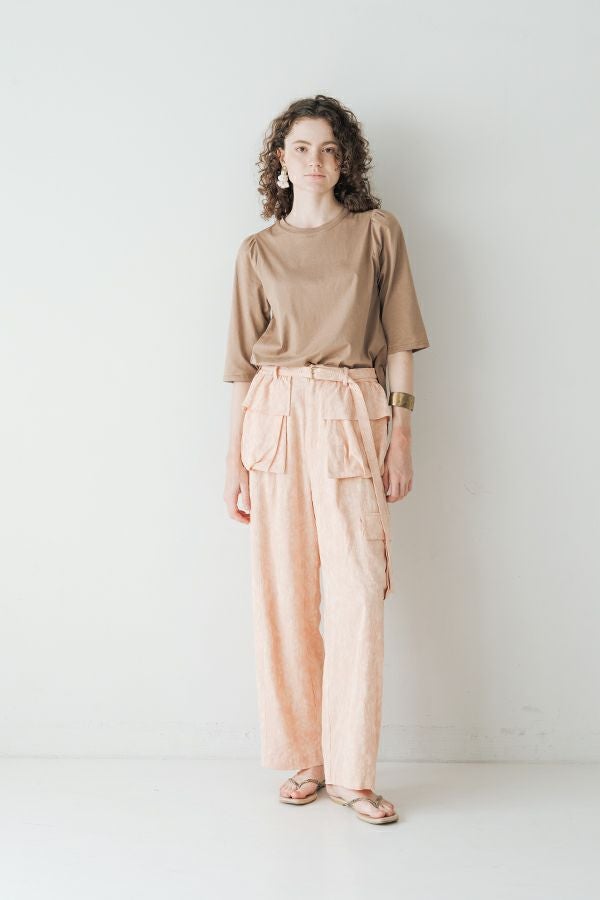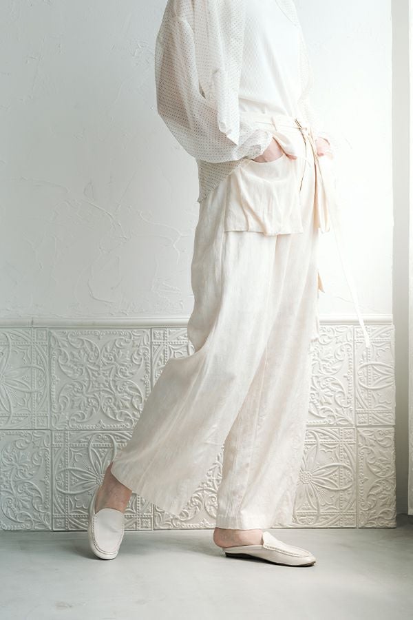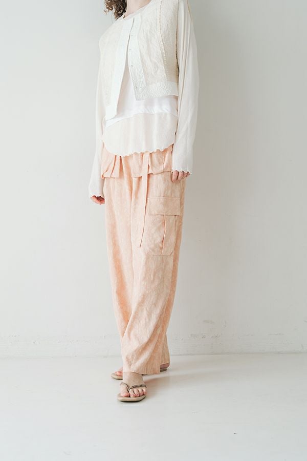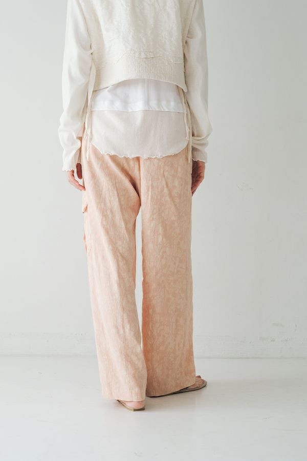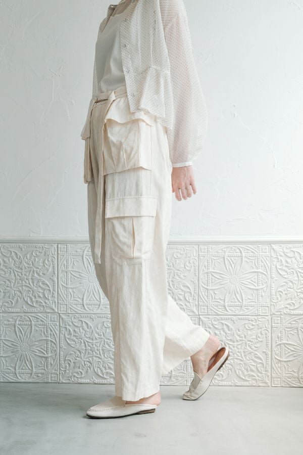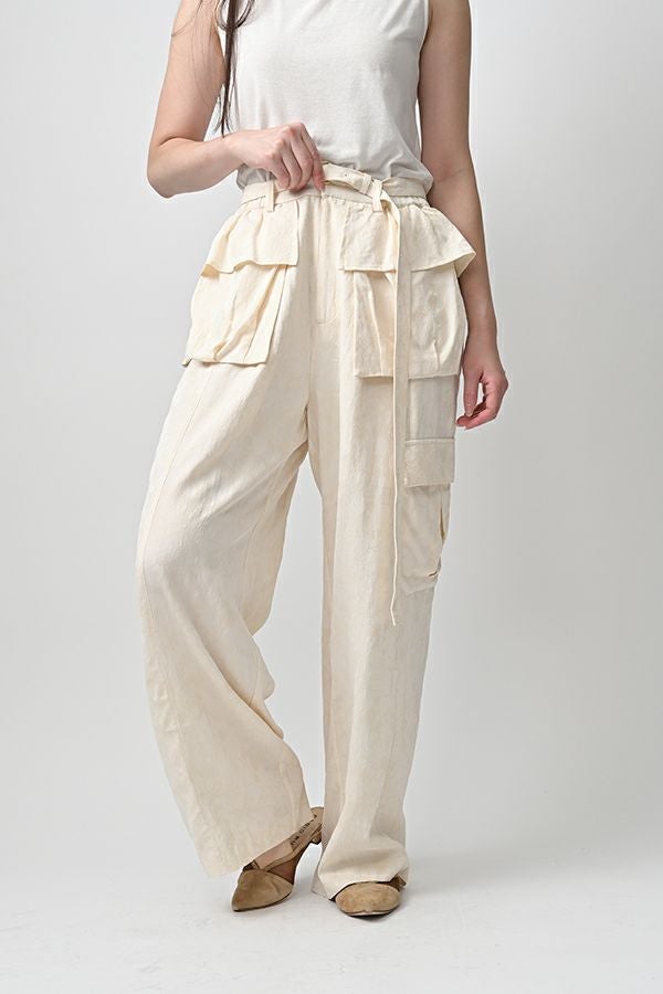 上品な光沢と立体感が魅力、大人のためのジャガードカーゴパンツ。 上品なドレープ感と高級感漂うジャガード生地を使用。立体的なアウトポケットや左側だけのカーゴポケットなど、アシンメトリーなディテールがトレンド感をプラスします。 ウエストは後ろゴム仕様に加え、取り外し可能なベルト付きでサイズ調節可能。 カジュアルなカーゴパンツながら、ジャガード特有の光沢感が大人らしさを演出。季節の変わり目にも取り入れやすく、シャツやジャケットとのきれいめスタイルはもちろん、スウェットやカジュアルニットと合わせても洗練された印象に仕上がります。
