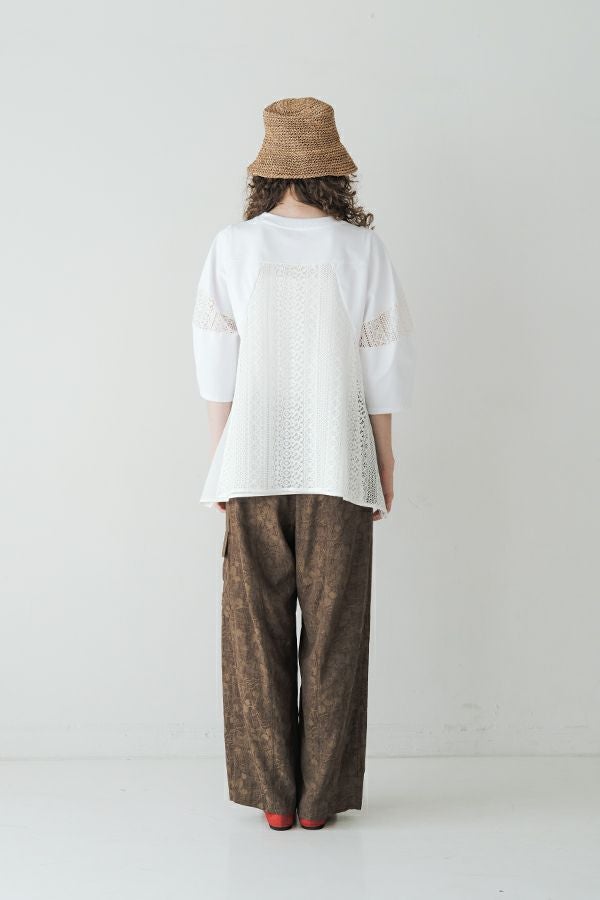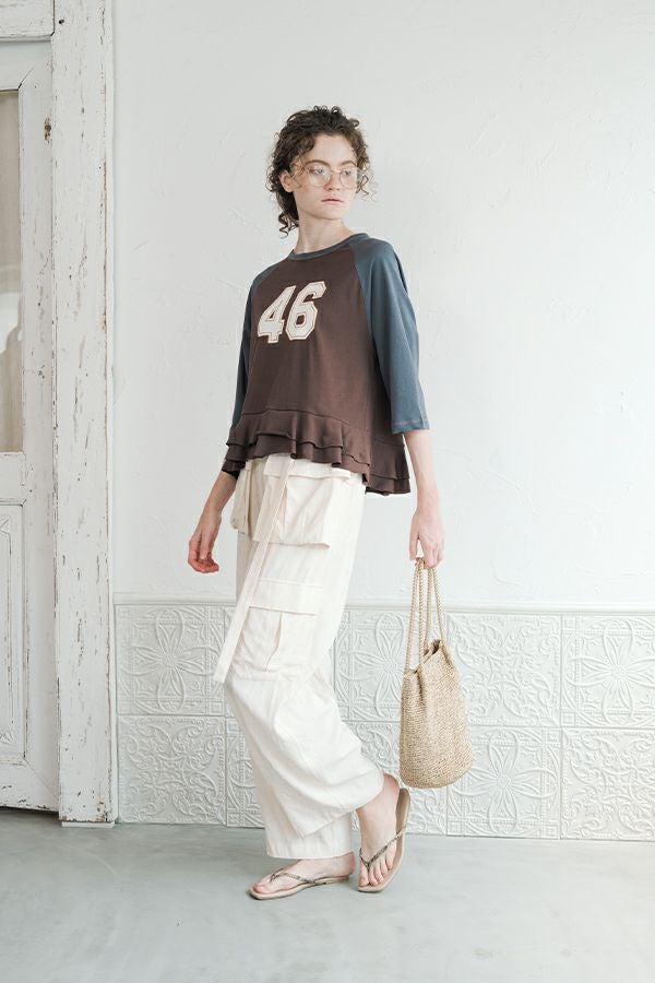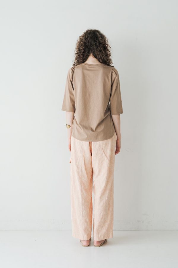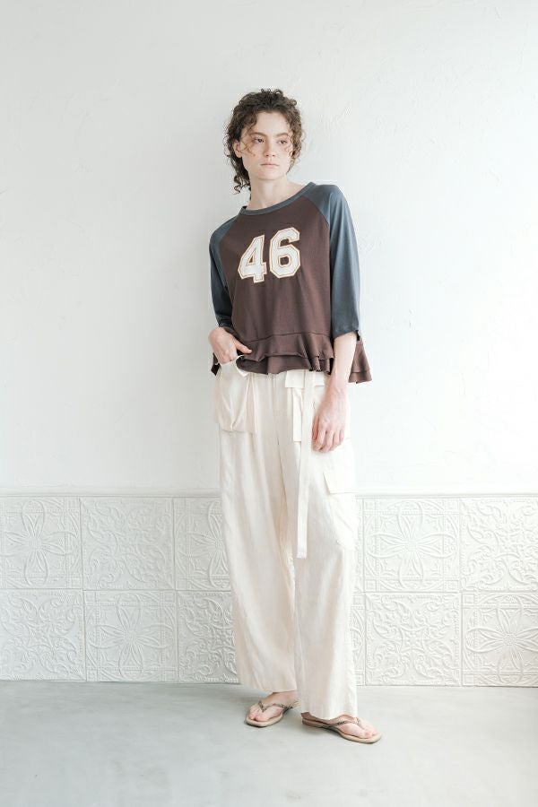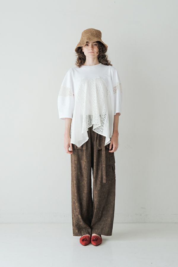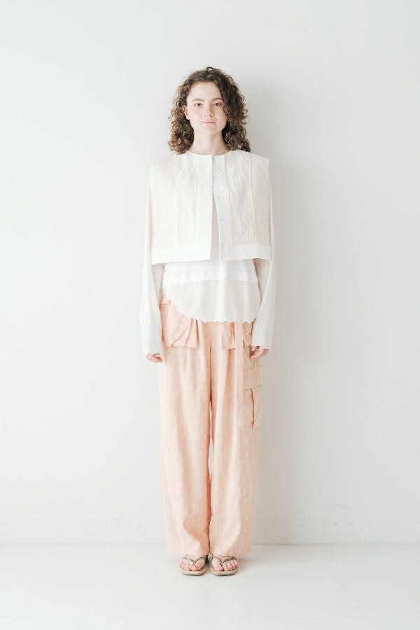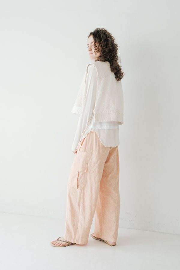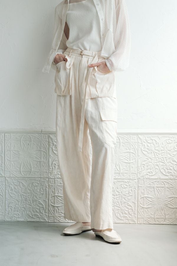 上品な光沢と立体感が魅力、大人のためのジャガードカーゴパンツ。 上品なドレープ感と高級感漂うジャガード生地を使用。立体的なアウトポケットや左側だけのカーゴポケットなど、アシンメトリーなディテールがトレンド感をプラスします。 ウエストは後ろゴム仕様に加え、取り外し可能なベルト付きでサイズ調節可能。 カジュアルなカーゴパンツながら、ジャガード特有の光沢感が大人らしさを演出。季節の変わり目にも取り入れやすく、シャツやジャケットとのきれいめスタイルはもちろん、スウェットやカジュアルニットと合わせても洗練された印象に仕上がります。