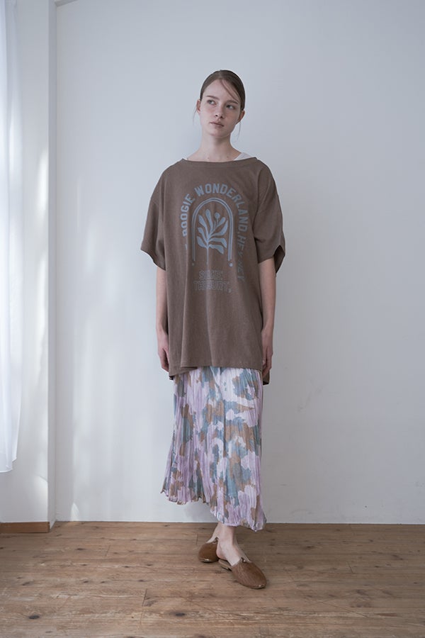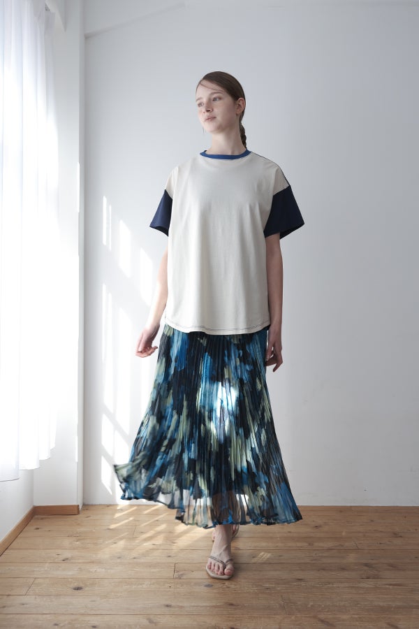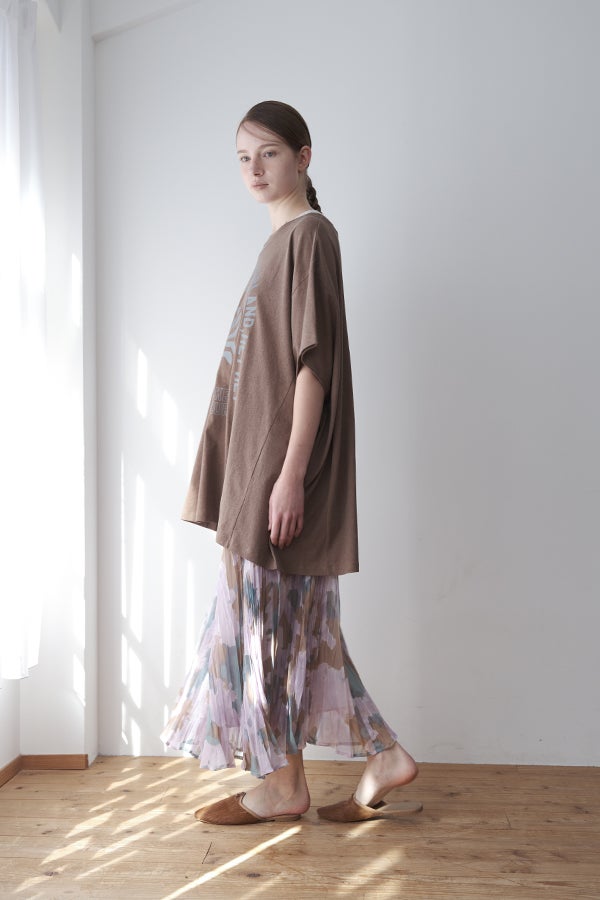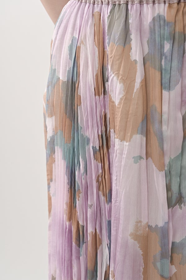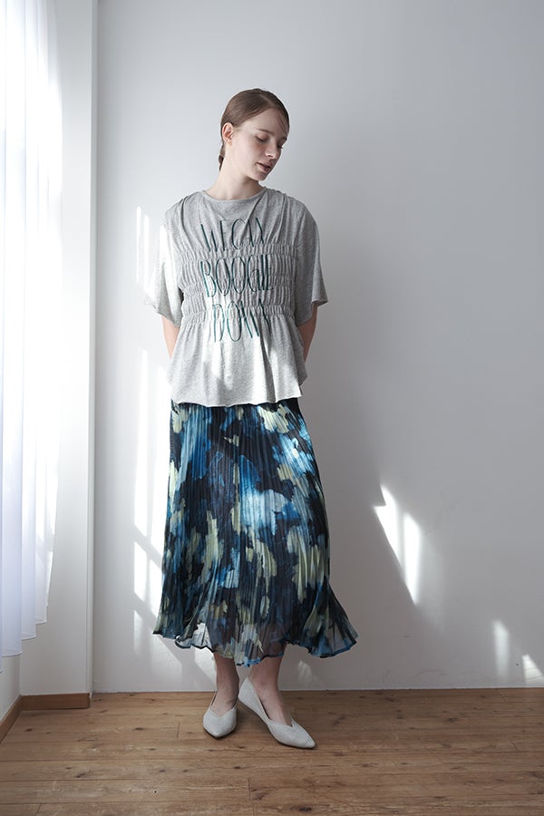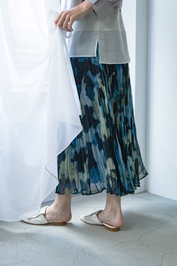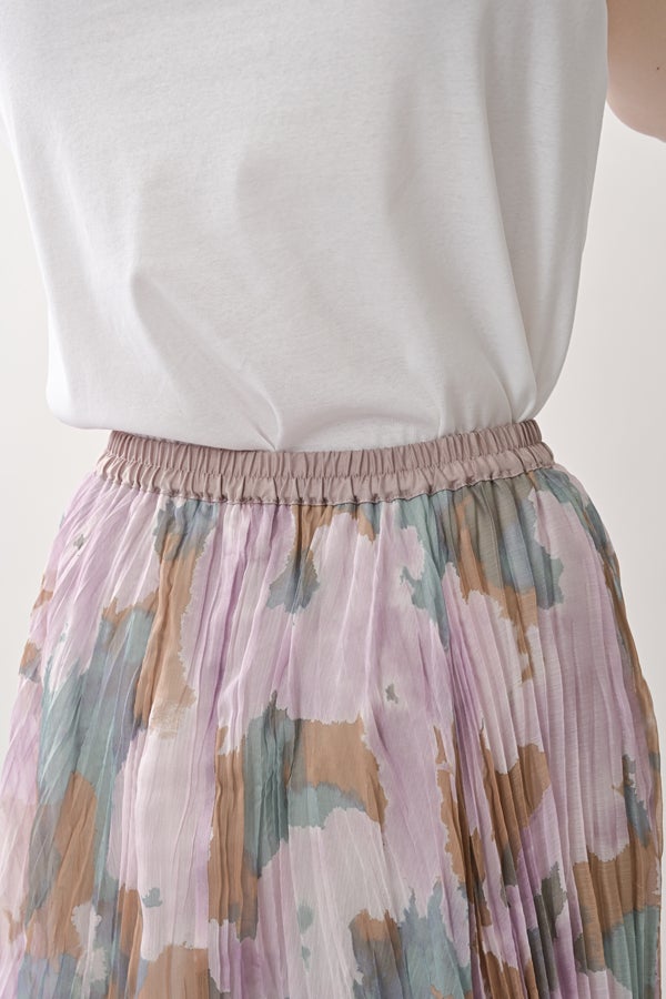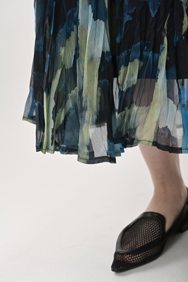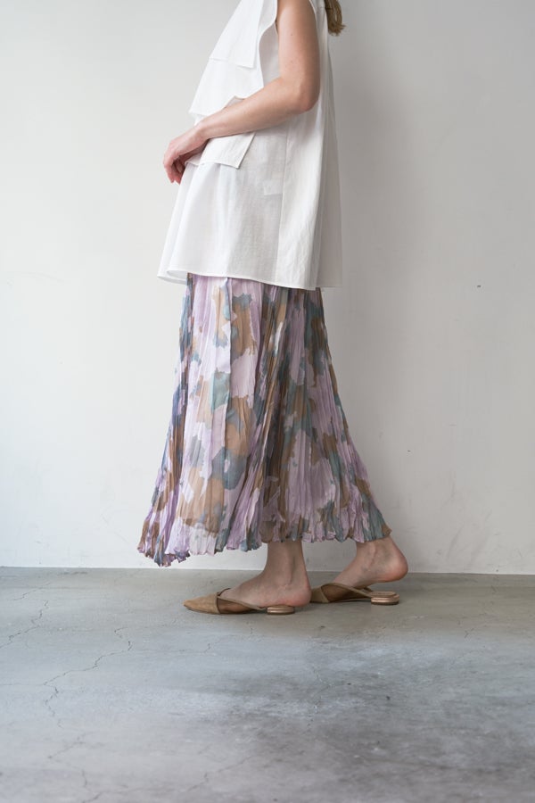 揺れを纏う、ランダムプリーツスカート。 オリジナルプリントにランダムプリーツを重ねた、上品なフレアシルエットの一枚。軽やかに広がる柔らかな素材が、歩くたびにニュアンスのある揺れを生み、女性らしい余韻を引き寄せます。 配色裏地がさりげない奥行きをつくり、ウエストは総ゴムでリラクシーかつフィット感のある着用感も魅力。 デイリーからセレモニーまで幅広く活躍。 シンプルなトップスを合わせるだけで洗練されたスタイリングに。軽やかさと華やかさを兼ね備えたこのスカートは、バレエシューズで上品に、ブーツでモードにと、足元次第で雰囲気を変えて楽しめます。 ●スカート丈違いの2サイズ展開 ●オリジナルプリント ●加工の特性上、1枚1枚の色差や仕上がりにバラつきが見られる場合があります。他の製品では味わえない良さをお楽しみ下さい。