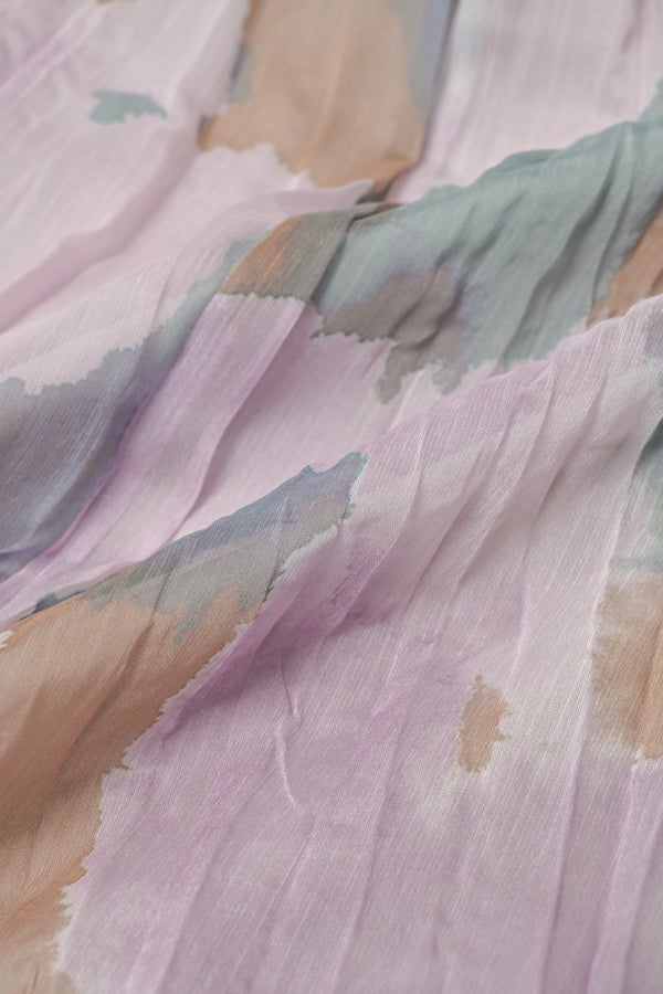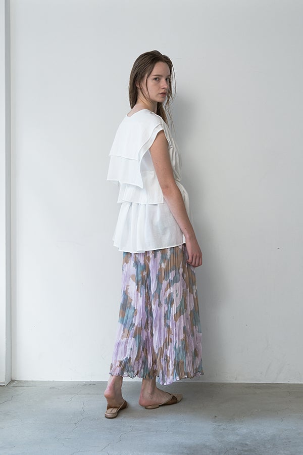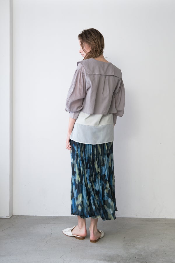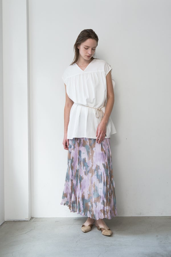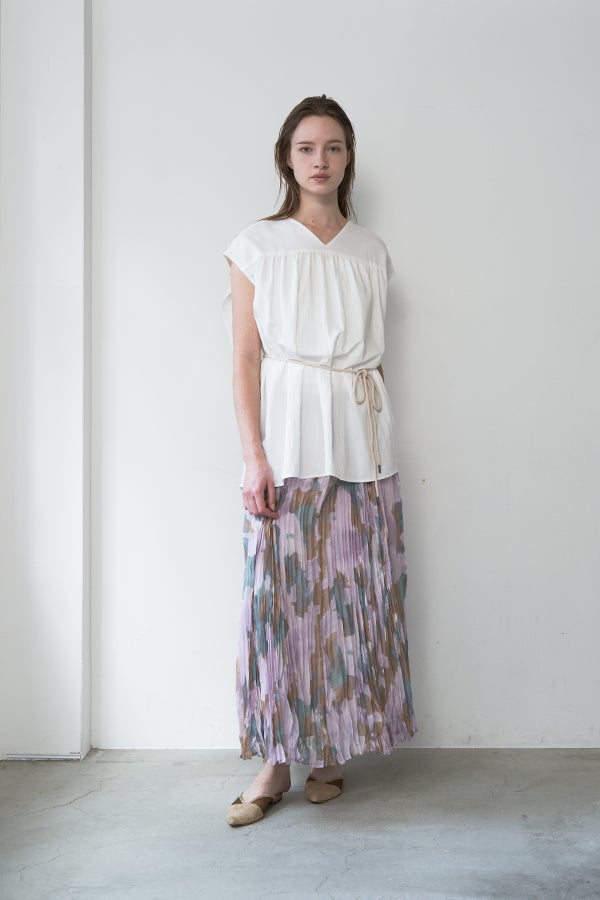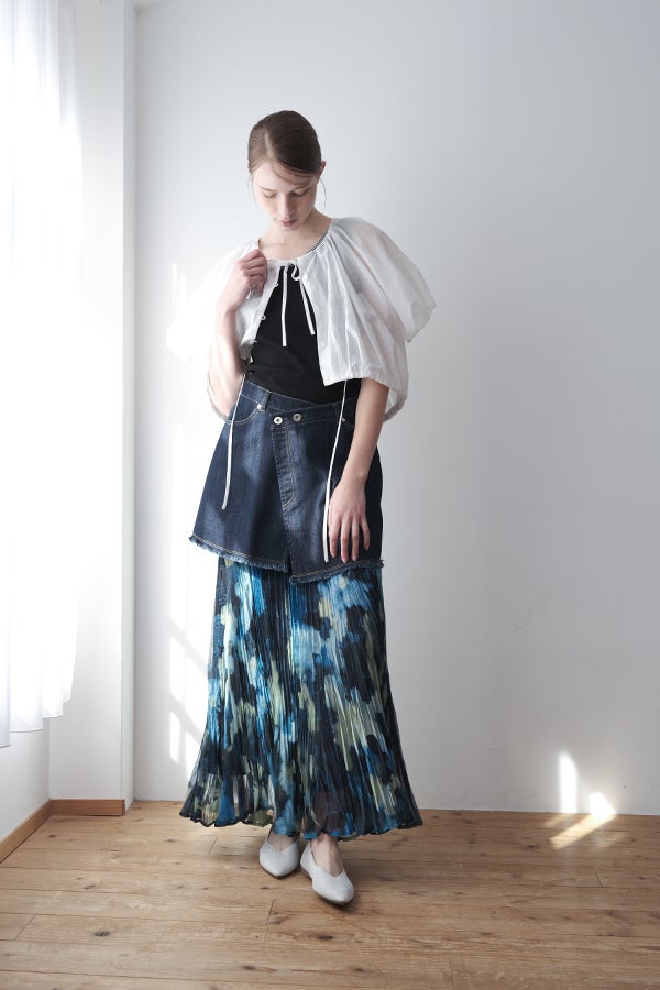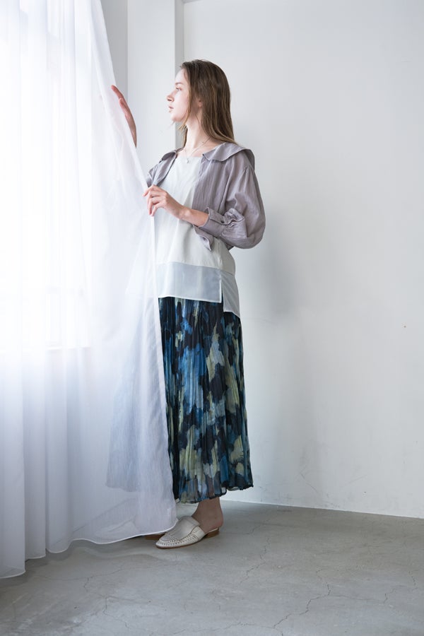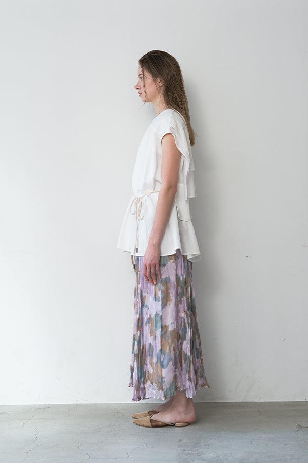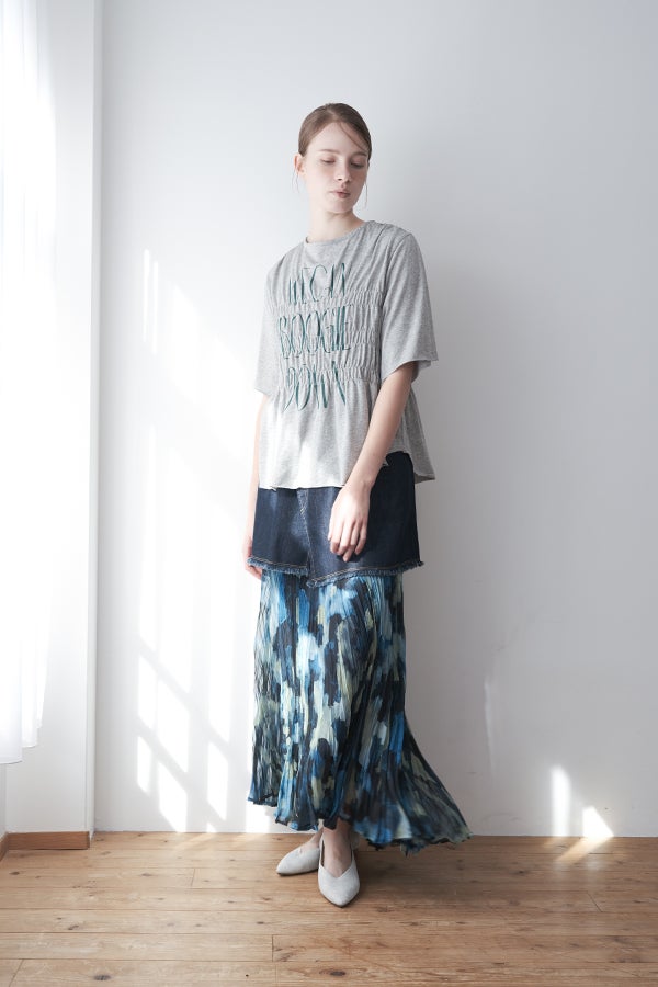 揺れを纏う、ランダムプリーツスカート。 オリジナルプリントにランダムプリーツを重ねた、上品なフレアシルエットの一枚。軽やかに広がる柔らかな素材が、歩くたびにニュアンスのある揺れを生み、女性らしい余韻を引き寄せます。 配色裏地がさりげない奥行きをつくり、ウエストは総ゴムでリラクシーかつフィット感のある着用感も魅力。 デイリーからセレモニーまで幅広く活躍。 シンプルなトップスを合わせるだけで洗練されたスタイリングに。軽やかさと華やかさを兼ね備えたこのスカートは、バレエシューズで上品に、ブーツでモードにと、足元次第で雰囲気を変えて楽しめます。 ●スカート丈違いの2サイズ展開 ●オリジナルプリント ●加工の特性上、1枚1枚の色差や仕上がりにバラつきが見られる場合があります。他の製品では味わえない良さをお楽しみ下さい。