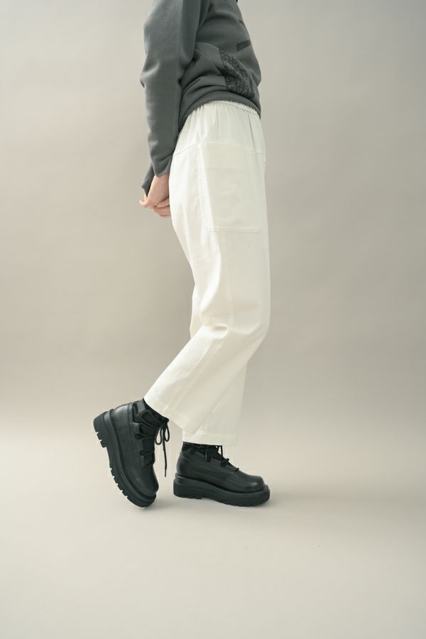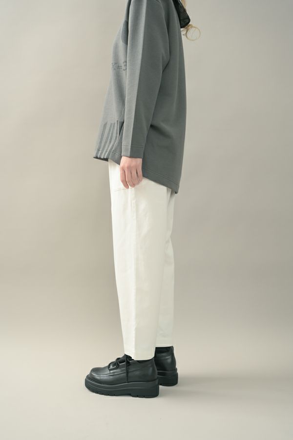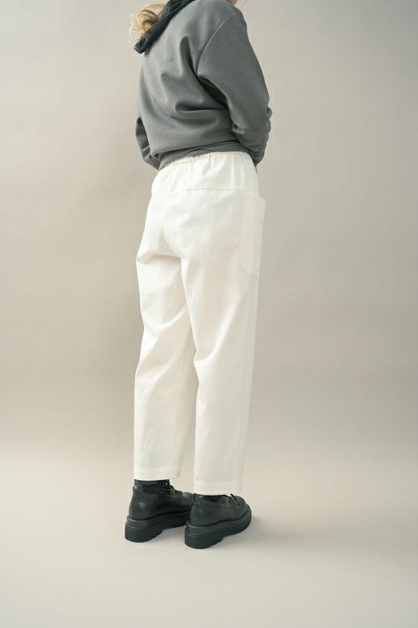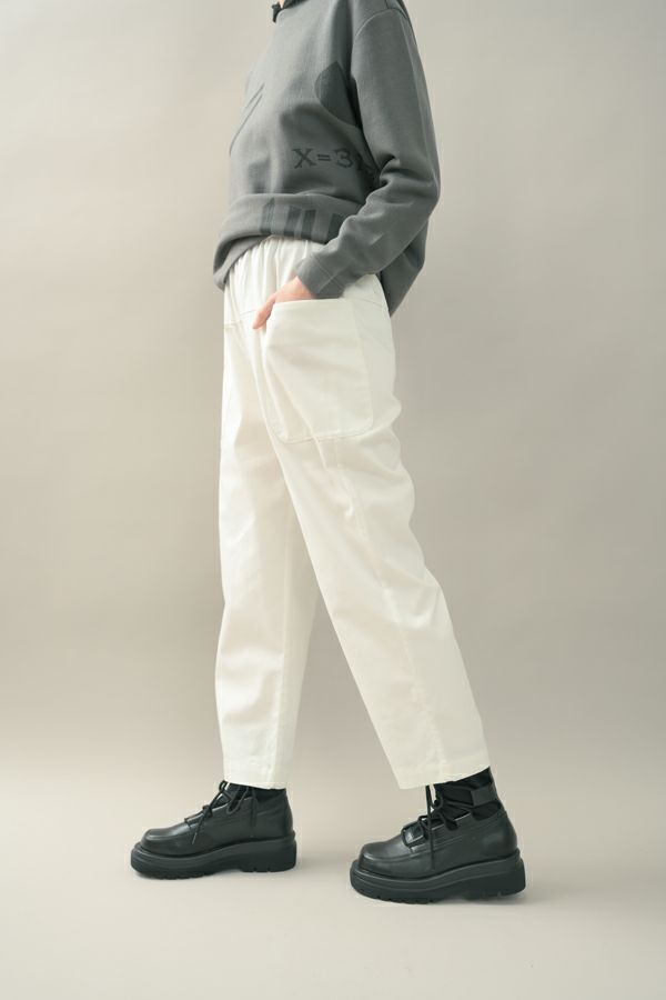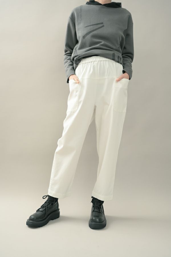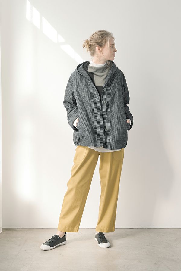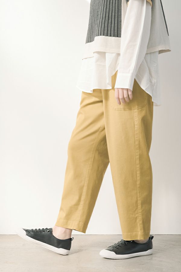 ストレッチ抜群!カジュアルでもきれいめでも着こなせるフルレングス丈のスリムパンツ。 ウエスト総ゴムで伸びを確保しつつ、中ヒップの切替えがポイント!お腹廻りがギャザーで膨らまず もたつかないのでスッキリ見えます。ヒップと太腿はサイドに付いた大きなパッチポケットが体型カバーの役割に。膝下からはふくらはぎのシルエットが出ない絶妙な分量感が嬉しい1着。 特殊な洗い加工を施し、ソフトで光沢感のある風合いに。膝がでにくくシワになりにくいのが特徴です。目を惹くイエローが着こなしのアクセントに! ライトブルゾン(24228-6526C-R/24228-6521M-R)や、ヒップが隠れるトップス(24228-1573J-R)などの下に合わせてスッキリ着こなすのがおススメです。