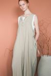 リラクシーカジュアルにピッタリな、抜け感大人コンビネゾン。 ヘリンボン地の綿/麻にレーヨン系素材の入った滑らかな質感。柔らかな肌触りが合わさり着心地良く、カジュアルだけどakaneらしさのある大人っぽいアイテムです。 ゆとりのある身幅に大きなカーブをつけた袖ぐりが特徴で、下に着るものと羽織りものを選ばず、脇ゴムと前後のベルトバックルでサイズ対応出来ます。背中に入れた長めスリットは背中をスッキリ綺麗に見せ、後ろウエストのゴムギャザーはヒップ周りをカバーし腰高に見せ、大人が着映える仕掛けに。 インナーに合わせたタンクトップと透け感のある羽織りでライトなカジュアルスタイルを提案。