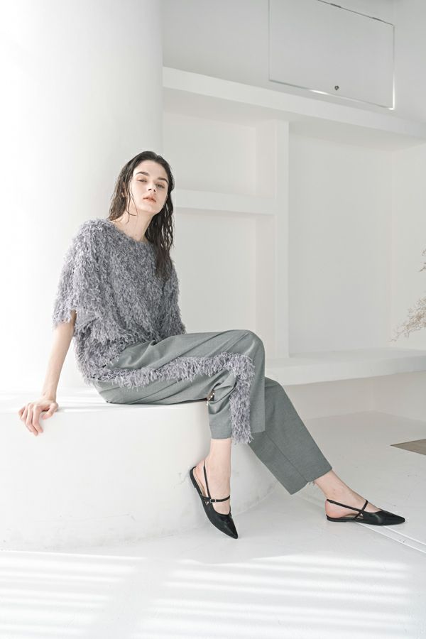 フェザーが揺れる、センシュアルなテーパードパンツ。 両サイドにあしらったフェザーが、動くたびに優雅な表情を生む一着。マニッシュな生地を贅沢に使用しながらも、リラックス感のあるテーパードシルエットが大人のフェミニティを演出します。 ウエストには大きめの2タックを施し、後ろゴム仕様でストレスフリーな履き心地に。 オケージョンシーンでは、同素材のプルオーバー(25228-1413D-G)とセットアップで華やかな印象に。クリーンなシャツスタイルはもちろん、Tシャツやスウェットと合わせてカジュアルダウンするのもおすすめ。 トップスを選ばず、幅広いスタイリングにマッチする万能パンツです。