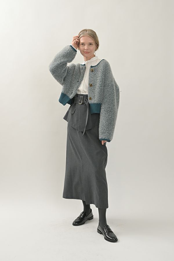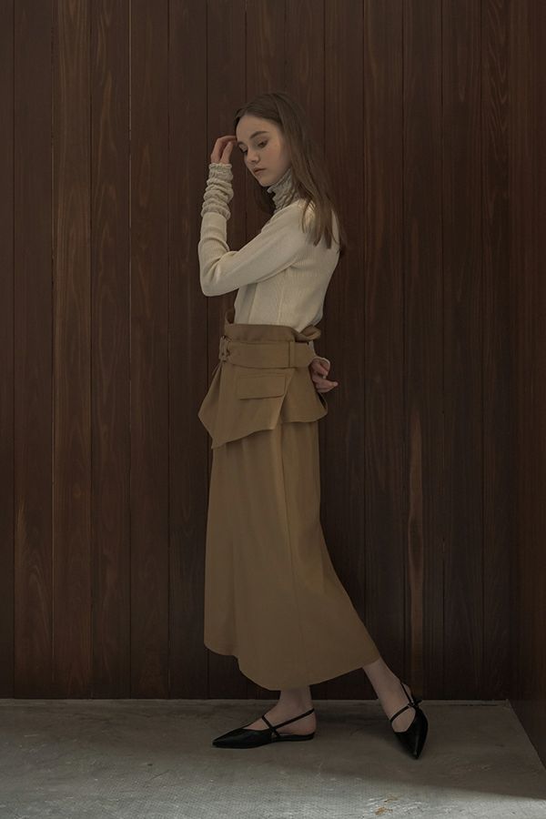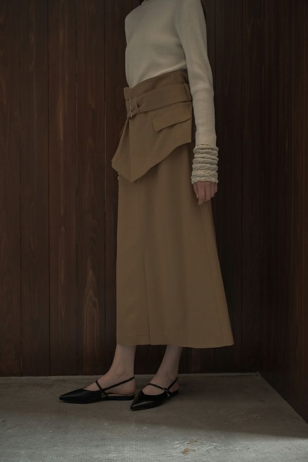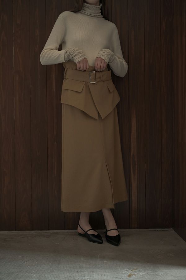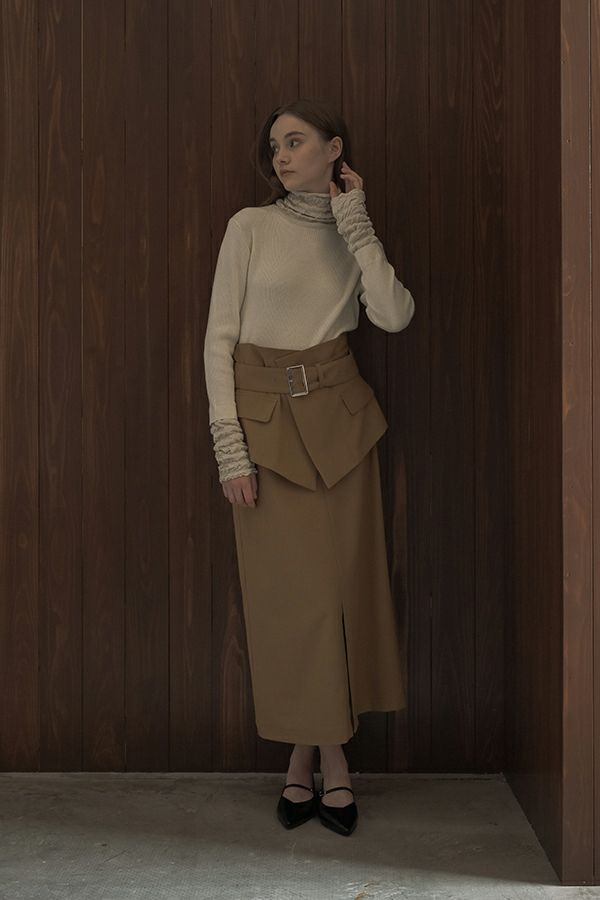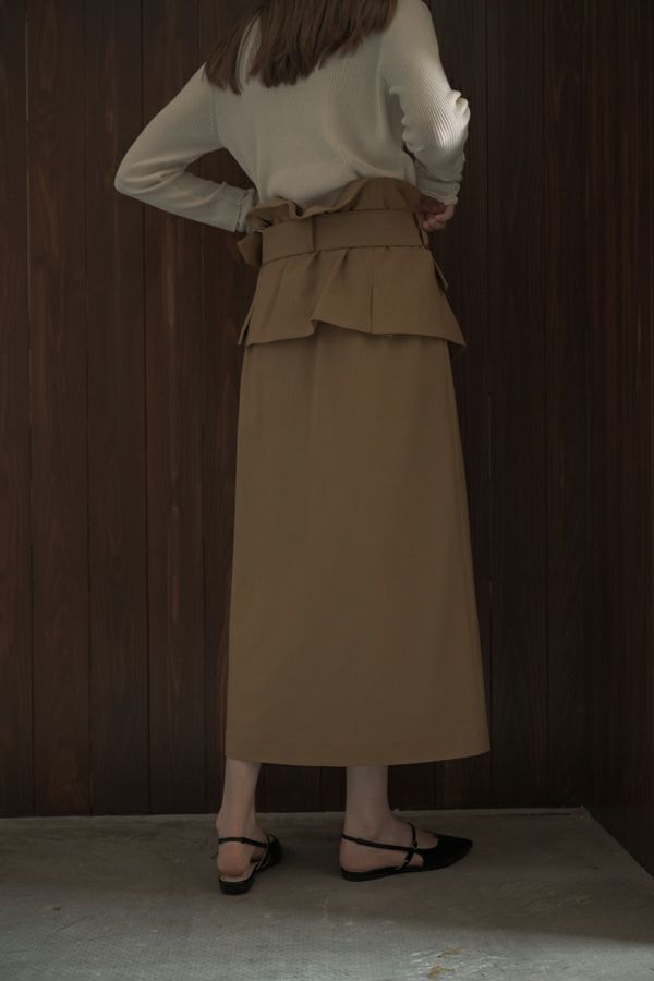 旬なコルセットがセットになったタイトスカート。 スカートは ほどよいタイトライン。前裾にベンツ開きを入れて軽さを出し、後ろウエストはゴム仕様になっておりシンプルなスカートとしてもかなり重宝します。 取り外し可能なコルセットは、ウエストをほっそり見せてくれるペプラム風デザインで手持ちアイテムとの幅広い合わせて変化を楽しめます。 スカートはコルセット無しでも使いやすく、シンプルなTシャツや、ブラウス合わせがおすすめで、トップスをインして合わせるだけで着映えします。 トップスにフィット感のあるリブトップスとレイヤードしてワンピース風のスタイリングもおススメ。勿論シャツやブラウスでオフィスカジュアルに合わせても◎