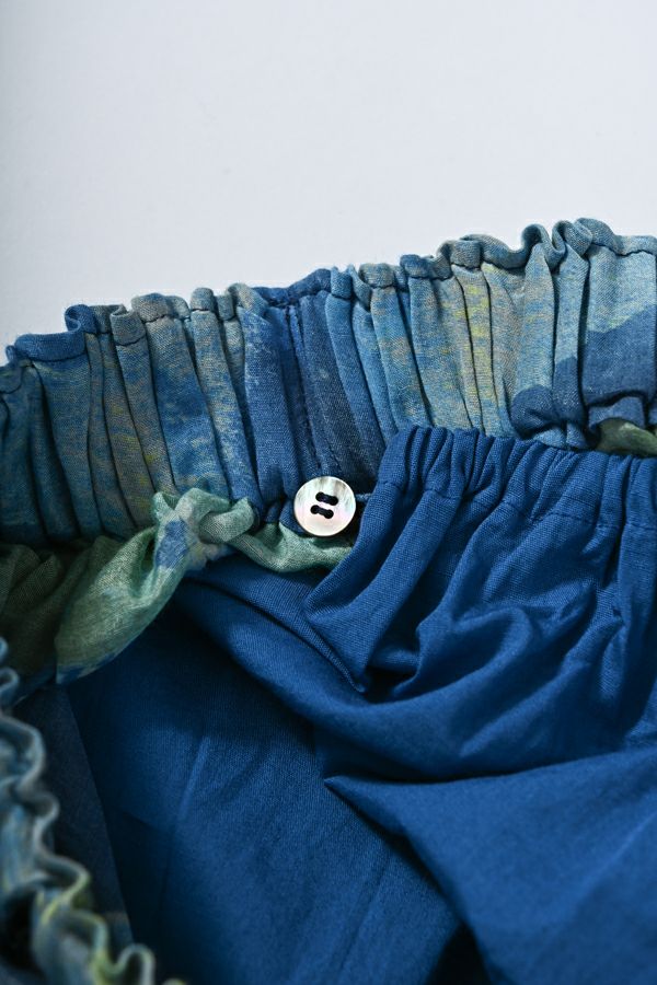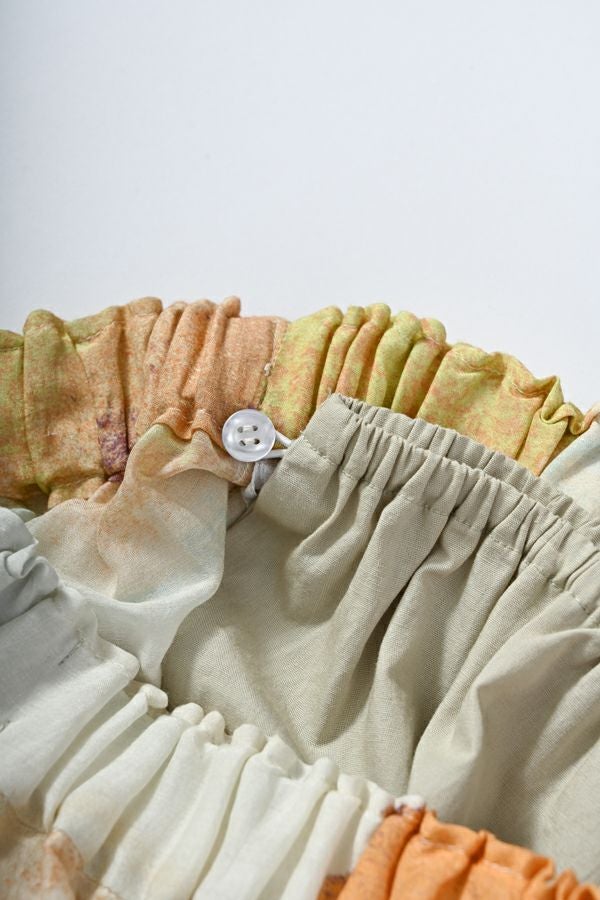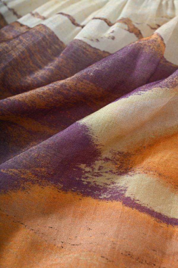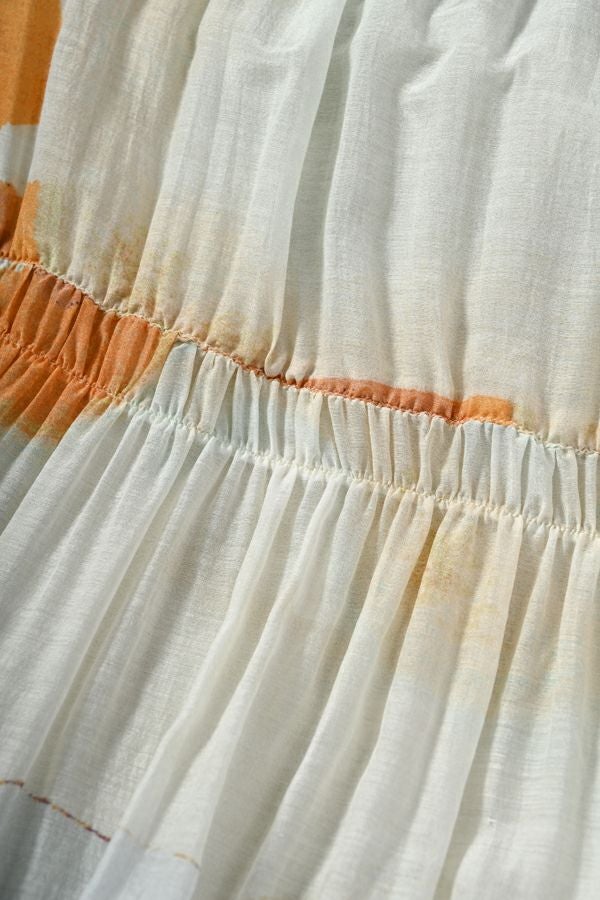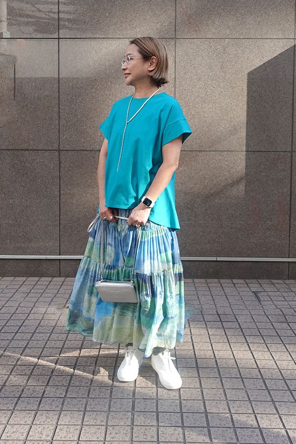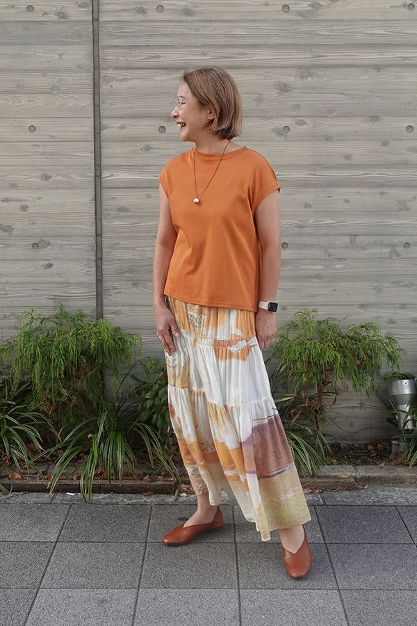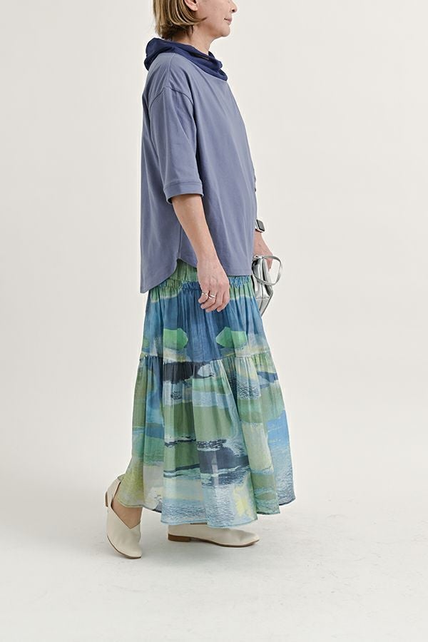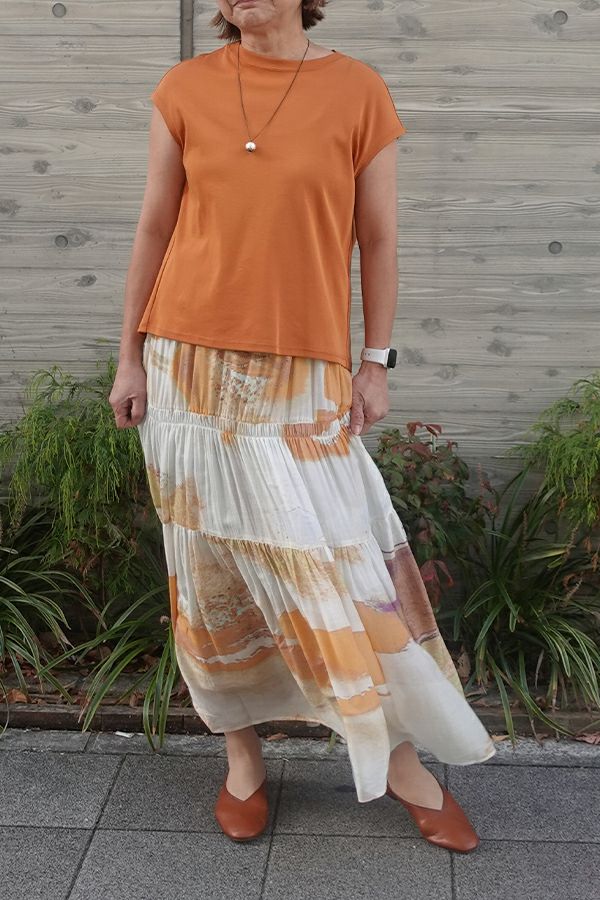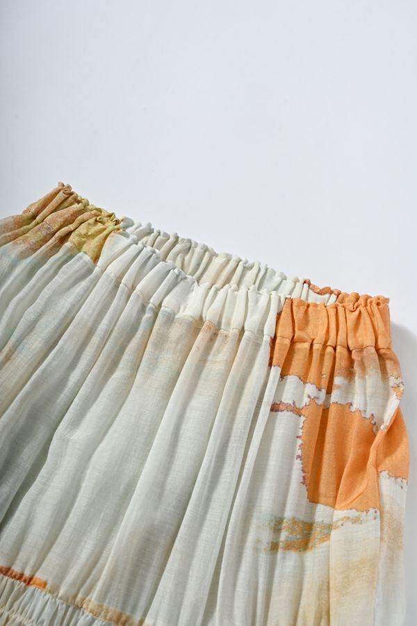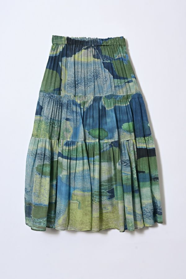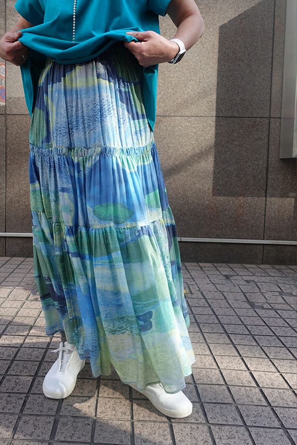 手描き風アート柄のプリントが華やかなティアードスカート。 とろりとしたシルク特有の風合いと薄く落ち感のある素材が、肌触りも抜群で、歩く度に贅沢に揺れる生地感がドラマティック。ウエストゴム仕様で着やすく、ボリュームを抑えてすっきりとしたシルエットに仕上がっています。 夏のリゾートムードを感じさせながらも、都会的な大人の色合いが魅力で、シンプルなトップスに合わせるだけで着映えする一着です。 ●堅牢度(色落ちや色移り)が安定しないのでドライクリーニングにしてください。