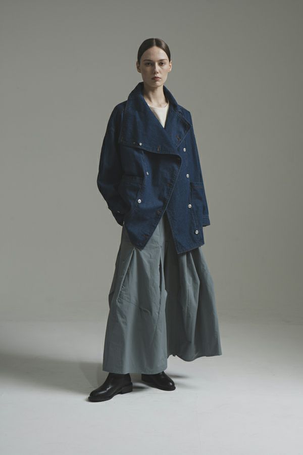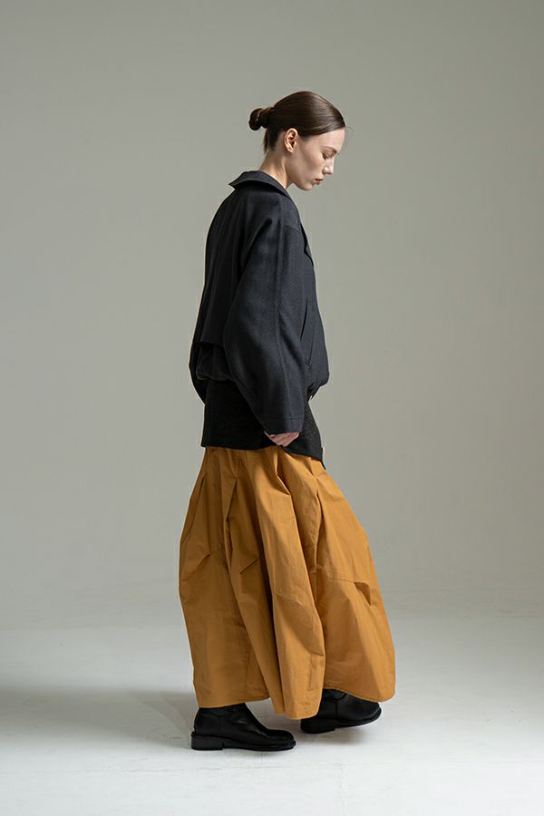 斜め切り替えが叶える立体シルエット、ツイストタックスカート。 しっかりハリ感のある綿/ポリエステルのタフタ素材を使用しており、ポリエステル混ならではのシワになりにくさと、カジュアル過ぎない上品な風合いを兼ね備えています。 ヒップ周りを斜めに切り替えることで、視覚的にスッキリとした印象を与え、スタイルアップ効果も抜群。タックが生み出すふんわりとしたシルエットが女性らしいニュアンスを添え、後ウエストゴム仕様で快適な着心地も実現しています。コンパクトなトップスを合わせてメリハリを意識すれば、より洗練されたコーディネートが完成します。日常からお出かけまで、幅広く着回せる一着です。