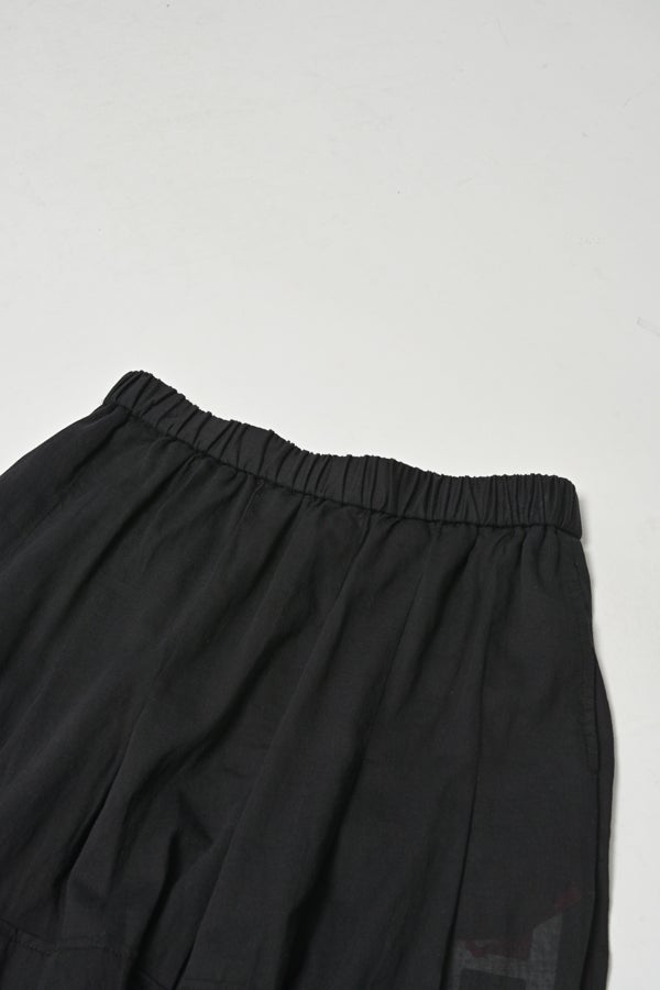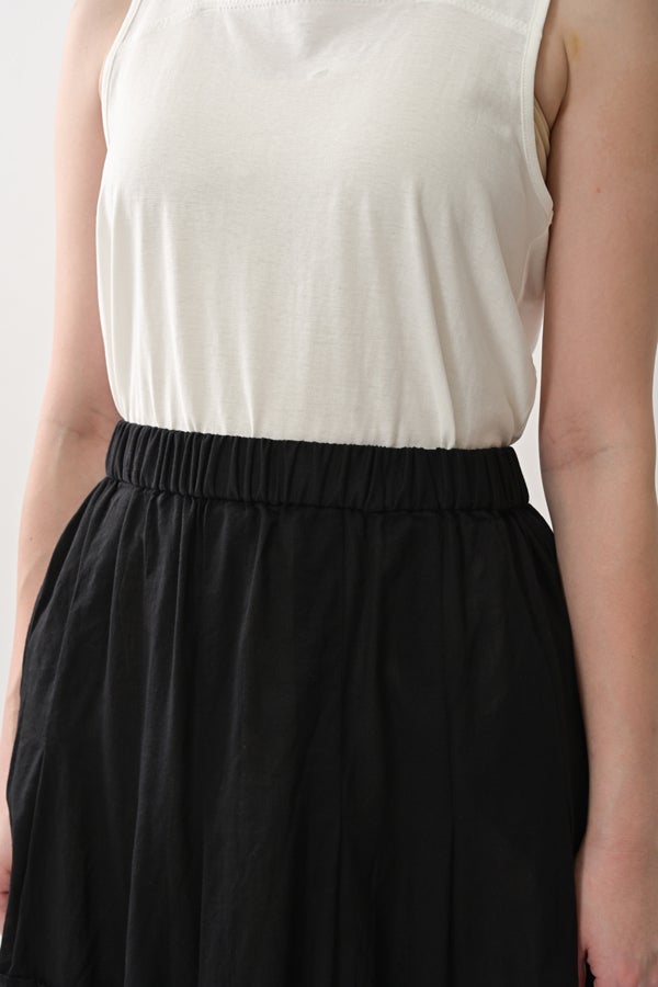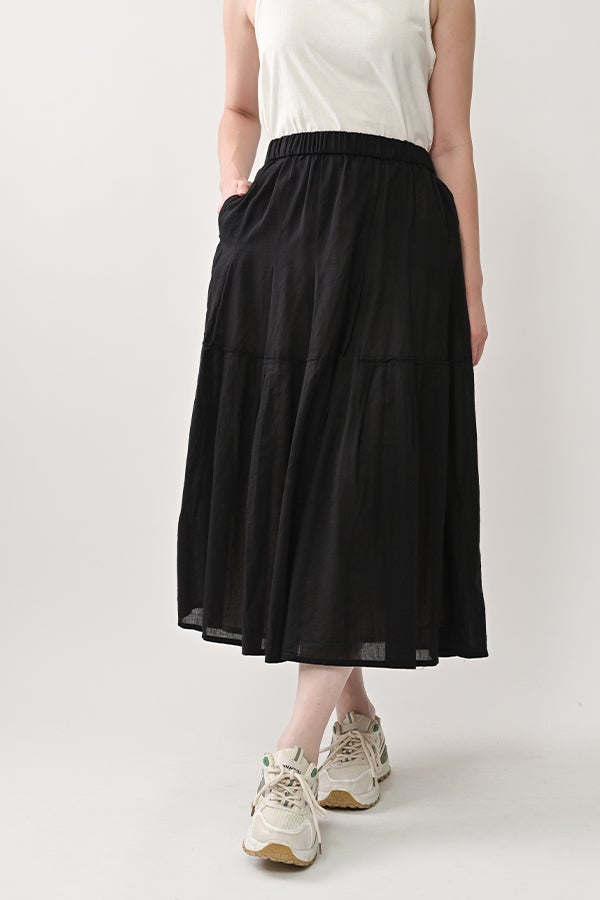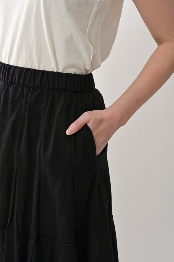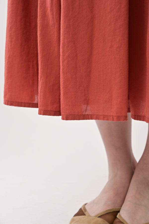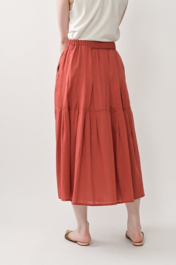 軽やかに揺れる、大人のタックスカート。 繊細な細番手コットンをガーゼのようにふんわりと織り上げた、やさしく包み込むような素材感が魅力の一枚。ウエストは総ゴムのイージーな着用感ながら、ウエストからヒップにかけては広がりを抑えるパターンを丁寧に計算し、すっきりとした大人のシルエットに仕上げています。 切り替え下に施した細かなタックは、裾に向かって自然なボリュームを生み、歩くたびに軽やかな揺れを演出。甘さを抑えた品の良い立体感が、どんなトップスにも上手く馴染みます。 ショート丈のトップスと合わせれば、バランスよくまとまる夏らしいスタイリングに。足元はサンダルやスニーカーで抜け感をつくり、優しいカジュアルを楽しむのがおすすめです ●配色オーバーブラウス(26168-4096B-R)とセットアップ可