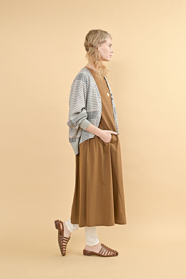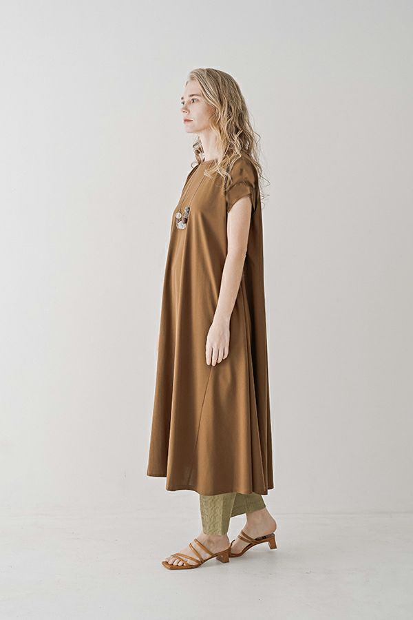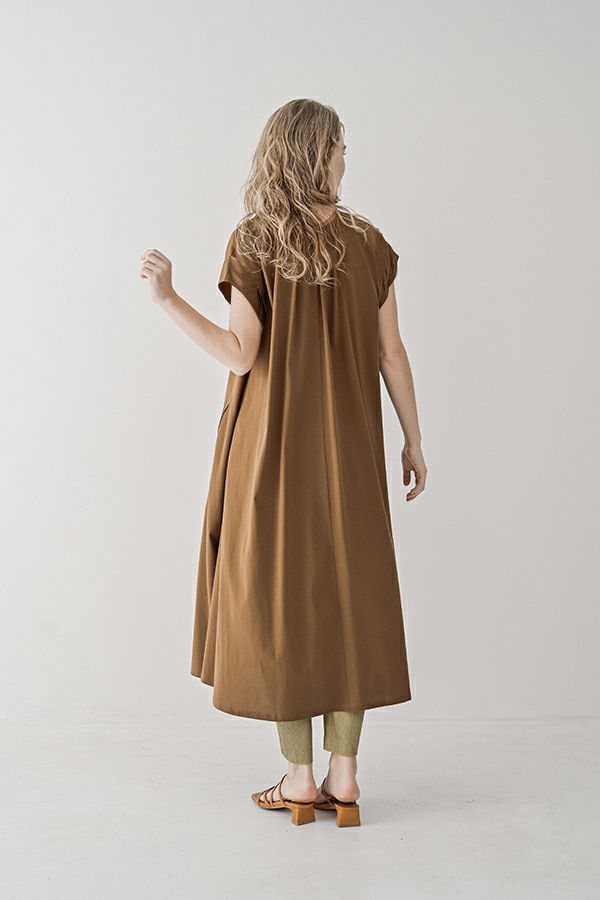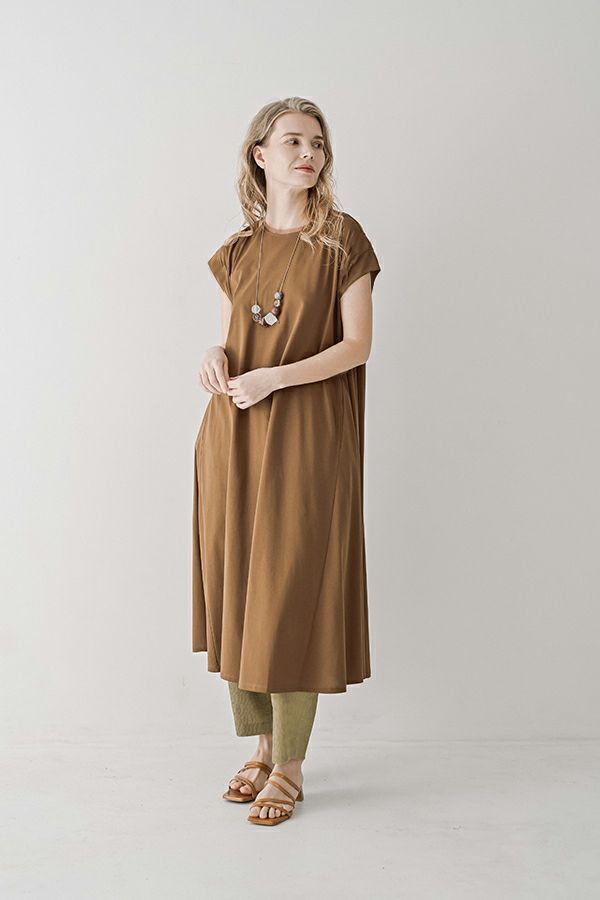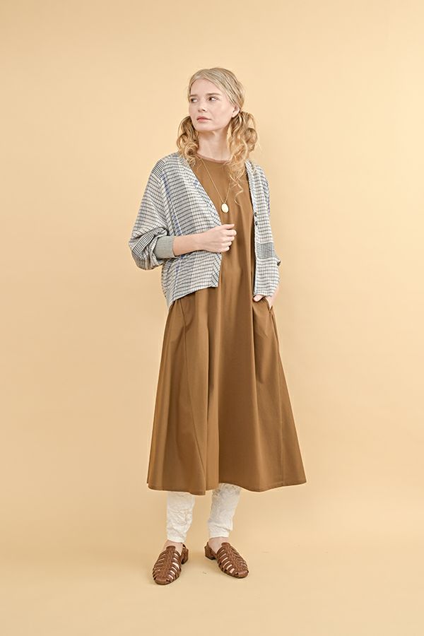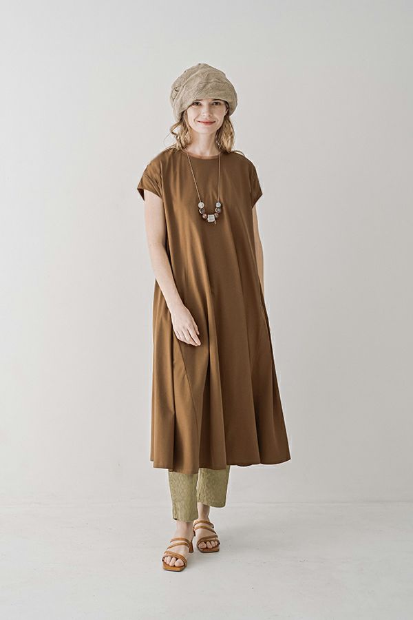 お待たせしました!発売からご好評いただいている半袖ワンピース!待望の再入荷です。新色グリーンが加わり、全4色に! 薄手のシルケット加工のカットソー素材は光沢感あり発色性も良く落ち感もあるので分量感たっぷりでも軽くて楽チン。 体を締め付けず着心地満点のきれいめワンピース。 ドロップショルダーと広めの袖で肩回りをカバーし、前のタテ切替えが全体をスッキリ見せ 脇線が無いのでフレアーラインがきれいにでるシルエットです。 襟元は薄いオーガンジーを使い華奢な印象で顔周りを華やかに見せます。レギンスやソックス+スニーカーやニットボレロと相性GOOD! 追加ブラウン/新色グリーン 4月下旬入荷予定