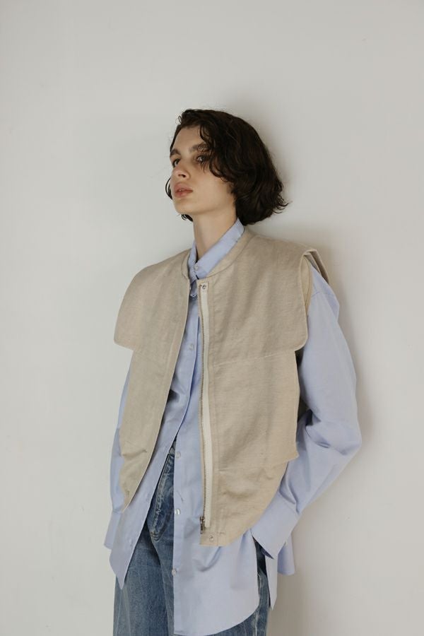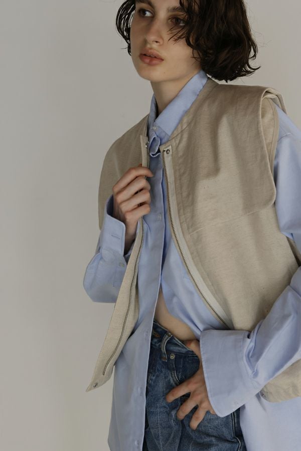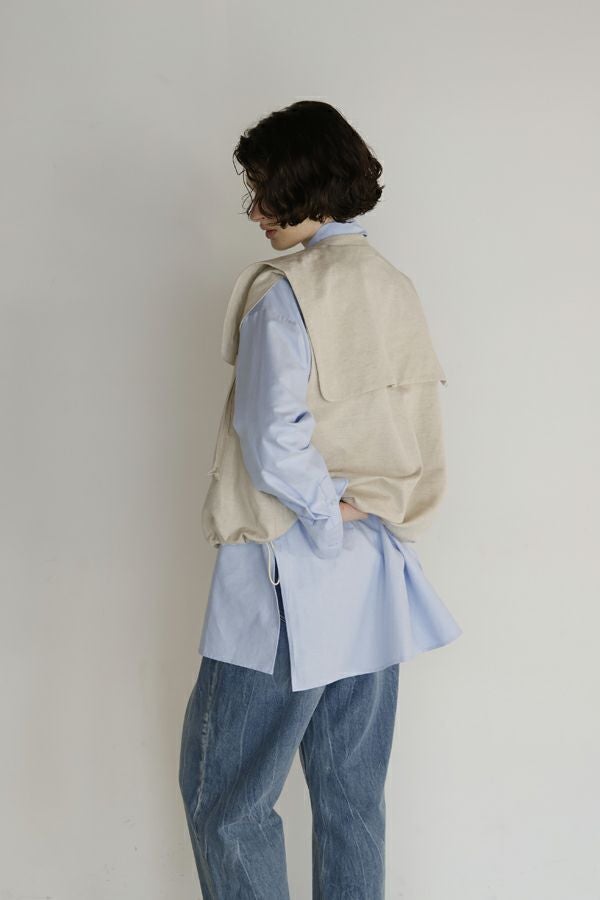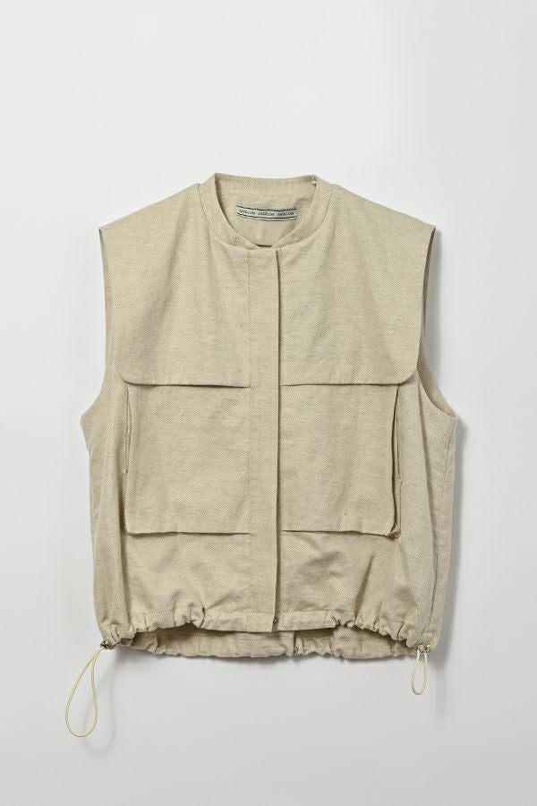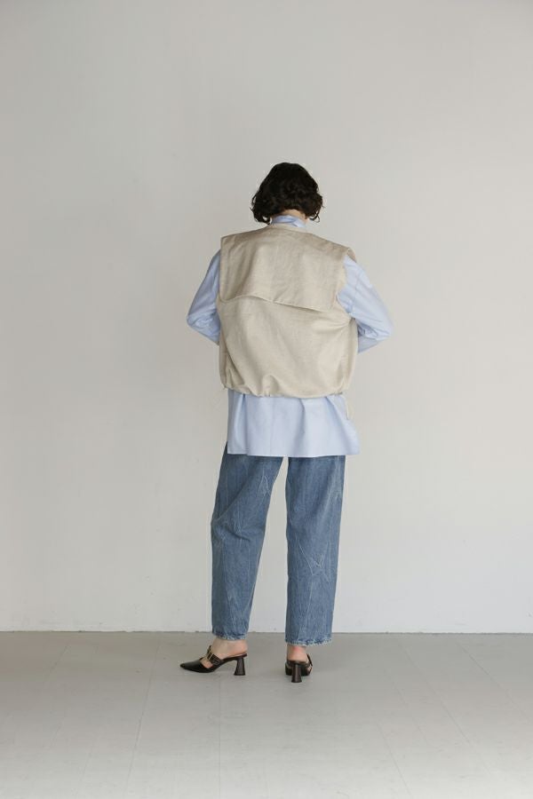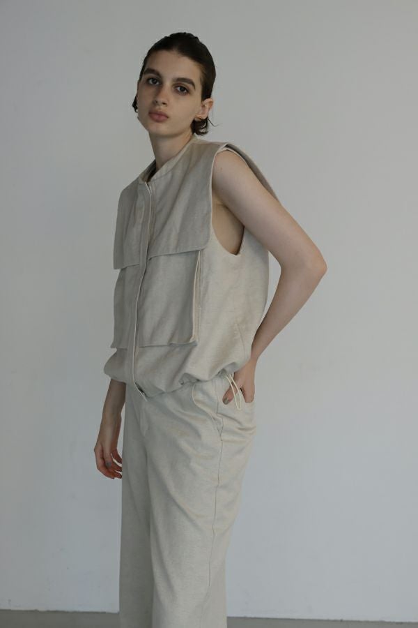 フラシヨークが目を惹く大人のカジュアルベスト。 吸放湿性、通気性に優れシャリ味のある麻をヨコ糸に、柔らかい綿をタテ糸に使用してうまく交織された天然素材でも高級感のあるツイル素材です。生地洗いを入れてから生産している為、手洗い可能! 前後のフラシヨークがアクセントに。特に 前はポケットのフラップを兼ねたデザインになっており、ポケットは上からと横から両方使える2重ポケット構造です。 まだ寒さが残る春先は、インナーにロンTEEなど袖のあるものを着用頂ければ、シーズン通して長く活用頂けます。 ●同素材でツイルワイドパンツ(25153-9029D)も有。 ●セットアップ可