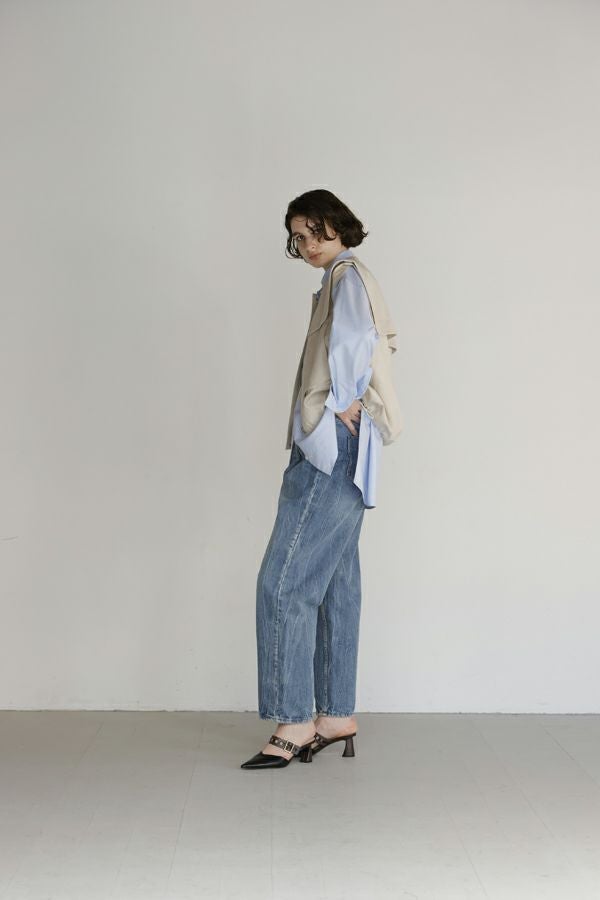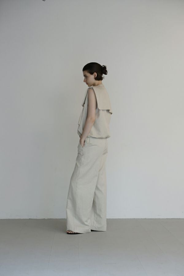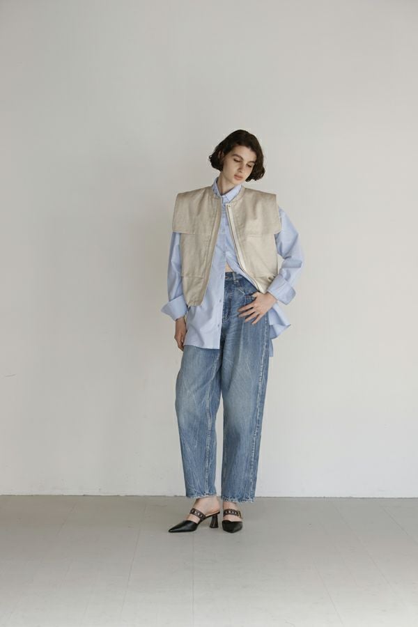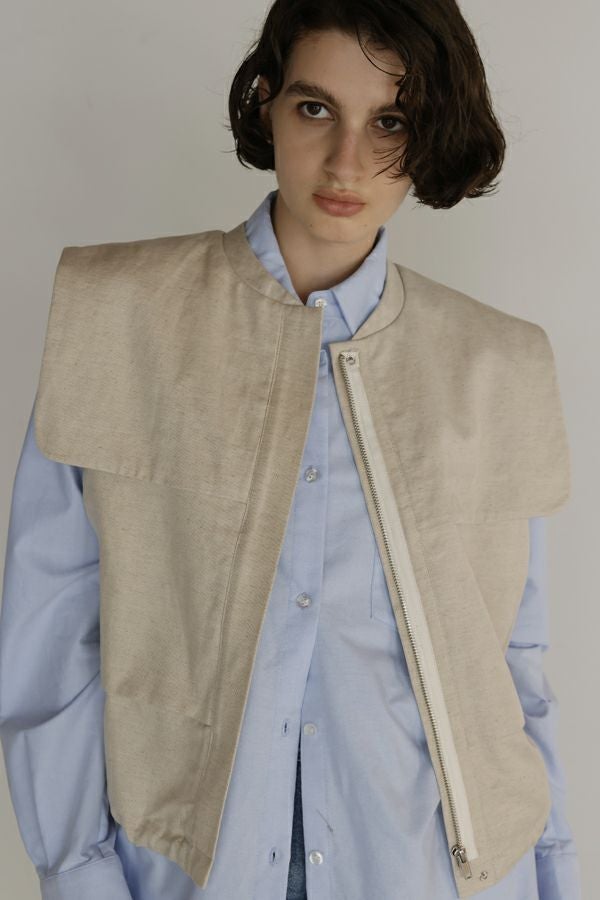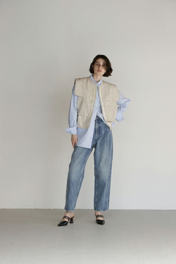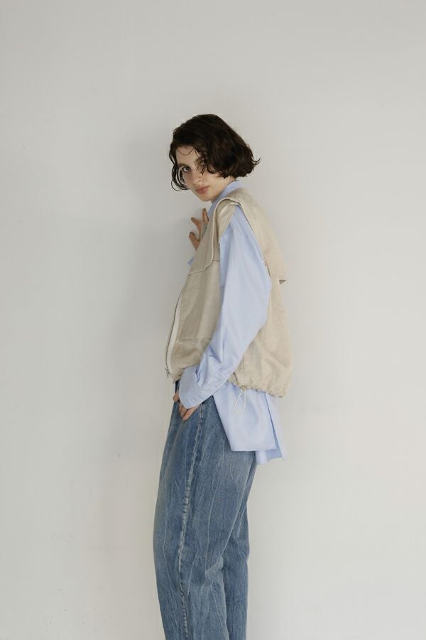 フラシヨークが目を惹く大人のカジュアルベスト。 吸放湿性、通気性に優れシャリ味のある麻をヨコ糸に、柔らかい綿をタテ糸に使用してうまく交織された天然素材でも高級感のあるツイル素材です。生地洗いを入れてから生産している為、手洗い可能! 前後のフラシヨークがアクセントに。特に 前はポケットのフラップを兼ねたデザインになっており、ポケットは上からと横から両方使える2重ポケット構造です。 まだ寒さが残る春先は、インナーにロンTEEなど袖のあるものを着用頂ければ、シーズン通して長く活用頂けます。 ●同素材でツイルワイドパンツ(25153-9029D)も有。 ●セットアップ可