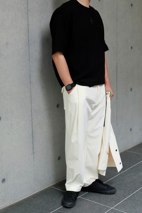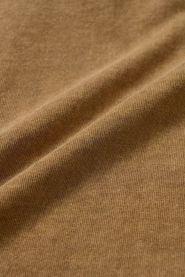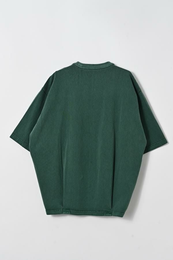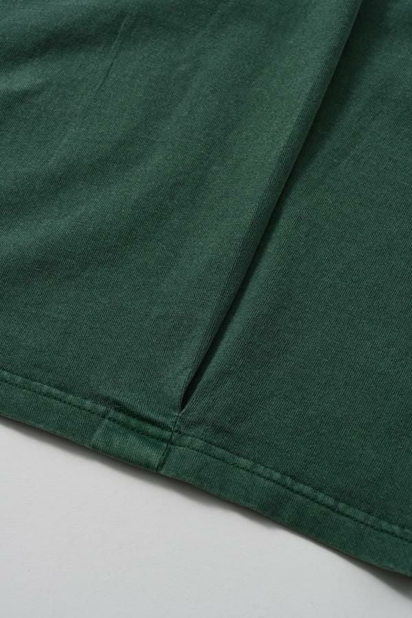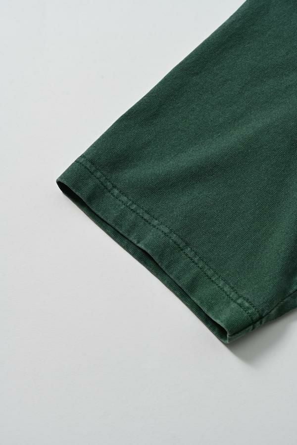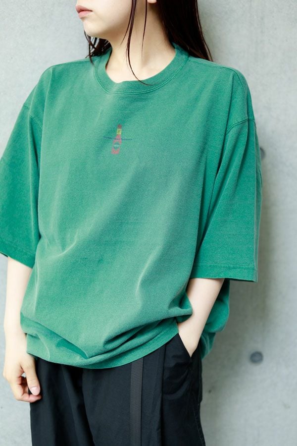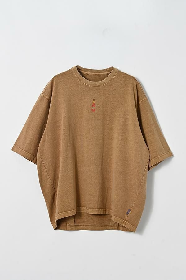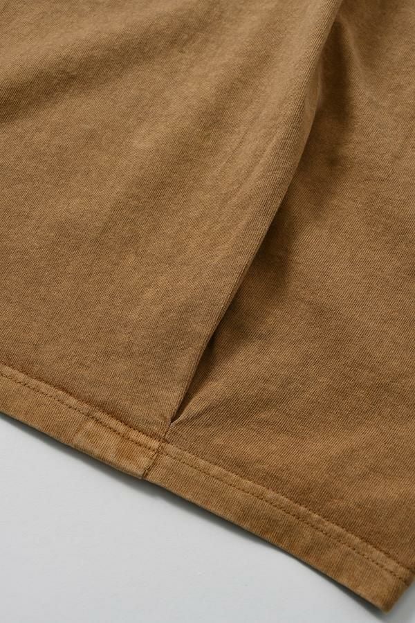 後ろ裾にタックを入れ、丸みのあるシルエットになっています。プリント後、製品染めをするため着古したような雰囲気に仕上げて。プリントはかすれ風の染み込みプリントでユーズド感を醸し出しています。