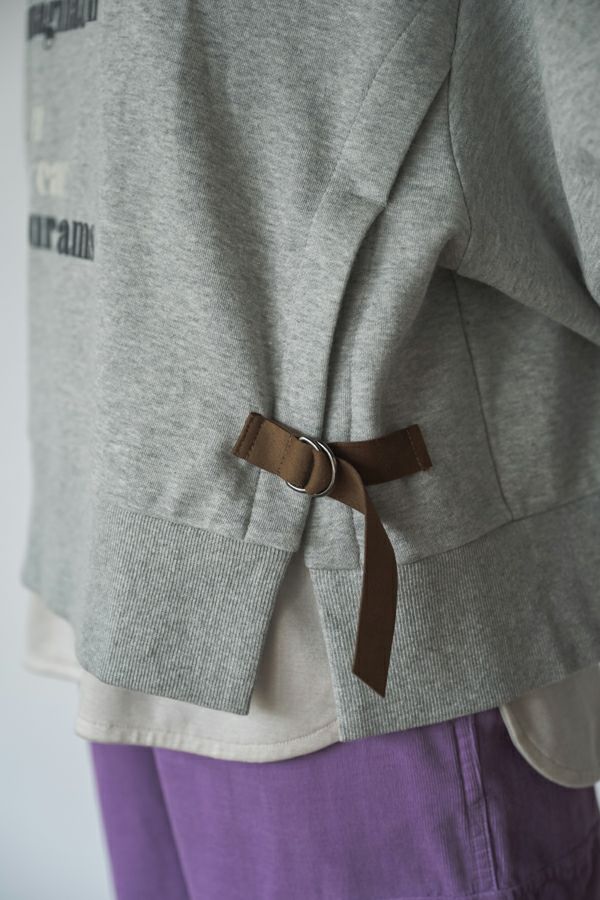 袖のシルエットが際立つショート丈裏起毛トレーナー。 カジュアルになりがちな素材感を"大人が着れる"トレーナーに仕上げた拘りのアイテムです。 右脇に布帛ポケット、左脇に合皮テープ+Dカンがつくデザインでメリハリをつけ、胸元にはアンバランスに入るフロッキーロゴプリントで視線を上に散らすことでスタイルアップ効果も。 袖口にタックを入れて、印象的なパフ袖にすることで他と差別化できる要素をプラス。 裏起毛素材なので、暖かくて柔らかい風合いです。