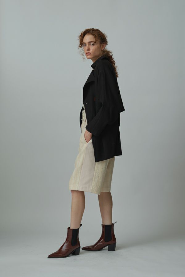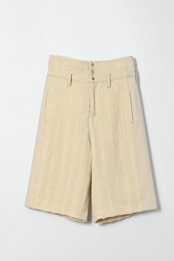 交差する温もりとエッジ。ウールツィードショートパンツ。 温もりのあるツイードの素材感と構築的な切り替えラインが織りなす立体シルエットで、スタイルに深みと緊張感をもたらし、都会的なムードを演出。 足元は白ソックス×パンプスで抜け感を加えて。トップスはタイトにまとめれば、丈感がより際立ち、バランスの妙が光るスタイリングに。オンにもオフにも着回せるからこそ、シーズンの軸になる一本です。 クラシックに偏りすぎない。甘さにも頼らない。 モードと知性を内包した、洗練のバランスボトム。 ●ウールツイード切替ベスト(25233-5731E)とセットアップ可