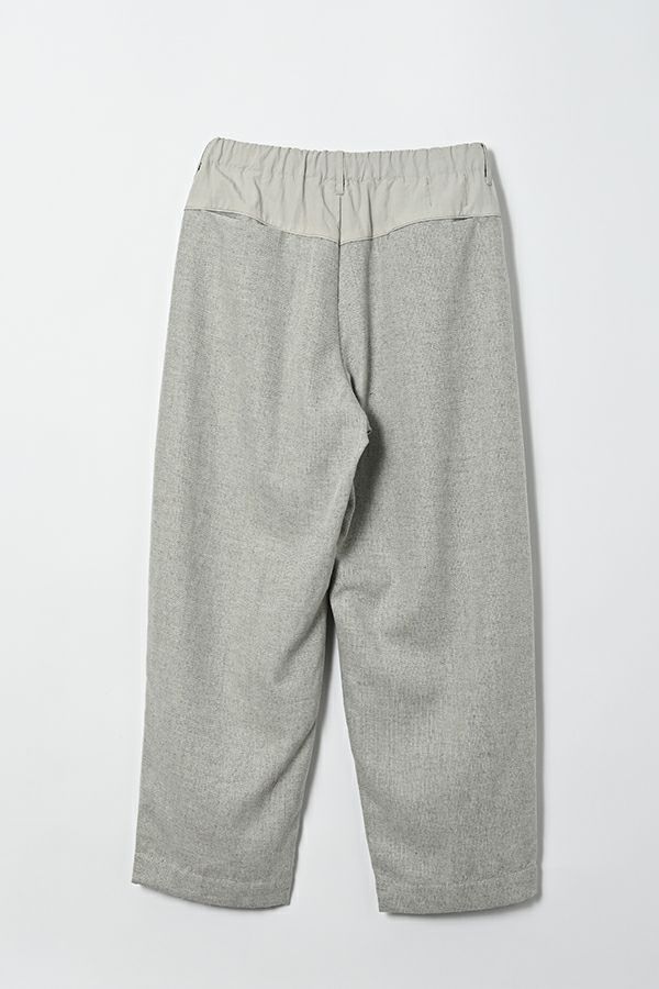 気負わず、品よく。計算されたシルエットのイージートラウザー。 リラックスした穿き心地なのに、きちんと見えが叶う。そんな理想をかたちにした、太めテーパードのイージーパンツ。 ヒップ周りは適度なゆとりで動きやすく、膝下からすっきりとテーパードしたラインが、大人のカジュアルに上品さを添えます。大きめのタックで横から見たときの立体感も◎。 ウエストは後ろゴム+コード仕様でサイズ調節可能に。コード先を表に出さずに着用できる、考え抜かれたデザインに注目。裏から紐を引っ張り、内側で絞めるとフロントが垂れてしまうことがありますが、帯裏のベルトループに紐を通すと軽減できるようになっています。見た目もすっきりしたウエストに。 素材には、ウールのような表情をもつポリエステルのランダムヘリンボーンを採用。太さの異なる織り柄がさりげないニュアンスを生み、ほどよいハリ感でシルエットもきれいにキープ。オン・オフ問わず活躍してくれる一本です。