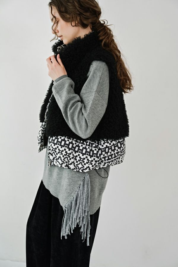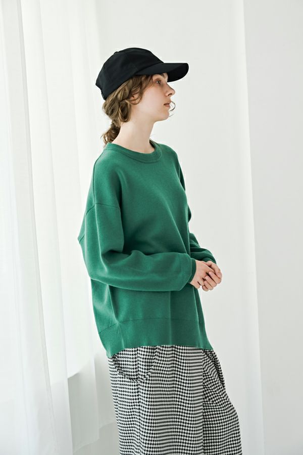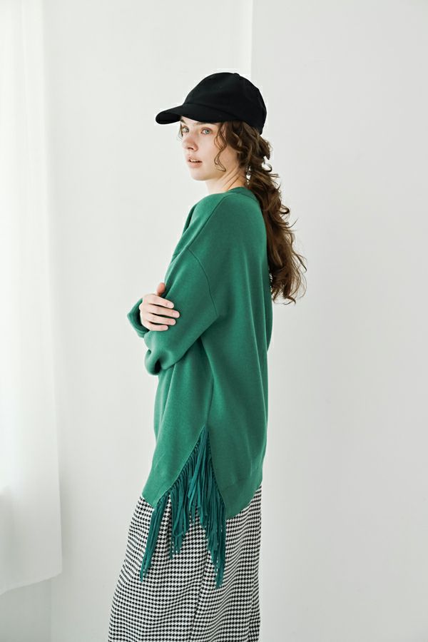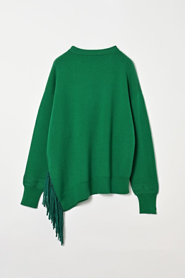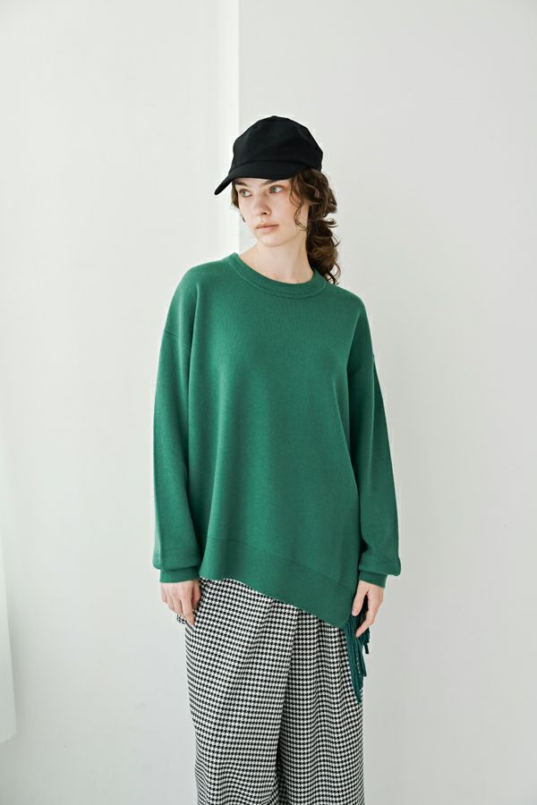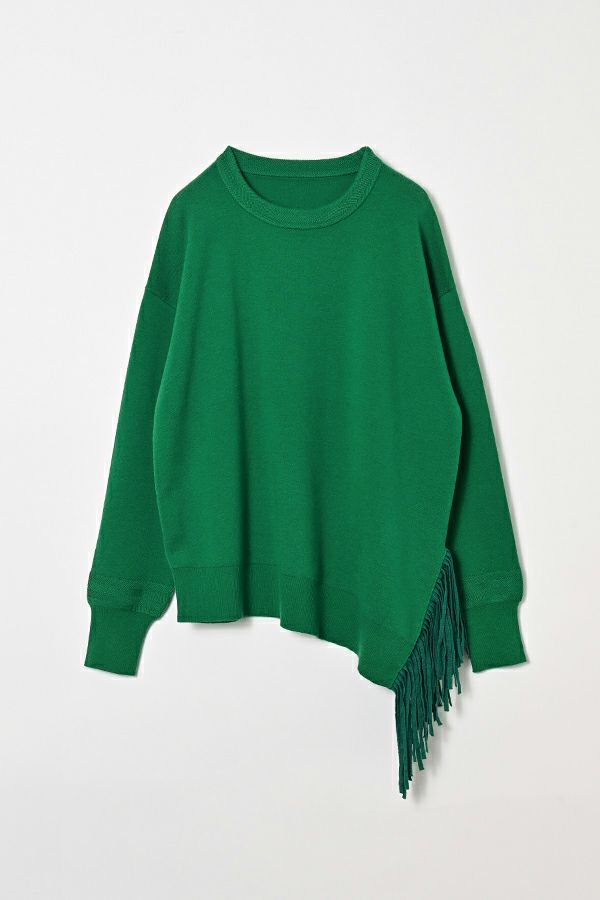 緻密な編地と計算美、纏うだけで品格が宿るニットプルオーバー。 柔らかな肌触りの身頃はスムース編みでスウェットライクなリラックス感がありながらもきれいめな印象に、衿と袖はニットの緻密な柄編みを施して洗練されたデザインに仕上げています。 一見ミニマルながら、計算しつくされたシルエットが特徴です。アシメトリーのカーブ裾ライン、左脇に深めのスリット、そして圧縮ウール糸であしらったテープフリンジまで着用時のスタイルを美しく魅せるデザインに。 一枚着でサマになるので、シンプルデザインのボトム合わせで大人の洗練されたスタイリングが叶う優秀ニットです。