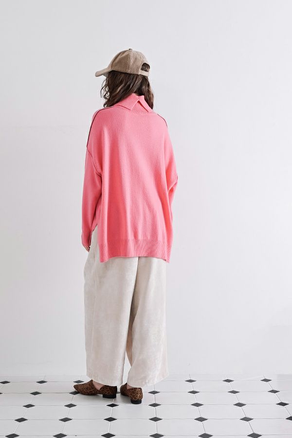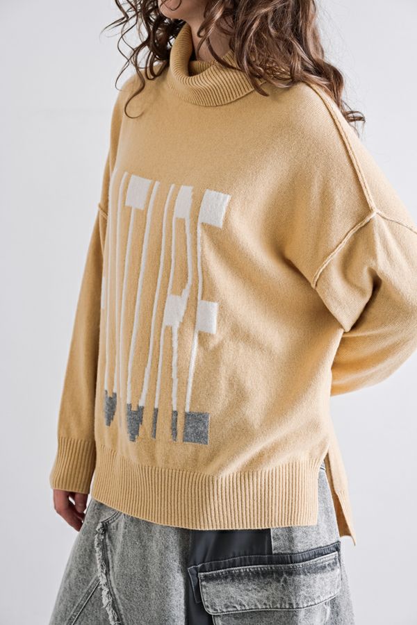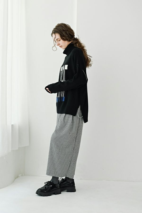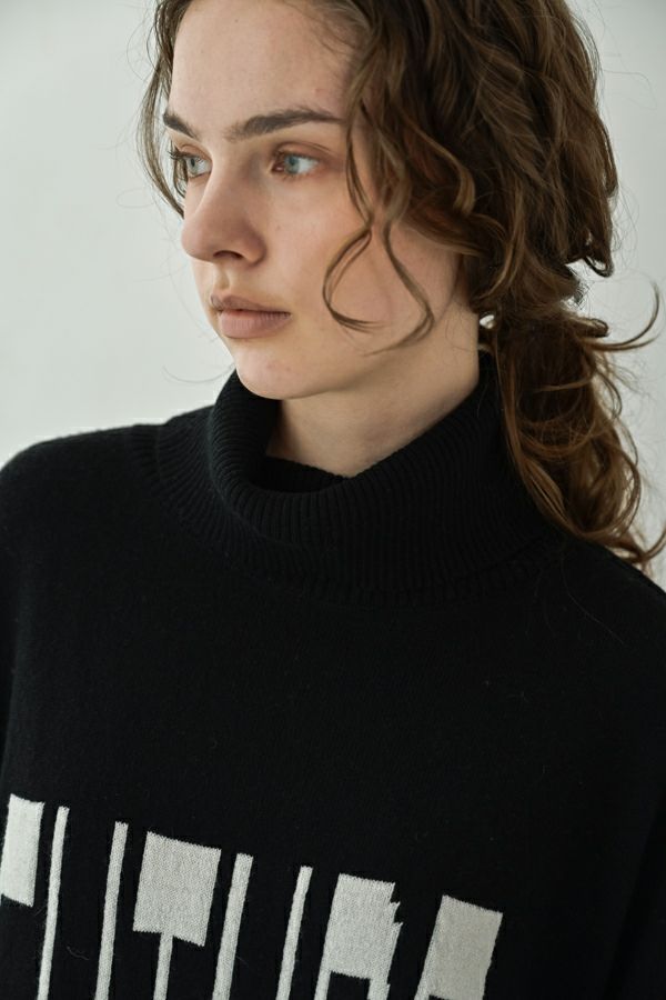 抜け感に、遊び心を。エフォートレスに着映えるロゴニットプルオーバー。 身体のラインを拾わない力の抜けたシルエットが醸し出す大人の余裕に大胆なロゴ使いが目を惹く着映えアイテム。 程よくゆとりのオフタートルはバックスリットを入れて後ろ姿も抜け感をもたせています。肩とアームホールは縫い代を出した配色ステッチが遊びを演出。 スッキリシルエットのボトム合わせでYラインシルエットコーデも良いですし、落ち感ある素材のボトムと合わせてこなれ感漂うスタイリングもお楽しみいただけます。