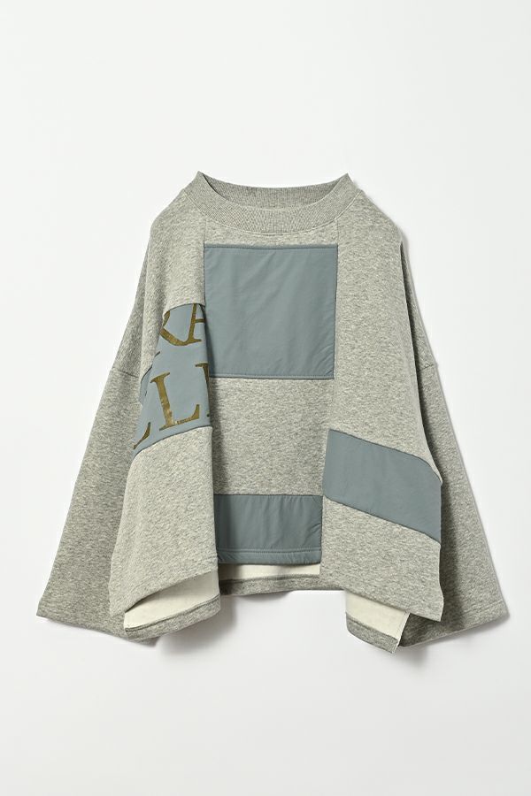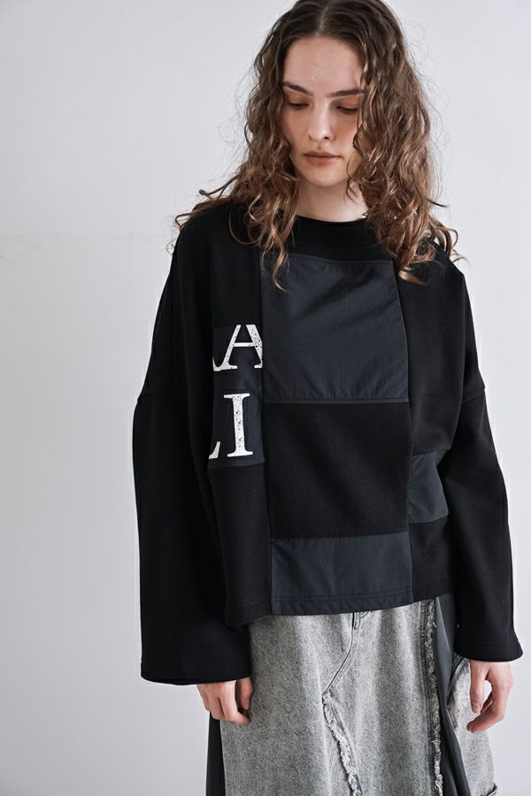 構築的なやわらかさ、モードを纏う大人プルオーバー。 スポンジのような弾力と柔らかいハリ感を備えた素材が、立体的なシルエットをキープ。布帛とカットソーを市松風に切り替えたデザインが、奥行きのある表情をつくります。 右サイドに施したブロック状のパッチワークのひとつには、アンティーク調のロゴをあしらい、さりげないアクセントに。身幅はゆったりとしたビッグシルエットで動きやすく、ヒップラインをさり気なくカバーする丈感。 広めにとったアームホールと袖口は、シャツやブラウスとのレイヤードにも対応し、着こなしの幅を広げます。 抜け感と存在感を両立した、大人のためのモードカジュアルに。