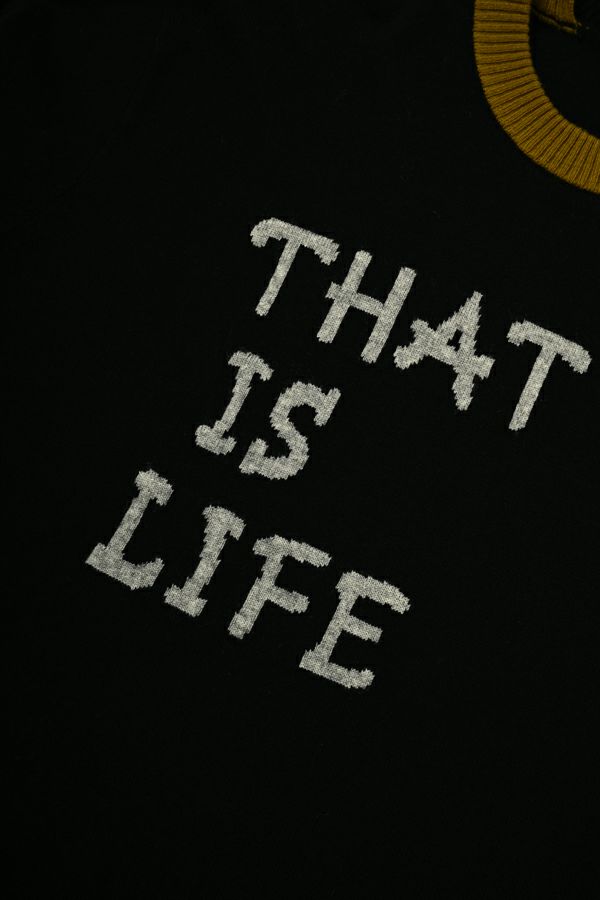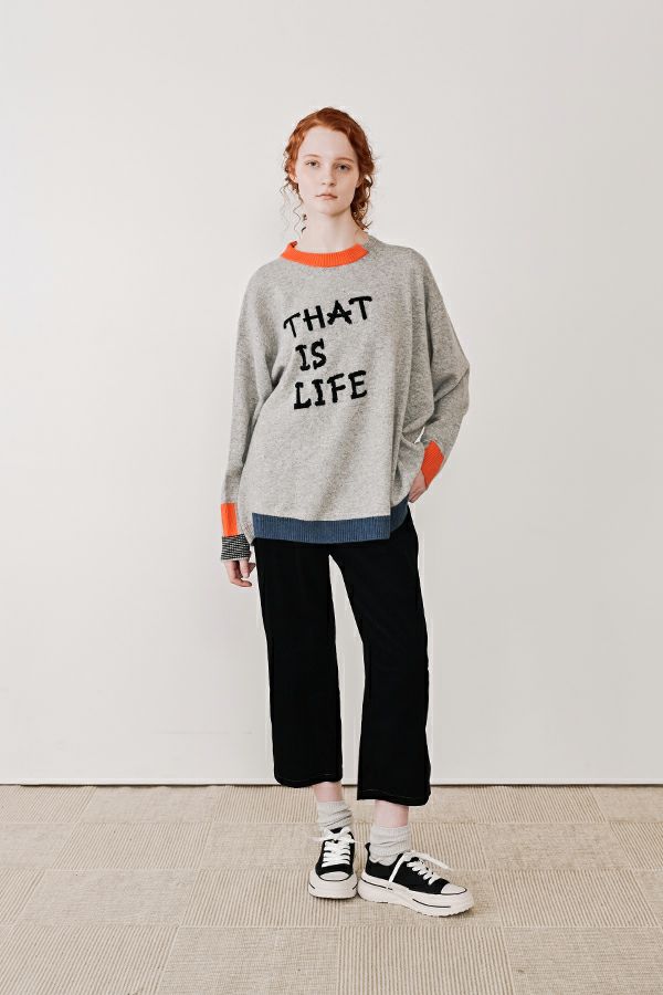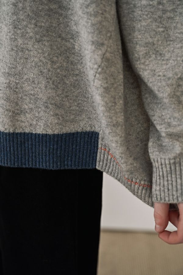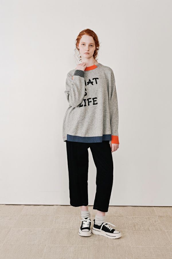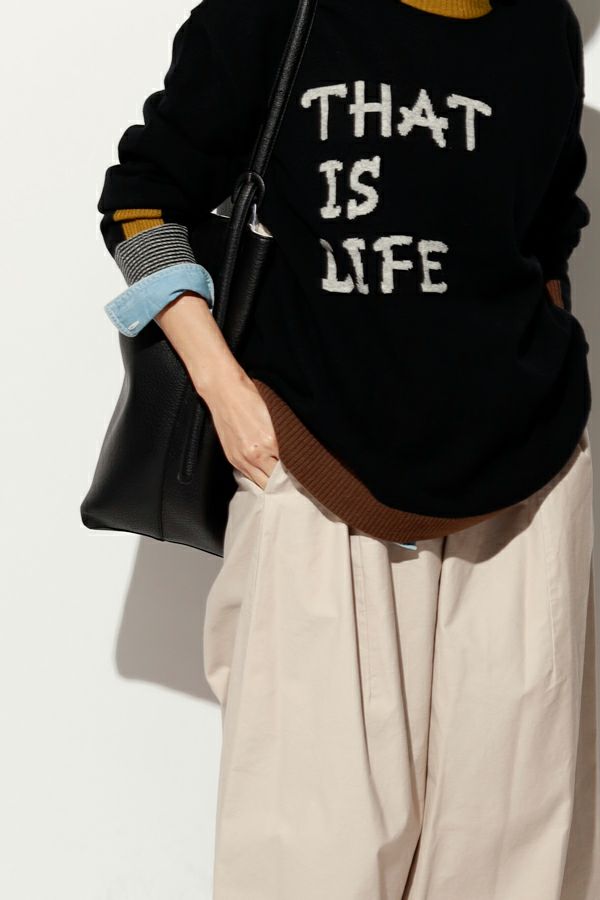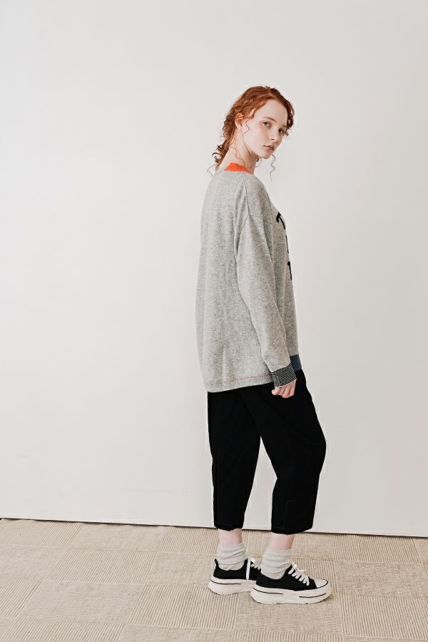 "再構築"が映える、大人のためのアートニット。 衿はリブ丈の違うバイカラーのデザイン編み、アンバランスなポジションのロゴデザイン、袖リブは左右で違うデザインなど、細部にわたり技アリのニットテクニックを贅沢に取り入れた、洗練された一枚。 人とは違う自分だけのスタイルで特別感がありながらも、程よくゆとりのあるシルエットで腰まわりをカバー、ヒップにかかるレングスはサッと纏ってサマになるのも嬉しい優秀ニットです。 絶妙な丈感がボトムを選ばず、パンツにもスカートにも好相性。アートピースのような存在感で、大人のカジュアルスタイルを格上げします。